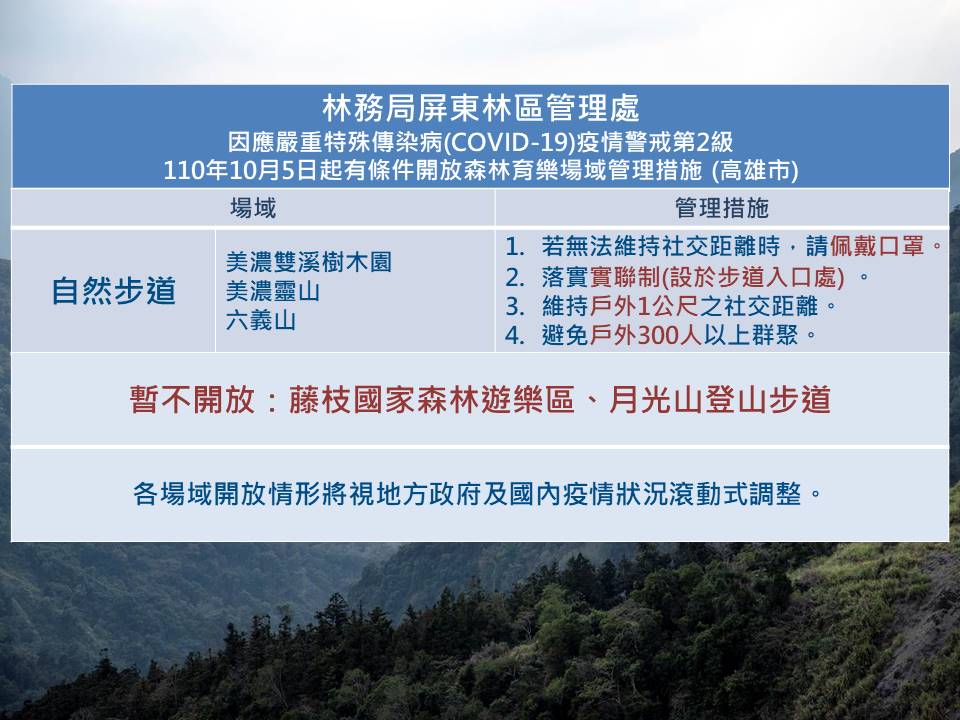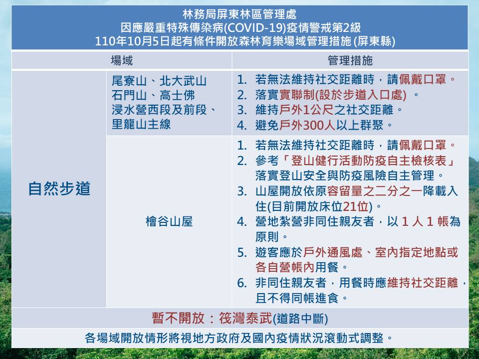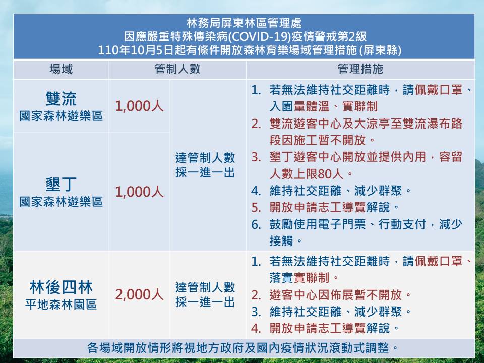 配合中央流行疫情指揮中心宣布鬆綁部分防疫措施,屏東林區管理處自10月5日起國家森林遊樂區入園管制人數由原承載量八成調高至園區最適承載量(墾丁國家森林遊樂區1,000人、雙流國家森林遊樂區1,000人及林後四林平地森林園區2,000人),並調整北大武山檜谷山屋入住人數提高21人,為原住宿量的二分之一,至於營位倘非同住親友者,仍維持以1人1帳為原則。 屏東林區管理處表示,中央流行疫情指揮中心10月3日宣布於山林(含森林遊樂區)空曠處活動可有條件拿下口罩,故遊客於國家森林遊樂區及平地森林園區與自然步道空曠地點,可不佩戴口罩,但應攜帶口罩;倘無法維持安全社交距離時,或於室內場館、山屋室內空間及營帳內有非同住親友者,仍應全程佩戴口罩。 相關森林育樂場域開放情形,會視國內疫情狀況與地方政府最新發布之管制公告內容滾動式調整,請遊客於出發前務必至台灣山林悠遊網(https://recreation.forest.gov.tw/)查詢想去的場域開放情形與人流管制上限,並請大家落實自身健康管理,若身體不適,請避免出遊。
