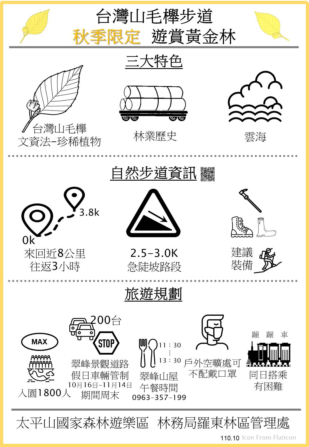 隨著秋天腳步靠近,也是大自然森林轉換面貌的時節,這段時間太平山國家森林遊樂區最讓遊客期待的莫過於台灣山毛櫸葉片換新衣,整片山頭成為金色森林。林務局羅東林區管理處為因應台灣山毛櫸步道旅遊人潮,「翠峰景觀道路」於今(110)年度10月16日~11月14日期間,每逢於每周六、日上午09:00-12:00實施「動態」車輛管制措施,提供200台車輛進入,當滿載時,啟動一出才能一進之管制,以維護翠峰景觀道路的交通安全與順暢。 文資法公告珍稀植物-台灣山毛櫸 在台灣目前依據「文化資產保存法」公告指定為珍貴稀有植物僅有4種,其中一種就是台灣山毛櫸,又稱「台灣水青岡」,是冰河時期孑遺植物,春天吐出新綠、夏日碧綠盎然、秋時黃葉耀金、寒冬葉落枝枯,四季景色迥異,各具風采。台灣山毛櫸僅生長於台灣北部部分偏遠山區,而屬宜蘭縣太平山國家森林遊樂區內的台灣山毛櫸步道能提供民眾方便行走而遊賞到它的迷人景緻,秋天山毛櫸綠葉轉金黃,整片黃金森林漂亮又詩意,也吸引大量遊客慕名而來。 秋季假日實施車輛動態管制措施 由太平山莊通往台灣山毛櫸步道主要動線為「翠峰景觀道路」,其全長16.5公里,路寬約5公尺,道路所在位置鄰近翠峰湖生態保育區,為避免過多車輛進入而影響野生動物棲息,及減少車輛所帶來的環境污染,並顧及行車安全,故自110年10月16日~110年11月14日期間,每逢周六、日的上午9:00-12:00,考量有限的停車空間,循例實施車輛動態總量(200台)管制措施,當進入翠峰經管道路車輛總數達200輛,即不再放行車輛進入翠峰景觀道路,需等待有車駛出,才會再放行,而管制點則設置在翠峰景觀道路0+200k處。為鼓勵高乘載運輸,除九人座小客車、機車、住宿翠峰山屋遊客車輛、公務車輛外,其餘車輛一律不得進入,敬請遊客配合現場管制措施。 太平山防疫措施 配合中央流行疫情指揮中心宣布鬆綁部分防疫措施,自110年10月5日起,入園人數由動態管制調升為1800人,每日開休園時間平日為6:00-18:00,假日為4:00-18:00。在遊樂區內空曠處、自然步道活動可不配戴口罩,惟於無法維持安全社交距離時,或於室內場館,仍應全程配戴口罩,遊樂區防疫措施會視國內疫情狀況與地方政府最新發布之管制公告內容滾動式調整,請遊客於出發前務必至台灣山林悠遊網(https://recreation.forest.gov.tw/)或太平山官網查詢場域開放情形與人流管制上限。 遊客常見提問Q&A *通常幾點翠峰景觀道路會達200台車輛上限? 依據過往紀錄及經驗,若天氣預報晴朗,遊客人潮眾多才有機會約在10-11點間進行管制,因此,不是每個周末車潮都會超過200台。 *一日遊可能走完台灣山毛櫸步道,又坐到蹦蹦車嗎? 這是許多遊客高詢問度的問題!目前蹦蹦車因工程整修,暫停行駛,預計於11月初恢復營運,而蹦蹦車車票都是早上7點開始於蹦蹦車站開賣當日所有班次的車票,秋季一天班次只有8班(7:30首班、14:30末班,期間逢半點發車,每班次至多2列車,共有180個座位,總計1440個座位),因此,若要坐蹦蹦車建議一早排隊購買最晚的班次,衡量自身體力去走台灣山毛櫸步道,再趕回坐蹦蹦車,才有辦法! *平假日、一日遊或二日遊規劃建議 太平山國家森林遊樂區售票站平日6點開園,假日4點開園,而售票站距離台灣山毛櫸步道起點,尚有約39 km (宜專一線22 km +翠峰景觀道路16.8 km),無起霧或塞車情況下,車行時間約70分鐘,考量秋季山區午後容易起霧或下雨,因此建議若要遊賞台灣山毛櫸步道儘量提早入園為宜。相關建議遊程可上太平山官網查詢。 ■溫馨小提醒: 1. 台灣山毛櫸步道長度:單程3.8 km,需原線折返,要走到里程3.4-3.8k路段才可以觀賞到變葉黃金林。 2. 最佳賞葉期:歷年統計約在10月中旬至11月中旬期間為最佳賞葉期,惟今年太平山區低溫期稍有延後,黃葉期有延後的可能,黃葉綠及落葉率會在太平山FB粉專不斷更新。 3. 廁所:步道內無設置公廁,需於行前可至翠峰湖環山步道口的公廁、翠峰山屋如廁。 4. 餐飲:鄰近台灣山毛櫸步道最近的餐廳及販賣部,位於步道口附近的翠峰山屋,餐廳午餐供應時間為11:30-13:30,炒飯套餐;若無法趕上用餐,販賣部也有泡麵及飲品。 5. 紀念品:台灣山毛櫸相關紀念品可於翠峰山屋購買,或是返程於中間服務站販賣部選購(停車步行僅1-3分鐘)。