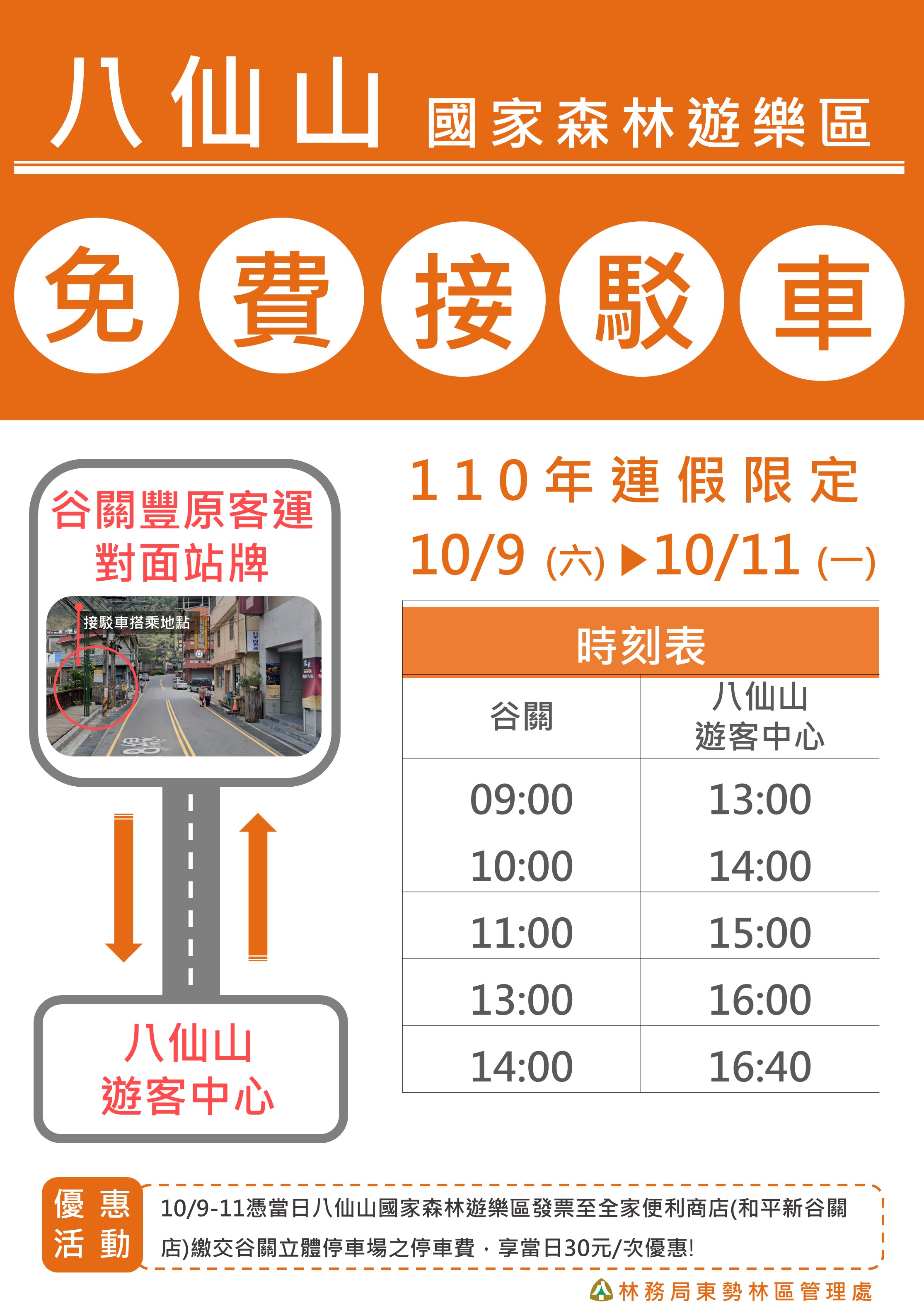 時值秋高氣爽的好天氣,鄰近谷關溫泉區的八仙山國家森林遊樂區是民眾健行享受森林浴的最佳去處。為提供民眾交通需求,輕鬆暢意體驗山林,今年雙十節連假期間,提供免費接駁車服務,歡迎多多利用。 東勢林區管理處表示,免費接駁巴士於10月9日至10月11日上午九點至下午四點四十分,從豐原客運谷關站(明高溫泉養生會館對面)至八仙山收費站,遊客下車購票後即原車接駁至八仙山遊客中心,且持有八仙山國家森林遊樂區入園發票,可於全家便利商店旁之谷關立體停車場享當日30元/次停車費優惠(原價50元/次),輕鬆又划算! 另於10月10日國慶日當天,為讓民眾感受森林多元的生態服務價值,特別舉辦「森林豐盛季」,各式各樣的活動帶著您一起回到八仙山林場時代,體驗林場文化及森林生態之美,現場也有在地小農分享販售當季里山蔬果,當場報名活動更可獲得限量紀念品,歡迎大家攜家帶眷前往同樂。活動報名詳細內容可上「八仙山國家森林遊樂區暨自然教育中心」臉書粉絲專頁查詢,或洽電話04-25950299有專人為您服務。