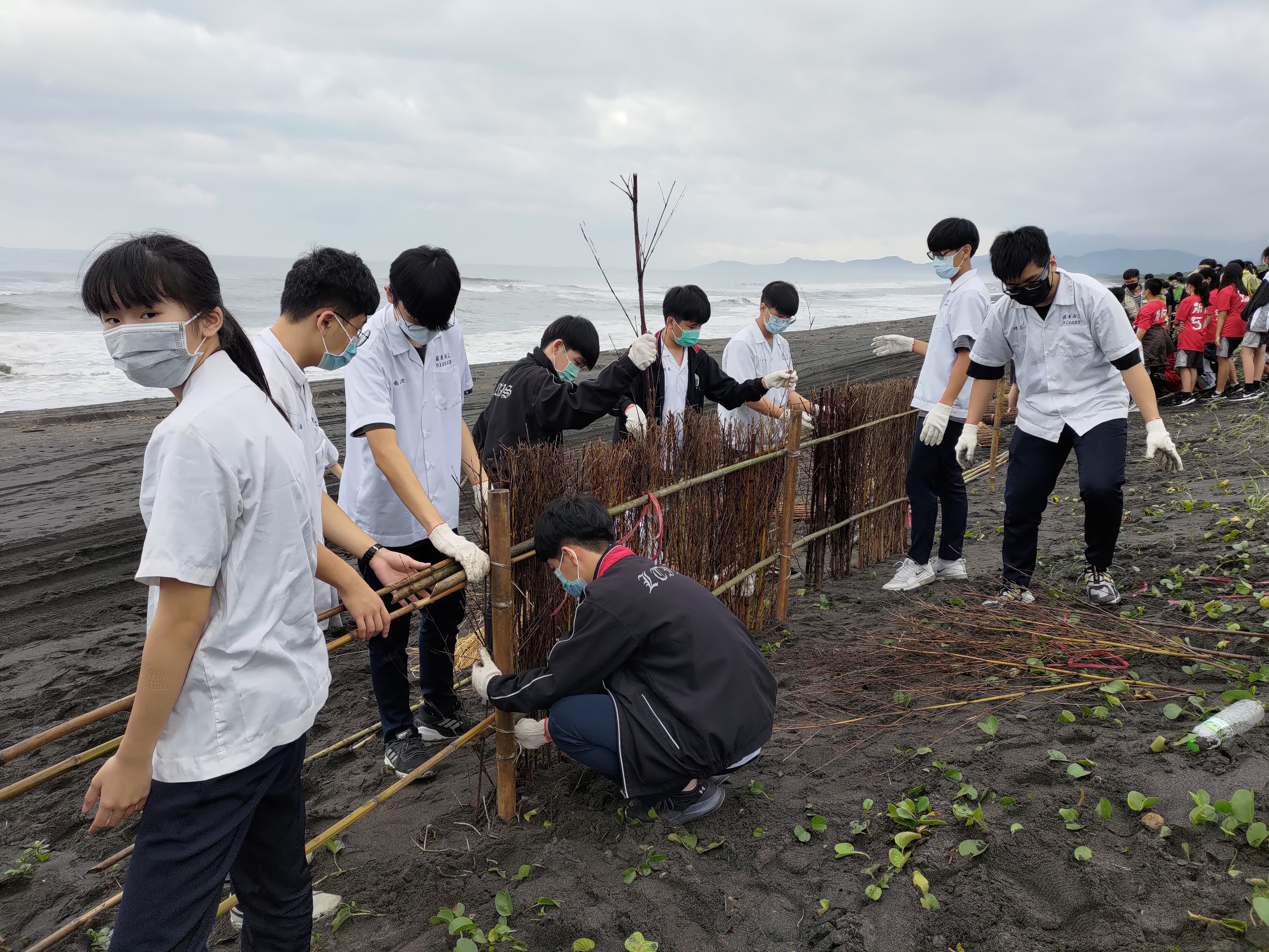 宜蘭冬季強勁的東北季風帶來嚴重的飛砂問題和海浪的嚴重侵蝕,使得海岸沿線聚落居民身受其害,林務局羅東林區管理處長期於海岸第一線植樹造林,築起綠色廊帶並保護內陸居民生命財產安全,為讓大眾膫解堆砂籬與海岸保安林的關係,林務局羅東林區管理處於110年10月27日以及11月10日兩天的上午,邀請宜蘭高中、羅東高中、羅東高商、羅東高工、羅東國中、國華國中、壯圍國中,共7所學校300位師生於五結鄉沿海海岸合力搭建長150公尺的堆砂籬活動。 由羅東林管處的自然教育中心環境講師帶領學生踏查宜蘭沿海的海岸植物生態,並藉由實地觀察了解保安林的形成與其產生的公益功能,讓學生們了解在海邊惡劣的環境下營造保安林實屬不易,需先施作堆砂籬,加以防風定砂,才能植樹造林並加以撫育成林。活動最後讓學生們以自然素材竹竿與竹樁搭起堆砂籬,沿著海岸線形成一道長長的防護網,以實際行動,幫助保安林成長茁壯,為家鄉環境付出一份努力。