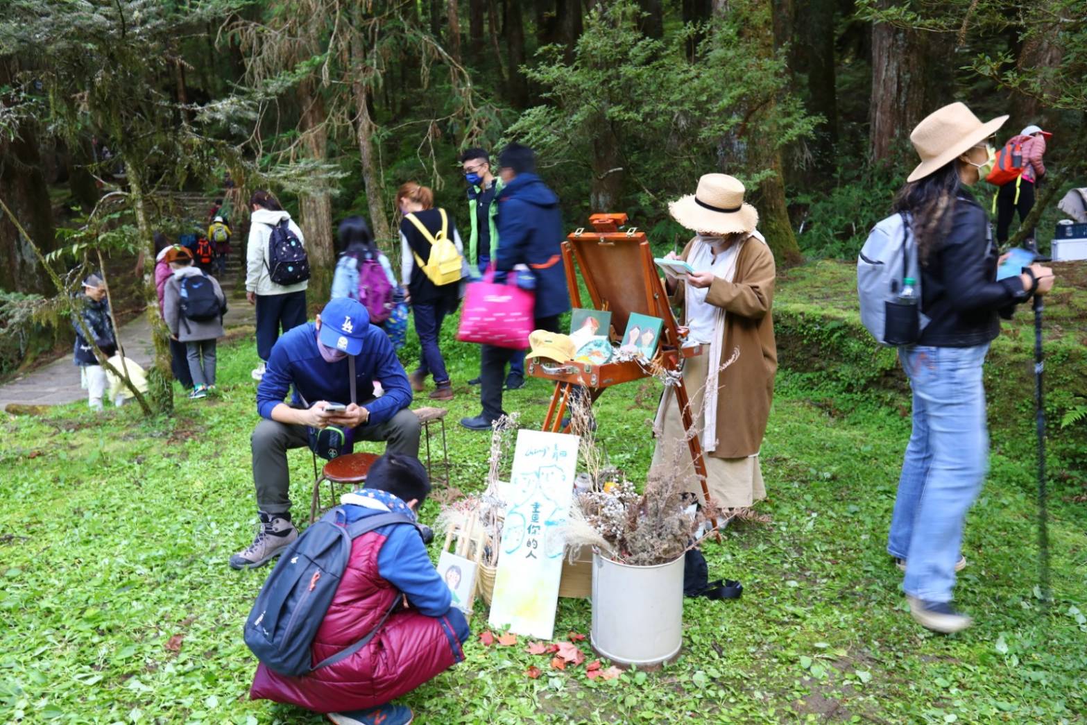 今日登場的「小森一點」森林市集,由今年曾策劃台南漁光島「草木森花之市」的規劃團隊「草木」共同籌備,風格品牌一齊集結上山出攤、進駐森林,包含節氣茶席「有時甘杯」、創作首飾「München猛懸手作金工」、羊毛氈手作「tiger milk」、自製天然精油藥草蠟燭「火星森」等等特色攤位,把城市日常體驗移至阿里山,讓遊客感受沒有距離感的森林。開幕日彩繪展演,插畫家(y.zhen深夜日常)現場彩繪,在開放空間的創作,大大吸引路過遊客的目光,讓大家駐足目不轉睛的欣賞藝術創作的過程,如何一筆一筆從簡單的線條變成有故事的畫作。