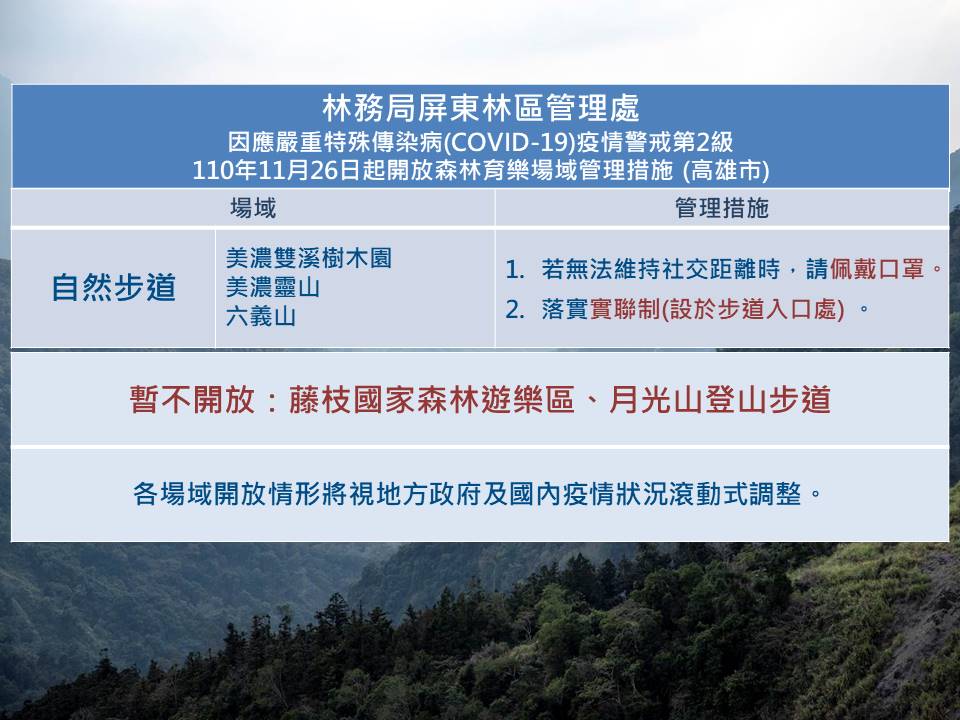 屏東林區管理處配合中央流行疫情指揮中心循序漸進調整相關戶外活動及公共場域人流控管措施,自11月26日起,本處所屬檜谷山屋及周邊營地,恢復原有開放住宿量。 屏東林區管理處提醒民眾,依據中央流行疫情指揮中心發布指引,目前遊客於國家森林遊樂區與自然步道空曠地點可不佩戴口罩,惟若無法維持安全社交距離時,或於室內場館、山屋室內空間及營帳內有非同住親友者,仍應全程佩戴口罩。 另外,倘屬指揮中心公告之居家隔離、居家檢疫及自主健康管理之人員,以及上山隊伍成員若有發燒、呼吸道不適或嚴重咳嗽者等症狀,應避免申請上山及入住山屋;入住人員應於戶外通風處、室內指定地點或各自營帳內用餐,落實登山安全與防疫風險自主管理。 近期寒流來襲天氣變化較大,請民眾上山親近山林前,記得提前做好登山規劃及裝備整備。進入山林後也請民眾一起遵守無痕山林原則,守護美好的山林。 屏東林區管理處各森林育樂場域開放情形,會視國內疫情狀況與地方政府最新發布之管制公告內容滾動式調整,籲請民眾出發前務必至台灣山林悠遊網(https://recreation.forest.gov.tw/)查詢場域最新開放情形。