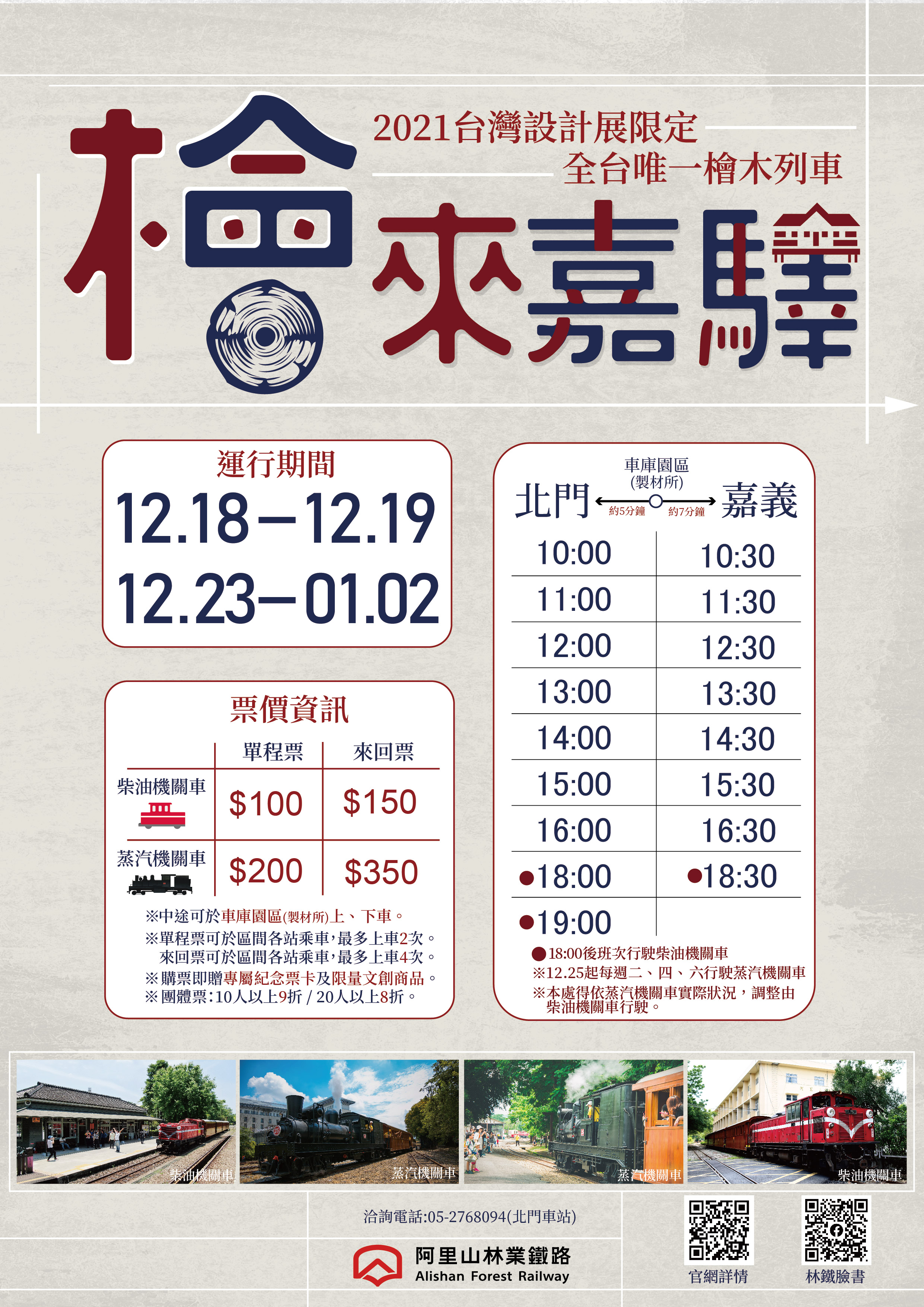 2021台灣設計展將在嘉義市盛大舉行,林務局阿里山林業鐵路及文化資產管理處特別在展覽期間,每日以SL-25蒸汽機車或柴油機車附掛檜木車廂開行「檜來嘉驛」檜木列車,行駛嘉義站及北門站區間,中途停靠車庫園區(製材所展區),串連嘉義文創園區、嘉義火車站、製材所、車庫園區、北門驛、檜意森活村等熱門景點,歡迎旅客以最優雅的方式品味台灣設計展。 林鐵瑰寶盡在「檜來嘉驛」 檜木列車仿造1925年日本皇室專用貴賓車,是全球唯一以台灣檜木打造的珍貴車廂,Shay SL-25蒸汽機車距今已超過100年歷史,僅有特殊活動或節慶行駛。本次設計展期間的週二、四、六(12月25日、12月28日、12月30日、1月1日,共4日)特別行駛蒸汽機車,讓旅客親身體驗國寶列車,機會難得! 該列車均加碼行駛隱藏版「車庫線」,可近距離觀賞Shay型蒸汽機車的直立式汽缸、傘形齒輪設計,都是火車史上的經典工藝;再經過昔日中興號柴油機關車調頭轉向使用的轉車台,如今依然保存完善。另外還能看到林鐵專屬的洗車台,旅客可上下車參觀車庫園區林鐵珍貴車輛,及嘉義製材所《百年鳴森》、《記憶・阿里山—阿里山林業暨鐵道特展》、《構竹林鐵》等特展。 設計展限定專屬車票及商品 「檜來嘉驛」檜木列車蒸汽機車單程票價200元、來回票350元;柴油機車單程票價100元、來回票150元,10人以上團體享有9折,20人以上團體享有8折購票優惠。旅客可於嘉義站、車庫園區(製材所展區)、北門站購票及乘車,單程票最多可上車2次,來回票最多可上車4次,票價含設計展限定紀念車票,並贈送專屬仿藍晒圖小尺、長形書籤、SL-25銜牌檜木手抄紙等文創商品,歡迎旅客把握難得收藏機會。活動資訊可至林鐵及文資處官網(https://afrch.forest.gov.tw),或FB粉絲團(https://www.facebook.com/AlishanForestRailway.Taiwan)查詢。