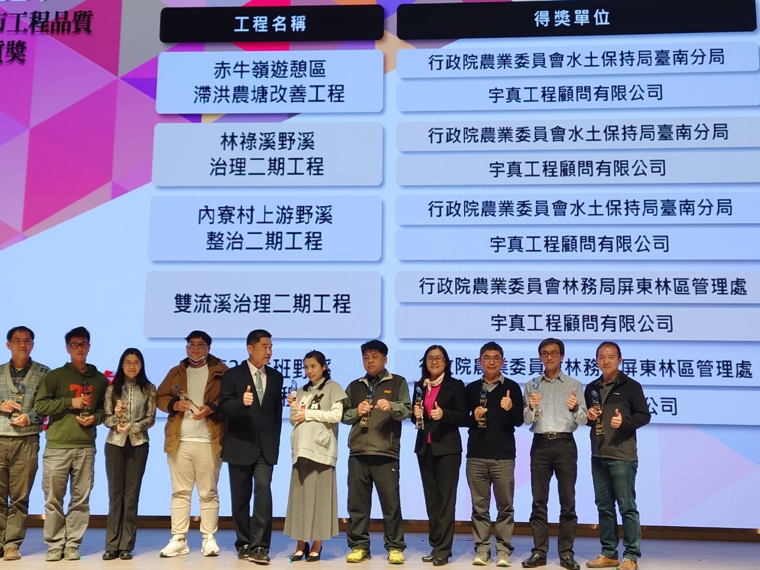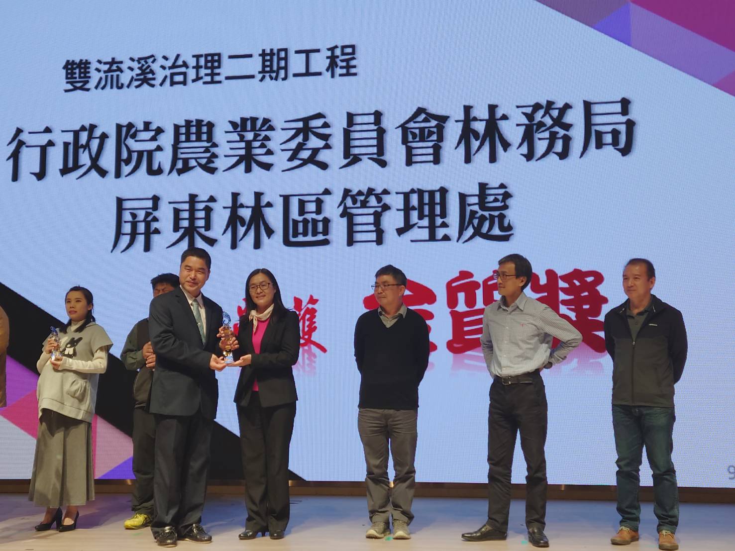 屏東林區管理處參加高雄市結構工程工業技師公會、高雄市土木技師公會及社團法人高雄市建築師公會聯合高舉辦的「2021城市工程品質金質獎」第七屆評鑑,榮獲水利工程類「雙流溪治理二期工程」、「恆春39林班野溪治理工程」、「草坔坑溝土砂防治工程」、「旗山63林班坑溝土砂防治工程」及「大梅溪及支流野溪治理三期工程」計四優等一佳作殊榮,29日由屏東林管處處長楊瑞芬率領治山課課長林彥志及承辦陳錦農參加頒獎典禮,另設計監造單位勇霖工程顧問公司技師吳重君、宇真工程顧問公司技師吳文靖也一起領獎。 屏東林管處指出,所施作的工程特色為採安全與生態並重之生態工法進行設計,將災害控制、植生綠化與營造生態環境納入目標,設計階段邀請工程、生態專家、NGO會同勘查及審圖,落實公民參與精神,配合因地制宜工法,除就地取用現地塊石作為護岸材料,不三面光創造多樣性生物利用棲地,減少混凝土使用量,發揮節能減碳功效,於施工階段落實三級品質管理,確保工程品質,於完工後能達成防災減災治理成效,並兼具生態保育效益,獲得委員一致肯定。 屏東林管處表示,未來將持續精進治理工法,實行公民參與精神,達到治理兼具生態保育的目標,期許為環境永續經營邁進。