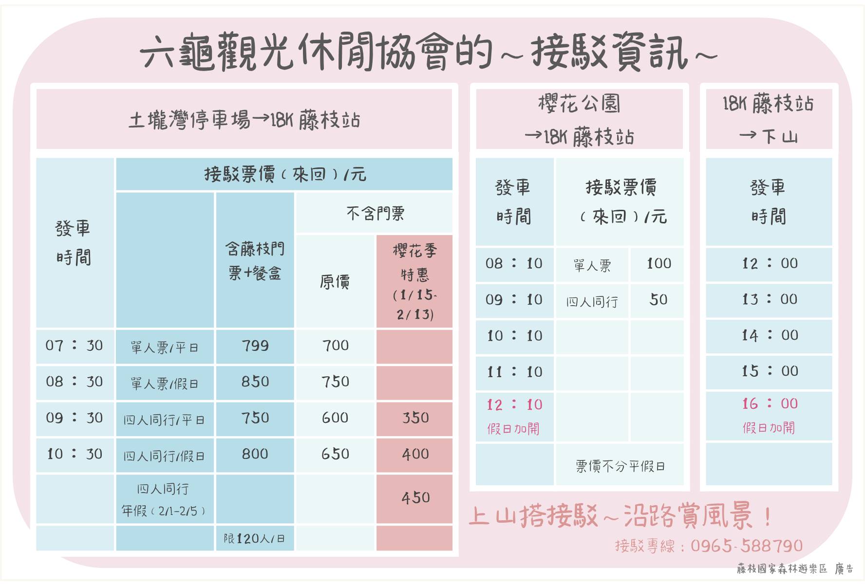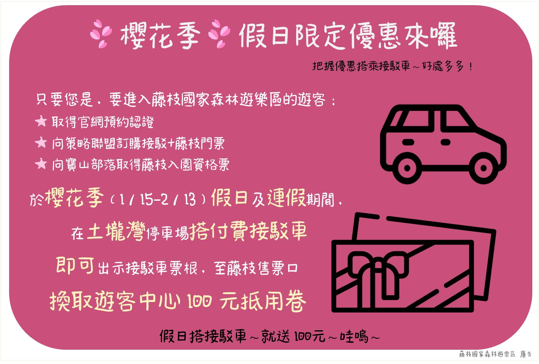 高雄市桃源區公所舉辦的櫻花季活動,將在111年1月15日於寶山櫻花公園盛大開幕,為此藤枝國家森林遊樂區特別推出接駁優惠活動,在111年1月15日至2月15日櫻花季的期間的假日,搭乘接駁車者並入園者,即可獲得100元園區消費抵用卷1張。平日由六龜土壠灣至櫻花公園,來回接駁費用最低更只需要350元,歡迎前來賞櫻的民眾能多加運用,輕鬆賞花還可享優惠。 寶山櫻花公園的櫻花季活動即將在111年1月15日盛大開幕,園區內的河津櫻以及山櫻花都已陸續盛開,上山賞櫻的遊客絡繹不絕。因山上停車空間有限,到了假日更是一位難求。為解決停車問題,高雄市桃源區公所與屏東林區管理處共同推出賞櫻接駁服務。平日由六龜土壠灣搭乘接駁車至櫻花公園,來回36公里的路程最低只要350元(假日接駁最低450元)。另外,假日搭乘接駁車到藤枝國家森林遊樂區的遊客們,憑接駁票卷及入園門票,更可獲得區內遊客中心100元消費抵用卷。 屏東林區管理處貼心提醒,因藤枝聯外道路18公里以上路段仍有工程進行,因此需由林下步道步行1公里才抵達園區,且中海拔山區氣候多變,請評估身體狀況並挑選適合於山區活動的裝備。 園區採預約入園制,每日中午12時整開放15日後之300位遊客入園預約申請(預約網站:https://tj.forest.gov.tw/),憑每個身份證字號可預約5位入園名額;接駁遊程120位及80位部落遊程,可洽高雄市六龜觀光休閒協會(0965-588790;預約系統網址:https://www.liugui.org.tw/)及寶山社區發展協會(柯樹山理事長0912-133049)。 有關藤枝國家森林遊樂區相關資訊,將隨時更新於台灣山林悠遊網、屏東林區管理處官網及「林務局屏東林區管理處」臉書粉絲專頁、「藤枝國家森林遊樂區」臉書粉絲專頁。