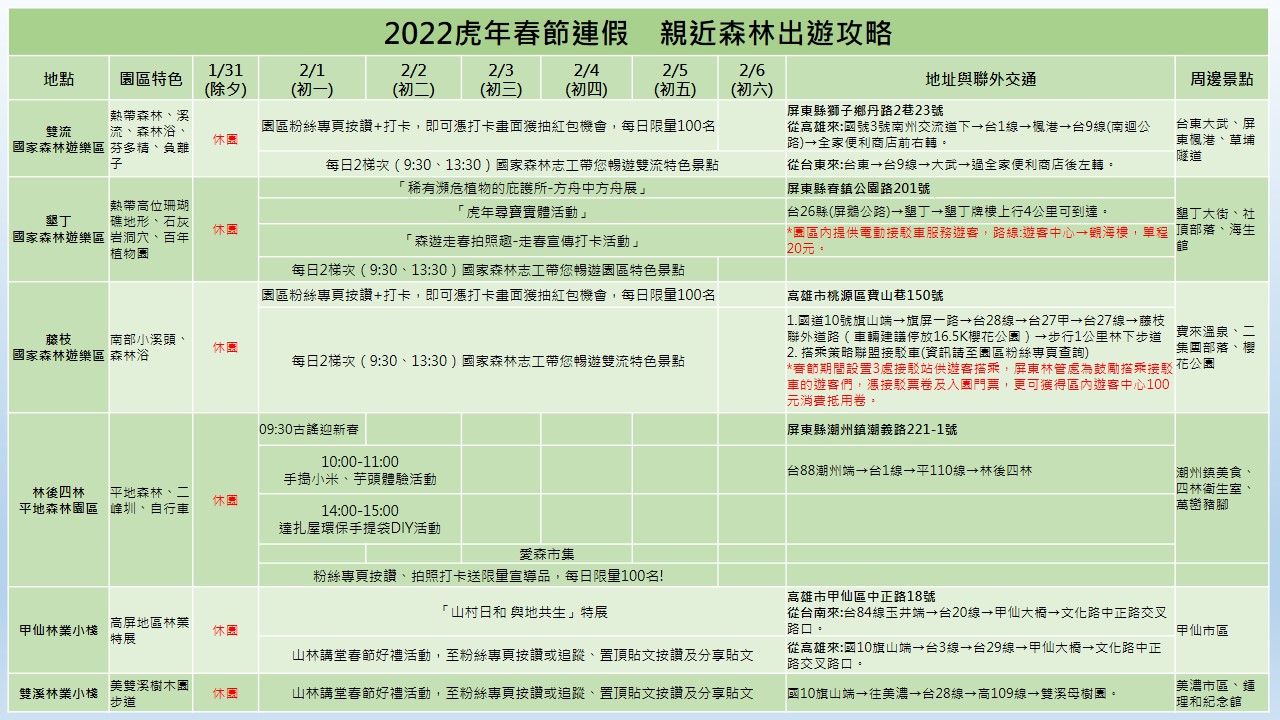 迎虎年春節九天連假決定去哪玩嗎?屏東林區管理處轄屬墾丁、 雙流、藤枝國家森林遊樂區及林後四林平地森林園區,僅除夕(1月31日)當日休園1天,從初一到初六每日8時至17時服務不打烊照常營運,每個場域推出多樣的DIY活動、園區導覽解說服務、粉絲專頁按讚、拍照打卡送限量宣導等,各項活動等您來體驗喔,歡迎喜愛大自然的朋友來享受森林的服務喔,讓你虎年健康平安好事來。 活動攻略看這裡,我們的森林等你來,墾丁國家森林遊樂區推出「虎年尋寶實體活動」、「森遊走春拍照趣-走春宣傳打卡活動」及「稀有瀕危植物的庇護所-方舟中方舟展」。雙流及藤枝國家森林遊樂區有「粉絲專頁按讚、打卡,即可憑打卡畫面獲抽紅包機會」。林後四林平地森林園區安排鄰近山村來義及萬安部落演出「古謠迎新春」、「手搗小米、芋頭體驗活動」、「達扎屋環保手提袋DIY活動」、「粉絲專頁按讚、拍照打卡送限量宣導品」、「愛森市集」等。;此外,每個園區每日有2場次「免費園區導覽解說服務」,由國家森林志工帶領大家更深入瞭解園區景觀、歷史等特色。 除了森林遊樂區及平地森林園區外,春節期間前往甲仙林業小棧參觀「山村日和 與地共生」特展,或是到雙溪林業小棧逛逛,走上一段雙溪樹木園步道進行森呼吸,再拿起手機完成粉絲專頁按讚或追蹤等,即可領取好禮1份喔! 春節期間為緩解藤枝國家森林遊樂區聯外道路車流量及停車空間不足的問題,設置3處接駁站供遊客搭乘,屏東林管處為鼓勵搭乘接駁車的遊客們,憑接駁票卷及入園門票,更可獲得區內遊客中心100元消費抵用卷;墾丁森林遊樂區亦增設低碳電動遊園車供遊客搭乘,此外,各國家森林園區還有電子購票優惠(全票)買一送一喔。 屏東林管處特別邀約大家,春節連假期間走入森林,也貼心提醒民眾配合衛服部疾管署,戶外空間請保持安全社交距離,進入遊客中心等室內空間應佩戴口罩,共同為防疫安全奉獻心力。各場域相關活動資訊,請至林務局屏東林區管理處粉絲專頁查詢:https://www.facebook.com/pingtung.forest.gov.tw。