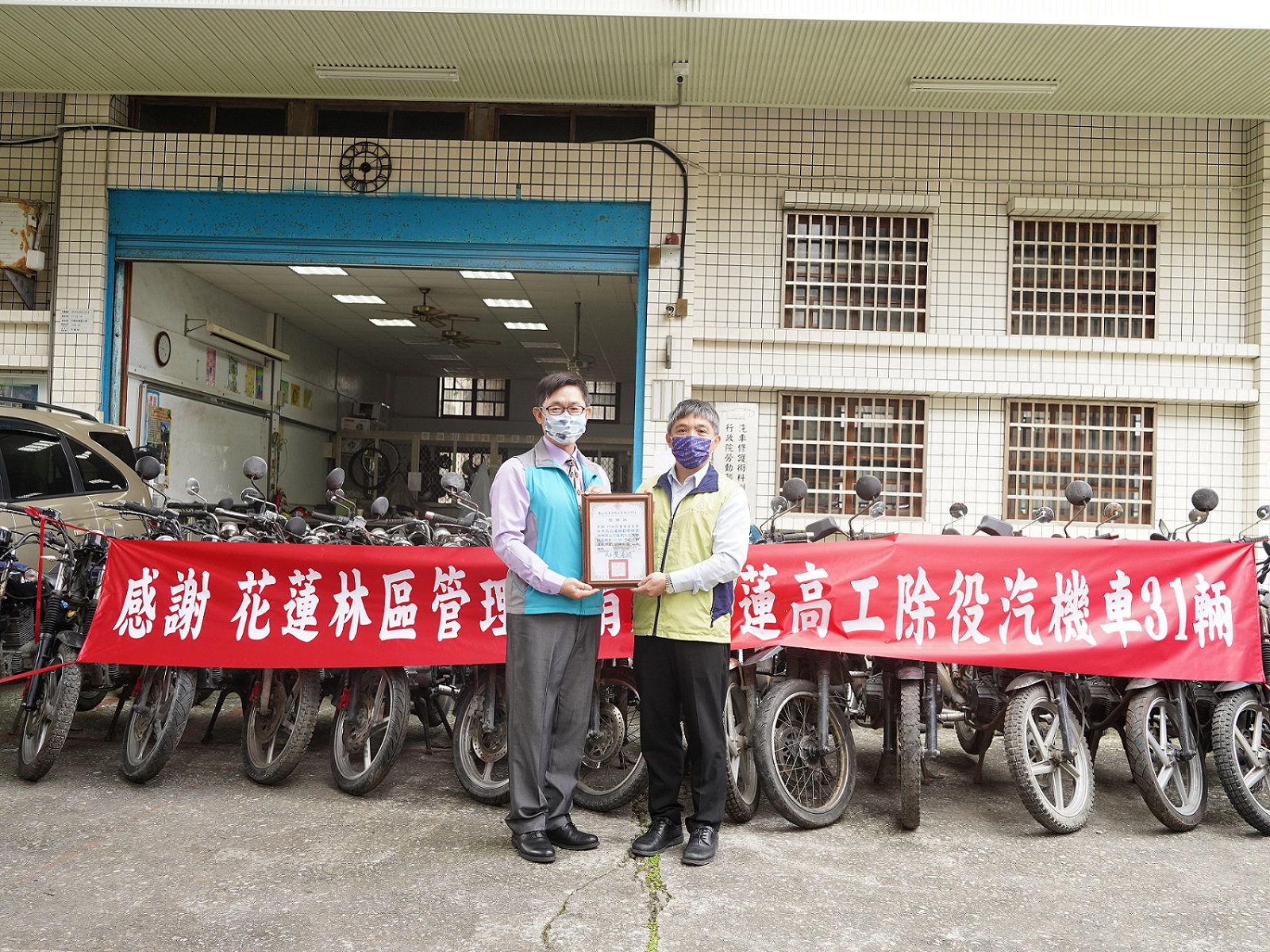 花蓮林區管理處今(10)日將森林護管員第一線退役下來的30部機車、1輛汽車轉贈予國立花蓮高級工業學校汽車科,讓這批長期陪伴護管員穿梭林野的野狼打檔機車夥伴,能充分發揮剩餘價值,繼續造福花蓮地區學子。 車身上滿布坑坑疤疤的凹痕,縱橫山林,走過山林碎石泥濘道路及峭壁山崖的記憶痕跡,紀錄下護管員每日巡護國有林保安林及守護山林的日常。林管處自106年起將汰換的汽機車轉贈 該校,做為汽車科實習教學課程使用,也提供花蓮縣國中技藝競賽及機車丙級考場檢定,讓報廢車輛重啟新的運用價值。 林管處長黃群策表示,平日陪伴森林護管員守護山林的野狼機車,在功成身退後還能化身大愛發揮效益轉贈花蓮高工實習拆解課程使用,在守護森林資源及生態保育的使命下,也能為花蓮教育資源盡一份心力。 花蓮高工校長黃鴻穎代表受贈時表示,技術型學校常面臨教育資源不足的問題,花蓮地區選讀汽車科的學子多以就業為取向,感謝林管處多年來持續捐贈退役車輛,提升該校汽車科教學品質,提升專業技能,期盼學子們在優良的學習環境下成長卓越,創造佳績。