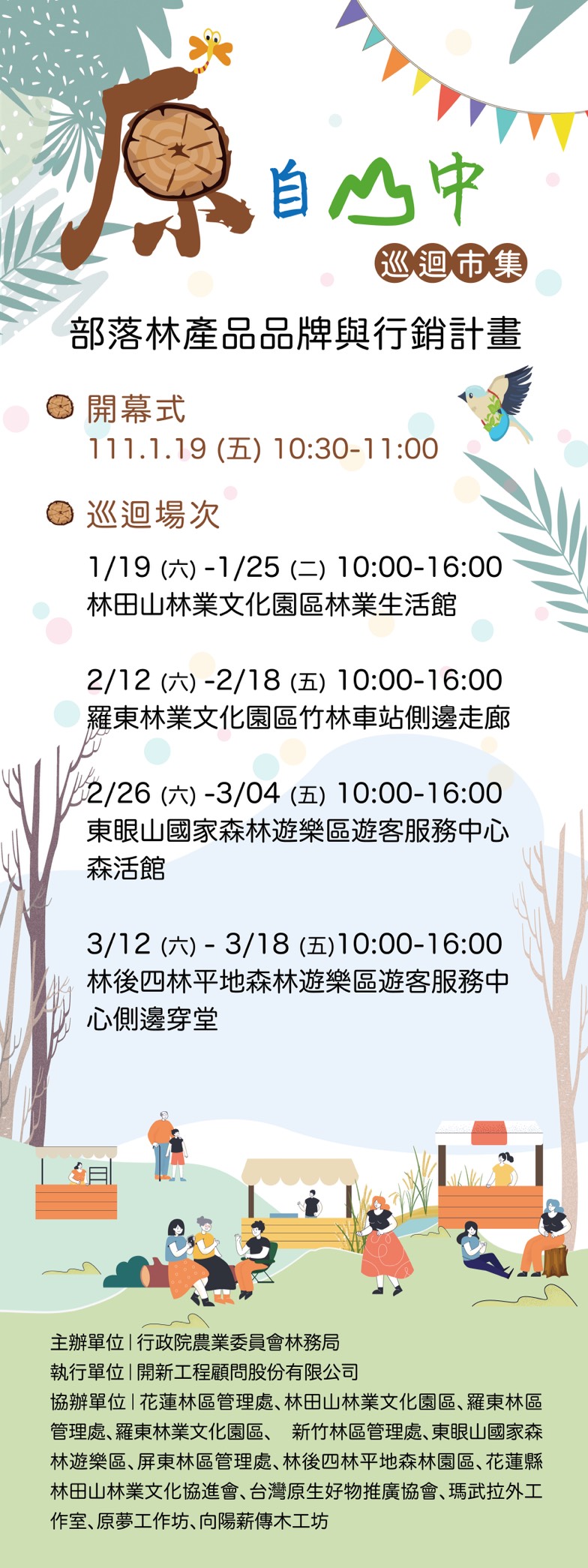 林務局舉辦「原自山中」巡迴活動,第2站自2月12日至2月18日止來到羅東林業文化園區的竹林車站周邊展出。 原住民族與臺灣山林有著密不可分的關係,發展出豐富的傳統山林智慧,為拉近部落林產品與民眾的距離,林務局表示,自109年度起推動「部落林產品品牌建立與行銷計畫」,協助部落團體利用森林主、副產物製成林產品,建立品牌、開拓通路,寄予提振山村經濟的厚望。透過這個計畫陪伴部落團隊,為有市場潛力的部落林產品建立品牌,拍攝林產品與文化形象影片,更規劃了市集與巡迴展售會協助銷售,並協助上架網路銷售平臺,拓展商機。 活動現場集結花東部落產出之優質林產製品,包括臺灣原生好物推廣協會色彩質地迷人的植物染構樹皮花、樹皮衣造型燈罩;瑪武拉外工作室、原夢工作坊的八角星風箏造形鑰匙圈、黃藤與太巴塱陶珠製成的耳環、黃藤側背包;向陽薪傳木工坊的防霉防潮國產材沙拉盆等,並搭配特定體驗活動,活動時間2月12日(六)至2月18日(五)上午10點~下午4點。每個林產品都是來自大自然中的一環,內含永續利用的智慧,歡迎喜歡部落林產品與個性手工創作的民眾前來參觀同樂。