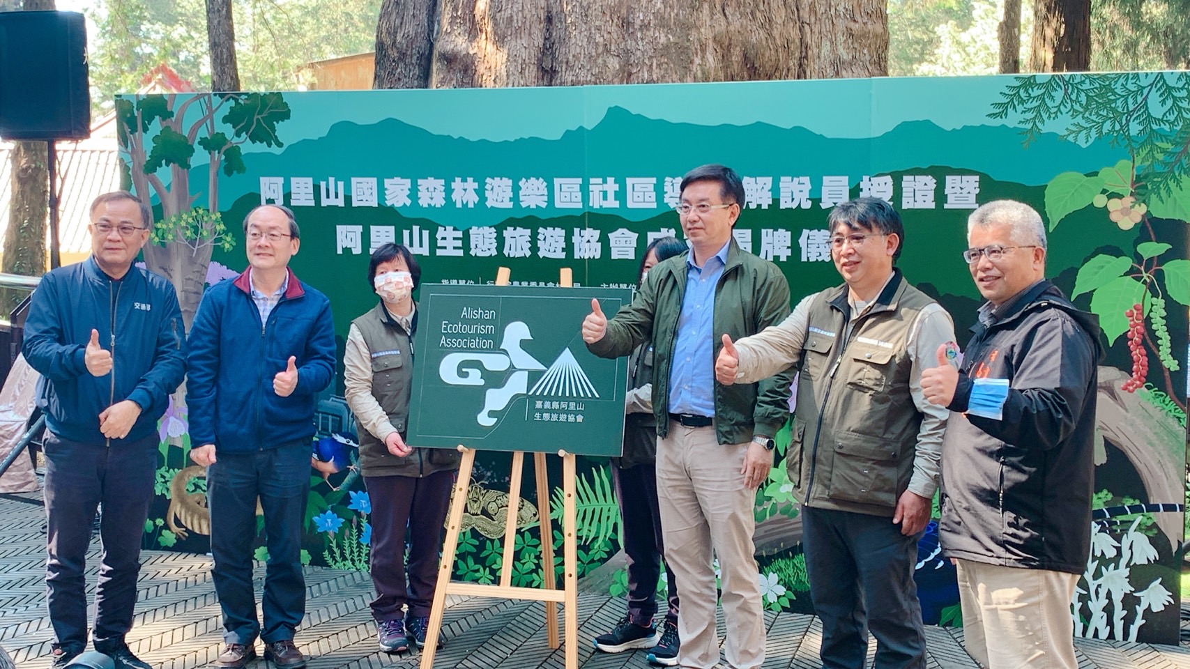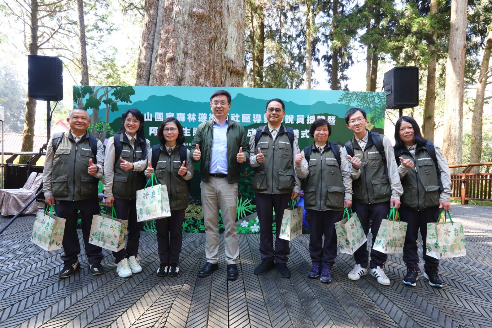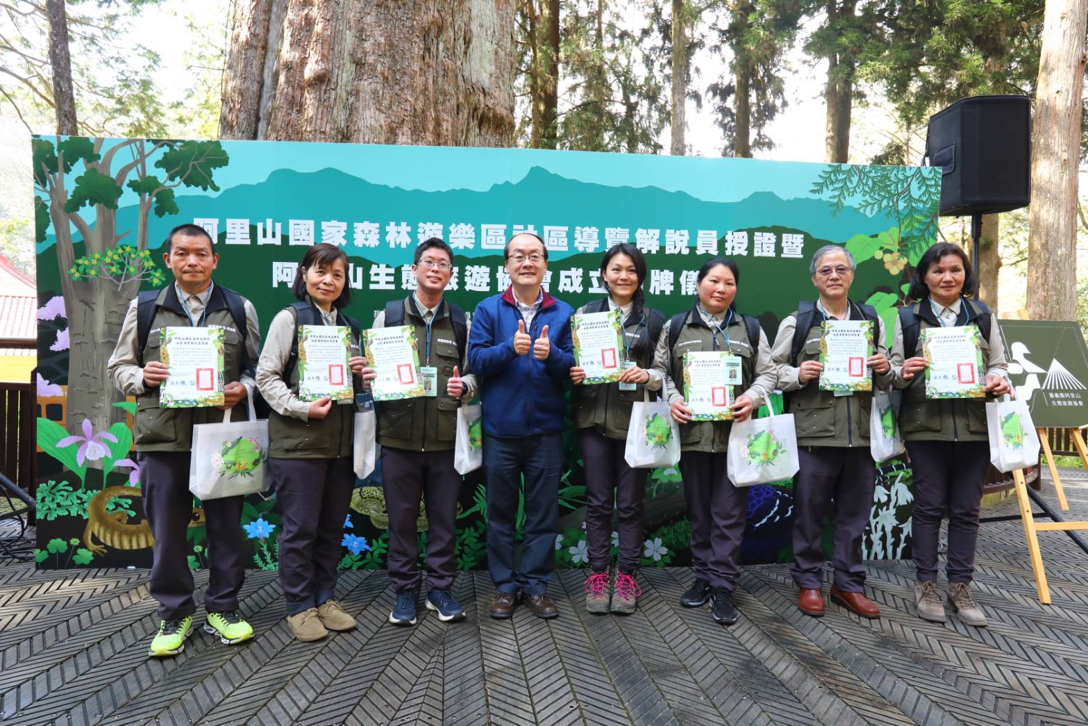 林務局嘉義林區管理處輔導的阿里山社區導覽解說員由在地居民組成,在歷經2年長期緊密培訓及多次實地演練後,今(2)日於阿里山國家森林遊樂區香林神木劇場舉辦「社區導覽解說員授證」暨「阿里山生態旅遊協會」成立揭牌儀式,正式宣告阿里山社區在地導覽解說員成軍,儀式中特別邀請林務局局長林華慶蒞臨見證,更預告將在5月服務正式上線,屆時歡迎遊客蒞臨體驗解說員深厚的解說功力,感受真正道地的解說導覽服務!