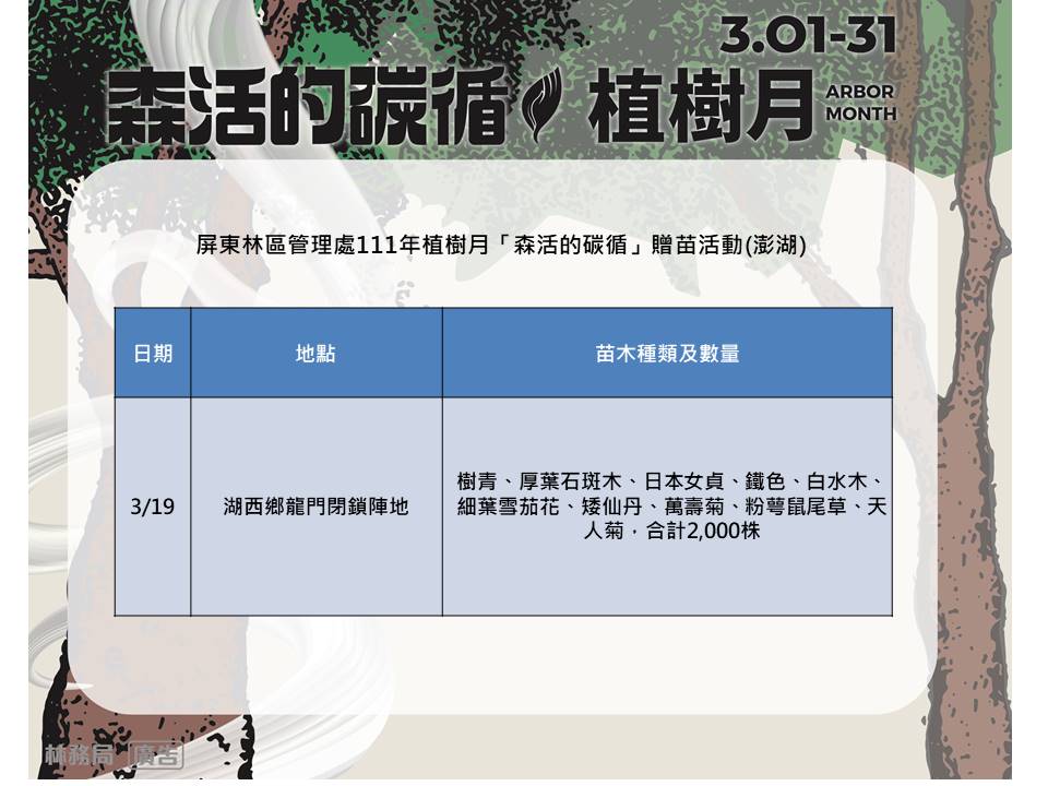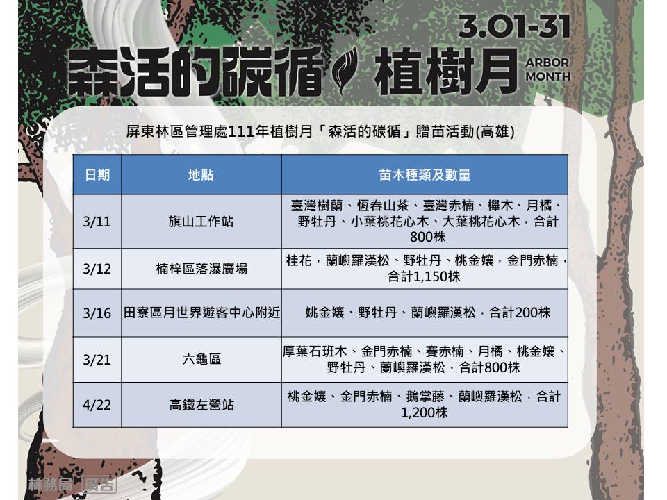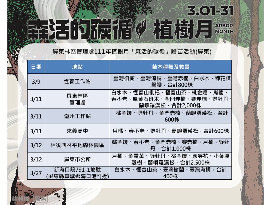 3月植樹月已來臨,屏東林區管理處將在3月9、11、12、16、19、21、27日及4月22日在高雄、屏東、澎湖地區辦理多場贈苗活動,地點除屏東林管處辦公室及轄屬恆春、旗山、潮州工作站與林後四林平地森林園區外,更結合屏東縣政府、高雄巿政府、澎湖縣政府、屏東巿公所、來義鄉公所、扶輪社等機關團體合辦贈苗活動,合計13場14,000株的苗木,不僅場次較去年增加、數量也多了1萬株、苗木種類更多元,歡迎民眾選擇就近的地點前往領取樹苗,一起植樹減碳愛地球。 針對COP26聯合國氣候變遷大會達成延緩危險氣候變化的協議,「減碳」已成全球目標,而為促進全球溫室氣體減排,碳交易與碳費機制已是國際趨勢,歐盟更規劃於2023年實施「碳關稅」。由於植樹造林有助於吸存大氣中的二氧化碳,為因應全球氣候變遷,並善盡國際社會責任, 111年植樹月活動以「碳吸存」為主軸,以「森活的碳循」為標語,凸顯森林對環境永續及減碳重要性。 除「減碳」外,為減少地球環境中的塑膠污染,「減塑」已是刻不容緩的行動,因此,屏東林管處今年全面將盛苗容器由原來的塑膠盆改為可分解的紙漿盆,樹種也以臺灣原生樹種為主且多樣,包含常用於庭園造景、樹型奇特的白水木,恆春特有、可觀花、可賞葉的的恆春山茶、恆春山枇杷,小小棵就會開花的桃金孃、厚葉石斑木、野牡丹,其他還有肖楠、春不老、金門赤楠、賽赤楠、蘭嶼羅漢松等,都是極具觀賞價值的原生樹種,只要憑發票、廢電池或參加植樹活動,就可以兌換樹苗,募集到的發票之後也會送給慈善團體,讓大家植樹減碳、做環保也傳送愛心,歡迎踴躍參與。 屏東林管處表示,因各場次贈苗活動目前陸續規劃中,有關詳細的贈苗日期、時間、苗木種類及數量、贈苗方式等訊息,可至林務局統整表單https://reurl.cc/zModXy,或屏東林管處粉絲專頁(https://www.facebook.com/pingtung.forest.gov.tw/)查詢,才不會錯過加碼訊息喔!另外,也提醒民眾,在前往活動前,務必先上網查詢確認活動場次、時間及領取規則有無變動,並請做好個人防疫措施、配戴口罩及保持安全社交距離,也要記得攜帶環保袋前往領苗,歡迎大家一起來植樹,以實際行動減碳、減塑,共同愛護地球環境。