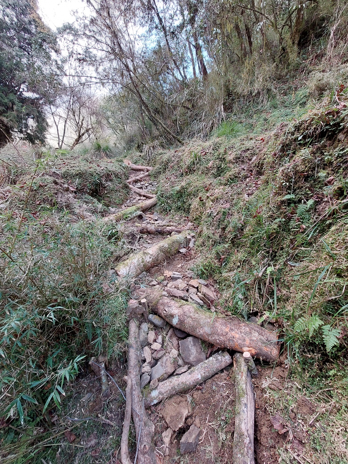 林管處3月5日號召玉山國家公園管理處、國立臺灣大學生物資源暨農學院實驗林管處、國家森林志工、台灣千里步道協會、大亞集團旗下大亞電纜美麗家園基金會企業志工,以手作步道的方式修繕新高口旁玉山林道,手作步道是一種強調融合自然的工法,使用現地天然素材。本次活動完成了砌石駁坎、砌石截水溝、沖蝕溝處設置消能木結構、陡坡踏點、砌石階梯、亂石堆整理,讓山友行走更加順暢安全,另封掉幾處捷徑,避免棲地切割破碎化。