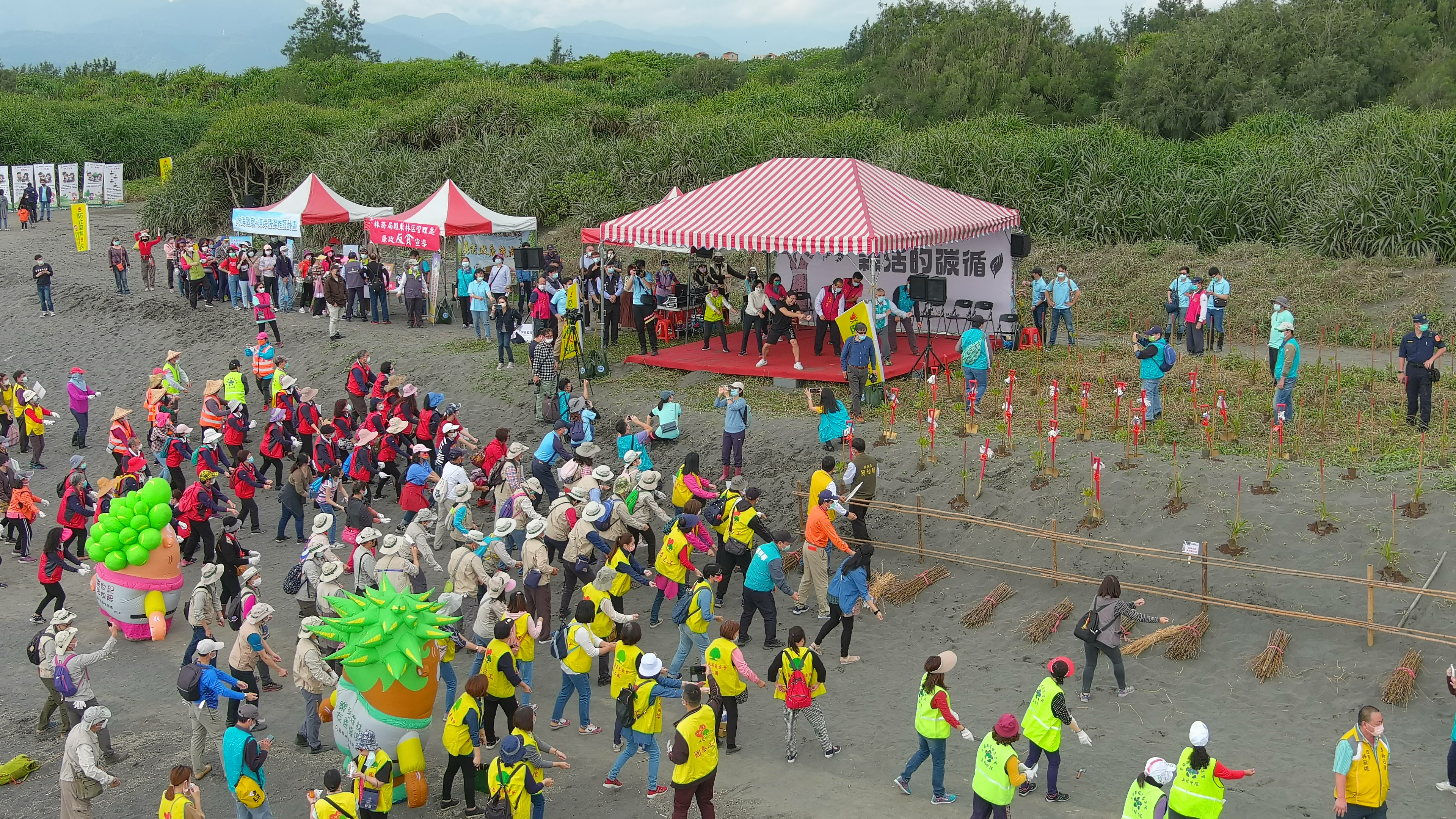 林務局羅東林區管理處於3月12日植樹節與宜蘭縣政府及五結鄉公所在加禮宛保安林(2702號保安林)共同辦理「季新藍海-森活的碳循」植樹暨淨灘活動,現場由宜蘭縣林姿妙縣長、五結鄉鄉長沈德茂率在地各村村長及羅東處鄧江山副處長率在地企業志工及在地社區夥伴約500人共同在海岸保安林種下草海桐及林投苗木,同時搭建海岸堆沙籬養護海岸沙灘環境,最後透過與會來賓的雙手共清理110公斤海廢垃圾(樣態包含寶特瓶、塑膠袋、保麗龍等人為垃圾,並分為可回收及不可回收類別),還給宜蘭美麗的海岸線。 林務局羅東林區管理處針對110年林務局社區林業計畫績優社區進行頒獎,以表揚過去一年社區在執行林務局社區林業2.0計畫,在森林保護、自然保育及部落文化傳承具良好成效之社區進行頒獎。榮獲獎項:(一)特優:宜蘭縣雙連埤地區永續發展協會、(二)優等:宜蘭縣愛南澳生態旅遊發展協會、(三)甲等:臺北市南港區久如社區發展協會、宜蘭縣無尾港文教促進會及宜蘭縣大同鄉英士社區發展協會等五個社區。 為響應行政院「向海致敬」政策,羅東處與宜蘭縣政府環保局、第一河川局及在地地方政府,共同維護宜蘭海岸線的清潔,羅東處109-100年在宜蘭地區共清理1610.32公噸海廢垃圾(109年1022.44公噸、110年587.88公噸),除投入定期人力外針對突發髒亂地區亦進行不定期清理,為查緝非法垃圾傾倒行為更裝設科技儀器,配合五結鄉公所於海岸重要出入口之監視器,共同打擊不法,提供宜蘭縣民更整潔與美麗的海岸線。 本日種下適合海岸林的原生樹苗草海桐、林投等,讓大家了解「碳循環不僅在於山林,更應延展至海洋環境,達到山與海的串聯,當我們種下一株株樹苗,不僅改善環境同時更有助於吸存大氣中的二氧化碳,響應減碳政策。」現場更透過示範搭建海岸堆砂籬,讓民眾瞭解堆砂籬的功能與目的。 羅東處呼籲民眾:植樹、減碳、護地球;透過垃圾源頭管理,減少使用塑膠製品、落實垃圾減量及回收,才能減少海洋垃圾的發生,一起維護宜蘭縣沿海保安林環境之整潔兼顧生態多樣性。