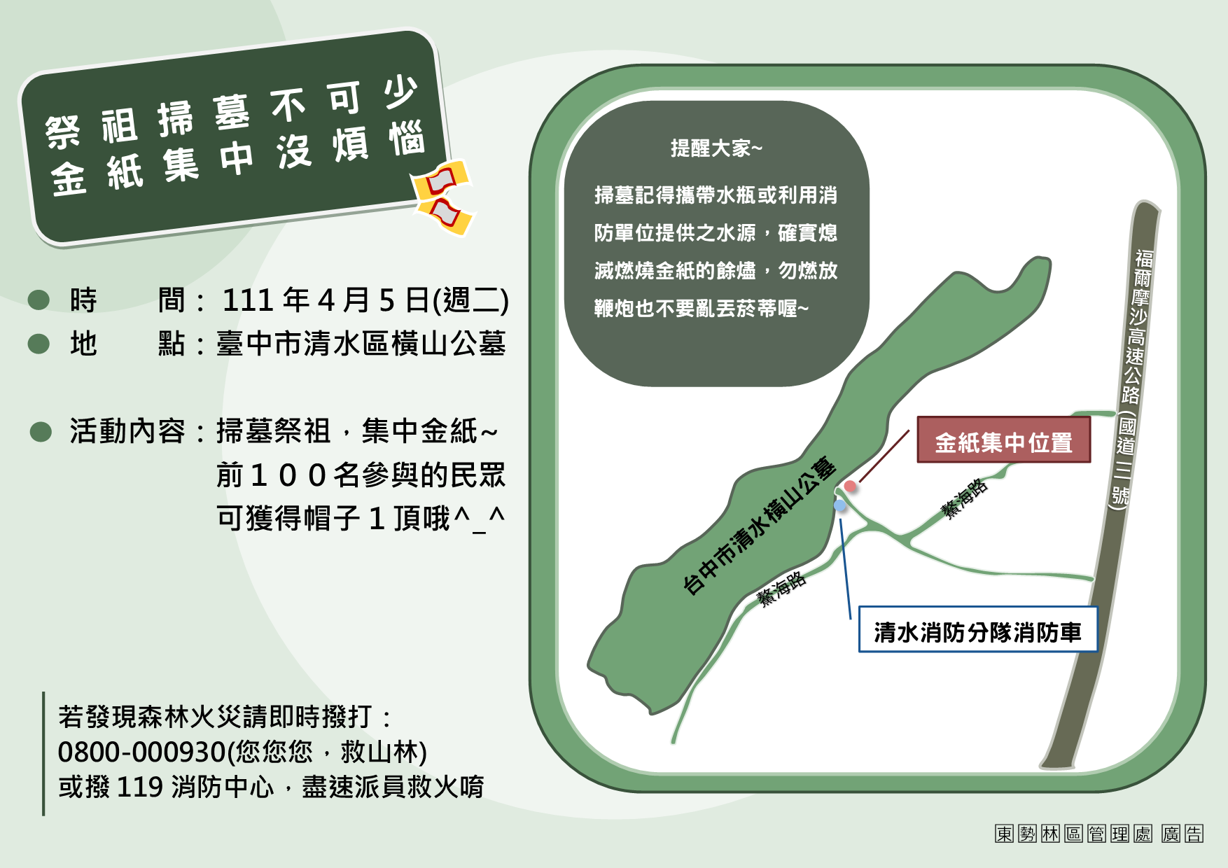 清明節將屆,民眾上山祭祖掃墓燃燒冥紙和燃放鞭炮時,稍有不慎,極易引起火災,為免掃墓過程產生之火星導致森林火災,東勢林區管理處攜手臺中市政府消防局清水分隊、臺中市政府環境保護局、清水區清潔隊及臺中市生命禮儀管理處訂今(111)年4月5日於臺中市清水區橫山公墓試辦金紙集中焚燒活動,呼籲民眾踴躍參與,共同為降低平地森林野火發生機率而努力。 東勢林管處指出,據統計自105年至目前為止,轄區內共發生60件森林火災,其中,以清水、沙鹿地區發生率最高,共36件,佔總發生件數60%。因清水及沙鹿地區公墓多與保安林地相鄰,公墓火災易延燒至保安林地造成森林火災,且保安林距離可利用之消防栓來回時間約需15分鐘,為提升搶救效能,該處自108年至110年特別於與公墓相鄰之保安林(清水鰲峰山地區)設置森林消防水塔及管線工程,共於4處建置12座水塔,儲水量達60公噸,110年更強化水塔管線輸送設備,連接成區域水線鏈,以利輸送水源,縮短水源供給時間,減少森林護管員及消防人員搶救森林火災時因水源問題而疲於奔命。 除此之外,為降低清水地區森林火災發生機率,該處特別邀集相關單位於110年10月召開防火座談會,各單位於會議中取得共識,在今(111)年清明期間於清水橫山公墓試辦金紙集中焚燒活動,為鼓勵民眾配合金紙集中,前100名參與之民眾,更可獲得帽子1頂,期盼全民共同防範森林火災,守護你我美麗的家園。 東勢林管處呼籲民眾踴躍配合金紙集中活動,同時提醒上山掃墓民眾攜帶水瓶或利用各消防單位所提供之水源,用以熄滅燃燒紙錢的餘燼,勿燃放鞭炮、不亂丟菸蒂,共同為防範森林火災盡一份心力,若發現森林火災請即時撥打:0800-000930(您您您救山林)或撥119消防中心,儘速派員救火。