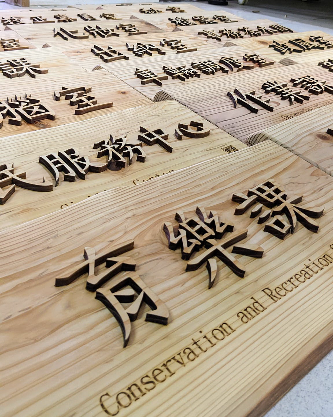 林務局羅東林區管理處為推廣國產材多元運用,近日以國產柳杉木製作辦公空間課室牌誌,讓工作空間增添木意圍繞的森活樣貌。 為國產材推廣利用、體現國產材之美及落實國產木材驗證標章制度,羅東林區管理處帶領示範,以取得「臺灣林產品生產追溯條碼(QR code)」之國產柳杉木為材料,進行各課室牌更新。本批牌誌來源為本處110標售的柳杉疏伐木,依木材自然形體,取其不規則邊裁製成板材後,保留木材原色原貌,搭以立體雷雕字呈現層次,成為極簡美又具質感的課室牌。牌面右下角刻有QR Code,透過牌面上的QR code掃瞄,可立即連結進行林產品溯源,確認產品合法來源。 QR code標示是臺灣林產品生產追溯條碼,為林務局推動的「國產材驗證標章制度」三種之一,另有林產物產銷履歷(TAP)、優良農產品(CAS),只要取得任一種,就能夠在產品上標示「台灣木材」的標章,消費者只要認明這些標章,就可以購買到合法國產木材。 藉由公共空間一隅的小改變,讓處裏員工及洽公民眾,親身感受自然質感的木作氛圍,也讓大家知道,國產柳杉色彩豐富、形質紋理優美,毫不遜色於為人熟知的貴重木紅檜、扁柏。國產材各有特色,原木質感及木材的可塑性只要透過巧妙運用,可美感與功能兼具的融入日常生活,妝點打造出有溫度、具生命力的空間環境。