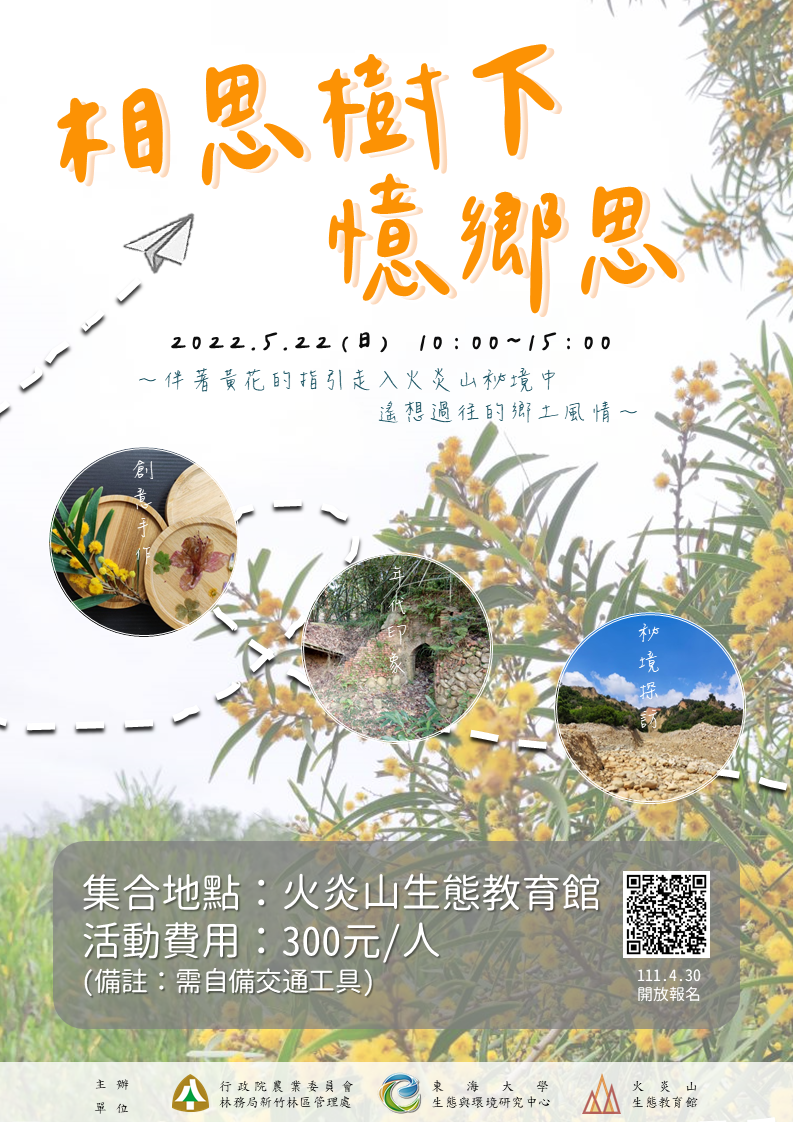 林務局新竹林區管理處火炎山生態教育館將於5月22日(日) 舉辦「相思樹下憶鄉思」主題活動,隨著樹梢上點點黃花的綻放,找尋封存在火炎山自然保留區山林間的記憶,讓大家透過課程觀察相思樹的內裡外在,並認識產業變遷後人類看待森林的不同面向,活動於 4 月 30 日(六)中午 12 點開放線上報名(報名連結:https://reurl.cc/20Yo6E), 名額限定 25 位,請把握機會報名,額滿為止。 火炎山地質脆弱常因環境營力風化侵蝕,使本區植物多為適 應崩塌地之向陽先驅樹種,如臺灣二葉松、相思樹等,其中相思樹為全臺淺山常見的原生樹種,更因其抗旱耐風及水土保持的效果,成為火炎山保安林中不可或缺的造林樹種。而相思樹也是臺灣早期重要的經濟樹種之一,因其樹材質地堅硬、耐濕等優點,過往常作為農具、鐵軌枕木、薪炭材等用途,其中相思木炭產業在苗栗尤為盛行,漫步火炎山周邊古道仍能發現殘留的炭窯遺跡。火炎山生態教育館將於5月22日(日)舉辦主題活動「相思樹下憶鄉思」,帶領大家回到過去一探相思樹產業的變遷,親手製作創意相思杯墊,並前往火炎山自然保留區實地觀察,深度認識相思樹的表裏。 火炎山海拔約 602 公尺,除了特殊珍貴的地質景觀,也是蘊含豐富生物多樣性的自然棲地;在登山愛好者眼中亦是平易近人的郊山,那在你(妳)眼中的火炎山又是什麼模樣呢?火炎山生態教育館透過「火炎山的石虎王國」展覽,在館內述說著火炎山與石虎的故事,經由「三貓陛下」的帶領,了解火炎山森林中的奧秘,相信大家只要走一趟生態館,就能得到滿滿知識的收穫唷!更多活動訊息同步發送火炎山生態教育館粉絲專頁或歡迎直接電話洽詢。 Facebook 官方粉絲專頁: https://www.facebook.com/HuoyanshanEcocenter 官方網站:http://hoyenshan.org/ Beclass 線上報名:https://reurl.cc/20Yo6E 【展館資訊】 名稱:火炎山生態教育館 開館時間:週三~週日 09:00~17:00 (週一/週二 休館) 地址:苗栗縣三義鄉中正路 73 號 電話:037-878851