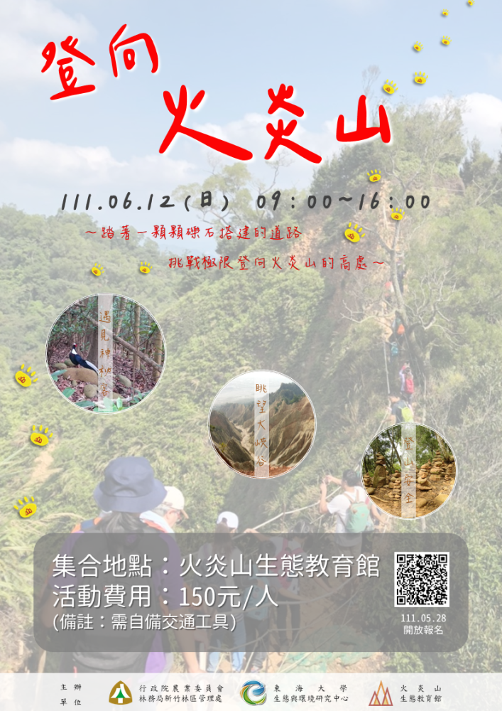 林務局新竹林區管理處將於 111 年 6 月 12 日(日)在火炎山生態教育館舉辦「登向火炎山」主題活動,本次火炎山生態教育館將帶著大家挑戰火炎山登山山徑全程,讓我們在進入山林時,除了認識火炎山的地質與生態,也提高對於登山安全的意識,實現「只留足跡,不留垃圾」的無痕山林概念,體悟人與大自然之間的關係,活動於5月28日(六)中午12時開放線上報名(報名連結: https://reurl.cc/20Yo6E),名額限定 25 位,請把握機會報名,額滿為止。 臺灣有許多美麗的山系,爬山已成為全民運動,但這看似安穩的戶外運動,卻因部分民眾對登山活動意識的不足,造成人員傷亡及救援警消的耗能。近年來火炎山山徑成為熱門的登山景點,總是吸引許多人前往拜訪,本次活動能登上火炎山山徑,看到壯麗的侵蝕溝地景景觀,認識豐富的淺山生態,也能建立登山安全的重要概念,更能鍛鍊自己的體能。 每當地震、雨季後,火炎山登山山徑因岩層崩落而常發生路徑變動,在新竹林區管理處與火炎山登山會的合力維護下,定期為火炎山山徑進行巡護,確保民眾登山的安全。但從事戶外活動仍有一定的風險存在,如果我們能做好事前的預備,包括認識當地地形及規劃路線圖、準備適當的衣物裝備與糧食、留意氣候變化等,便能讓大家在登山的旅程中多一分安心。 火炎山生態教育館6 月 12 日「登向火炎山」主題活動規劃單日健行行程,準備了初階版的登山安全課程,包含基本裝備認識與糧食規劃、建立正確的登山心態等,亦邀請新竹林區管理處的森林志工老師們帶隊,帶領大家挑戰火炎山登山山徑,沿途介紹所見之淺山生態,了解曾經在火炎山執行過的調查計畫。 活動將於 5 月 28 日(六)中午 12 點開放線上報名,名額限定25 位,報名資訊將公告於: Facebook 官方粉絲專頁:https://www.facebook.com/HuoyanshanEcocenter 官方網站:http://hoyenshan.org/ Beclass 線上報名:https://reurl.cc/20Yo6E 【展館資訊】 名稱:火炎山生態教育館 開館時間:週三~週日 09:00~17:00 (週一/週二 休館) 地址:苗栗縣三義鄉中正路 73 號 電話:037-878851