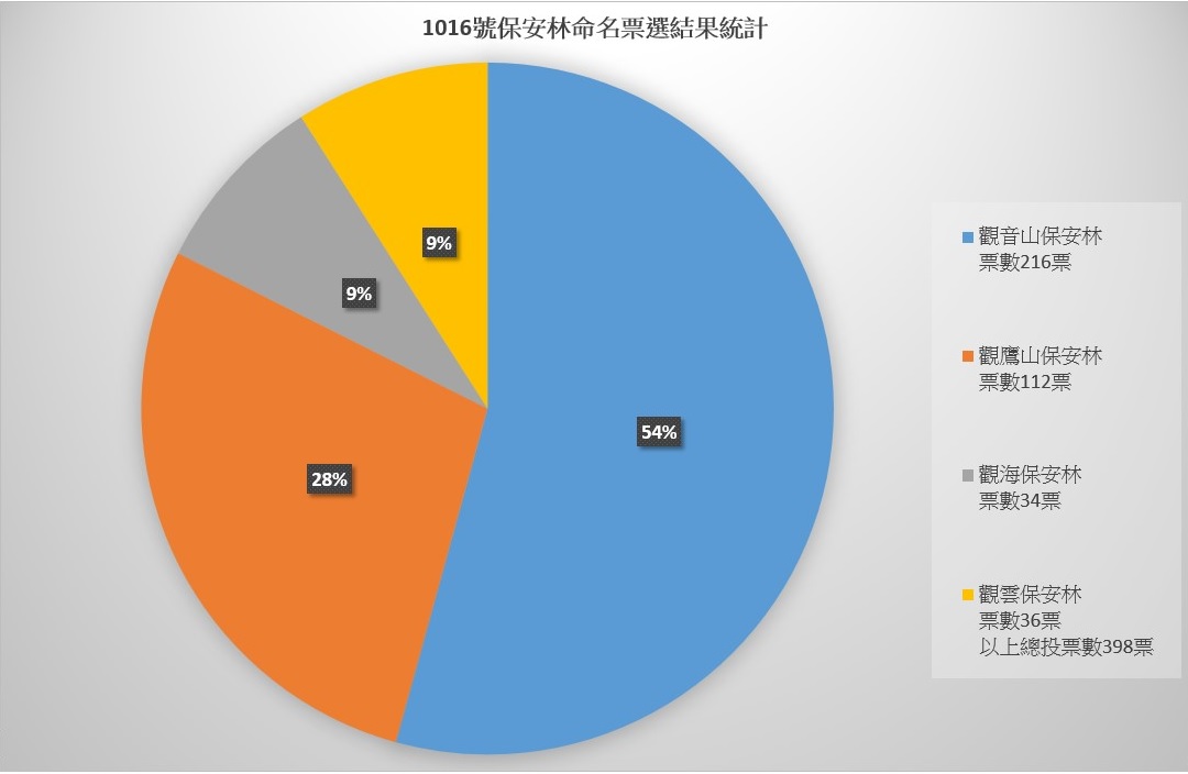 林務局新竹林管處1016號保安林命名票選結果「觀音山保安林」奪冠。 林務局新竹林管處轄內編號1016號土砂捍止保安林,位於新北市五股區、八里區境內,早於民國7年即已編入保安林家族一員,面積約218公頃。早期保安林以數字編號,與在地民眾共同情感記憶的連結較為薄弱,所以新竹林管處辦理這次保安林命名活動,經民眾網路及現場二階段,近400位民眾票選結果,由「觀音山保安林」獲得最高票。 命名活動於去(110)年11月在北海岸及觀音山國家風景區管理處協助下先以網路完成「一起為1016號土砂捍止保安林命名吧」第一階段票選,有128位參與,為更拉近保安林與民眾間距離並提高參與度,新竹林區管理處再於111年4月於觀音山遊客中心辦理「賞鷹趣×1016號保安林命名活動」第二階段現場命名投票活動,合計共398位民眾參加,活動票選結果以「觀音山保安林」獲得216票最高票,其次為「觀鷹山保安林」112票,新竹林管處也依票選結果,將編號1016號保安林命名為「觀音山保安林」。 新竹林管處表示,編號1016號土砂捍止保安林為防止土砂崩壞以維護觀音山風景區景觀為目的而編入,位處新北市五股區、八里區交界的觀音山,山勢由淡水河北岸眺望似觀音躺像而得名,觀音山頂的硬漢嶺更是眾所皆知的登山熱門景點,登高後視野極佳,可以遠眺淡水河入海口、圓山飯店、關渡大橋、淡水、八里等地區美麗景緻,每年3至5月赤腹鷹過境時更是賞鳥聖地,本次票選命名因1016號保安林地處觀音山,挟地名優勢出線,另也是許多賞鷹人士觀赤腹鷹的要地,有不少賞鳥人士投給「觀鷹山保安林」,均讓人覺得既貼切又有特色,也希望透過保安林命名活動,激起民眾認知保安林的公益功能與價值並珍視。