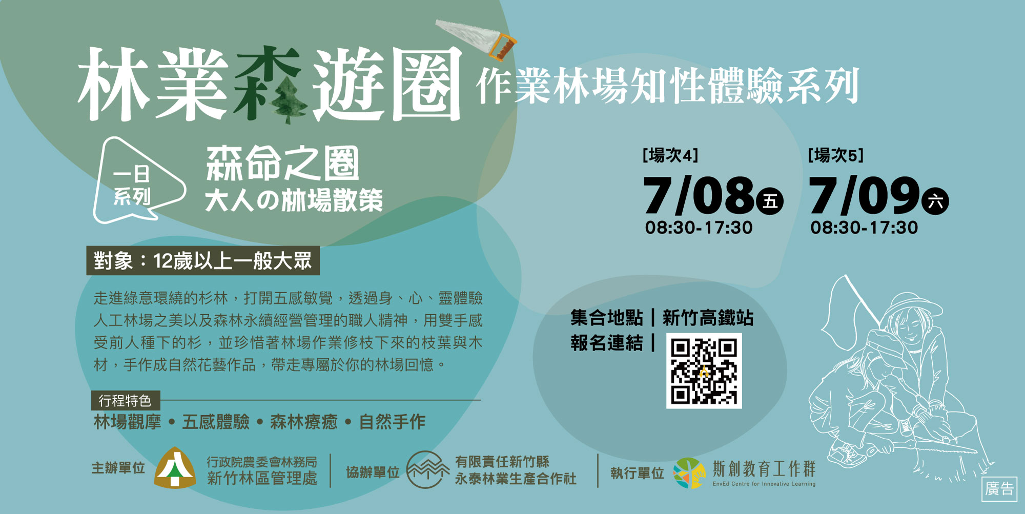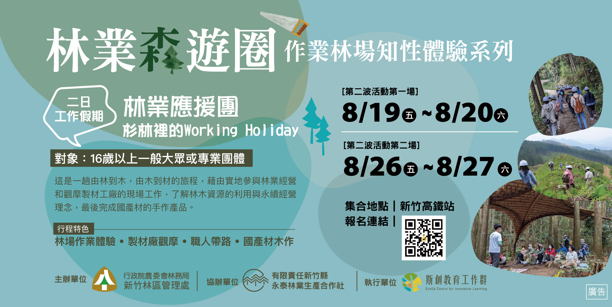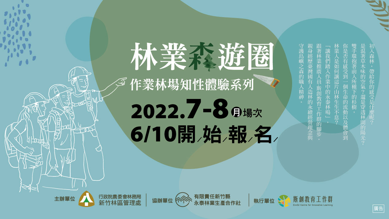 砍樹真的是破壞生態環境嗎?或者它是林業永續經營的循環?林務局近年來積極振興本土林業、推動「國產材」,並建置了國產材溯源系統,來讓民眾更了解林業生產。新竹林區管理處今(111)年度更與林業合作社合作針對不同客群推出「林業森遊圈-作業林場知性體驗」遊程,邀請民眾實際走入林木生產現場,親身感受永續森林經營作業,翻轉大家對於林業的刻版想法。 「林業森遊圈-作業林場知性體驗」活動上半年度首發五場次,皆獲得熱烈響應,參與者紛紛訴說著從作業林場體驗到不同於都市的五感,帶著森林給予滿滿的感動回家。想感受與森林的情感連結嗎?想知道林場如何良善經營嗎?本年度下半年的體驗林場活動場次,有針對一般民眾推出的「森命之圈—大人の林場散策」輕度體驗活動,將帶領大家走訪林場,感受人工林之美、瞭解林業生產循環並體驗現場修枝等作業,將分別於7月8日(五)、7月9日(六)分二梯次舉辦,體驗活動費用為1,699元/人。另對於想瞭解林場實際作業以及林業生產循環經營方式的朋友,8月19日(五)-20日(六)以及8月26日(五)-27日(六)兩梯次的「林業應援團—杉林裡的Working Holiday」深度體驗工作坊,將滿足全面向的需求,活動過程除了走訪林場、瞭解林業經營現況外,將深入體驗林業職人的各項森林調查、伐木等作業,並至永續森林循環的後端利用-木材加工廠,參訪各式製材設備和加工方式,最後製作木製產品,經由兩天一夜親身體驗探索,完成走讀森林循環的迴圈,體驗活動費用為3,990元/人。體驗活動每場次各開放20位名額,採線上報名方式,相關報名資訊及詳情詳見「永泰林業×正昌製材」或「斯創教育工作群」臉書粉絲專頁,活動洽詢專線:0966-571447(執行單位:斯創教育工作群)。 前面四場次體驗活動地點是位於新竹縣橫山鄉,兼顧環境友善及永續林業理念經營的永泰林業生產合作社人工林林場場域以及木材加工廠,我們期待透過林場體驗活動作為與民眾溝通永續森林經營及認識國產材的方式之一,也能讓用心在林業永續的辛苦林農,在漫長的幾十年森林經營等待樹木成材的階段,不再只有投入心血,同時有持續性的經濟收入,共創地方產業與森林資源維護雙贏的永續經營模式。想更加深入瞭解林業嗎? 想體驗森林職人的生活嗎?想知道樹木到木製品的故事嗎?一起來感受林業永續的森命力吧!!相關林業推廣活動訊息請持續追蹤「永泰林業×正昌製材」臉書粉絲專頁。