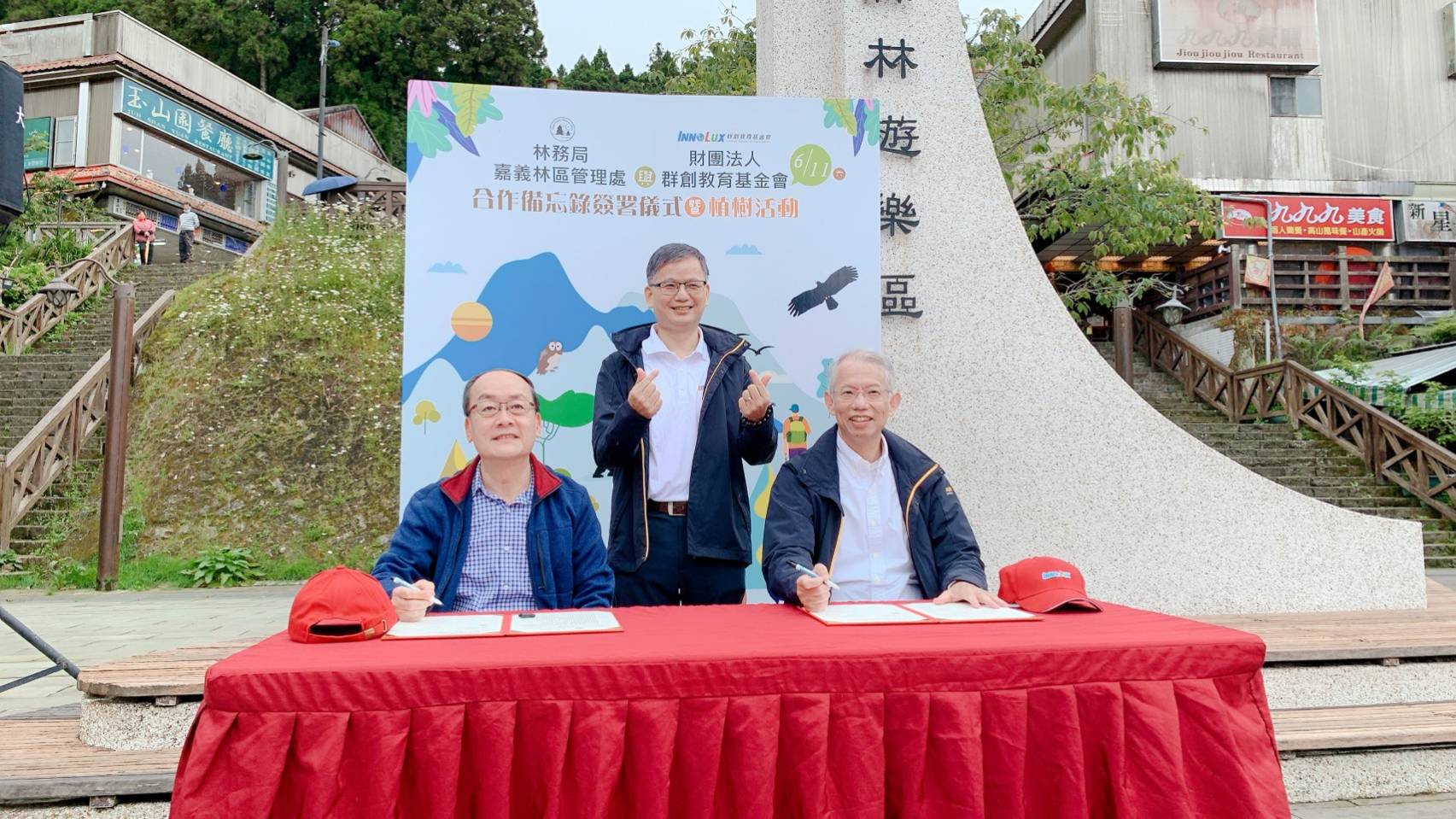 林務局嘉義林區管理處今(11)日與財團法人群創教育基金會於阿里山國家森林遊樂區簽署合作備忘錄,未來雙方將長期以夥伴關係運用彼此資源,透過推動生態旅遊、淨灘淨山、植樹造林等多元方式,攜手推展國內生態保育、環境教育及公民參與山林永續活動。該日同時由群創光電股份有限公司、睿生光電股份有限公司及群豐駿科技股份有限公司約150名員工,一起於遊樂區旅客服務中心前栽植霧社櫻及金毛杜鵑,豐富園區生態景觀,期盼日後花季期間遊客可以在霧社櫻等臺灣原生種的迎接下開啟阿里山賞花之旅。