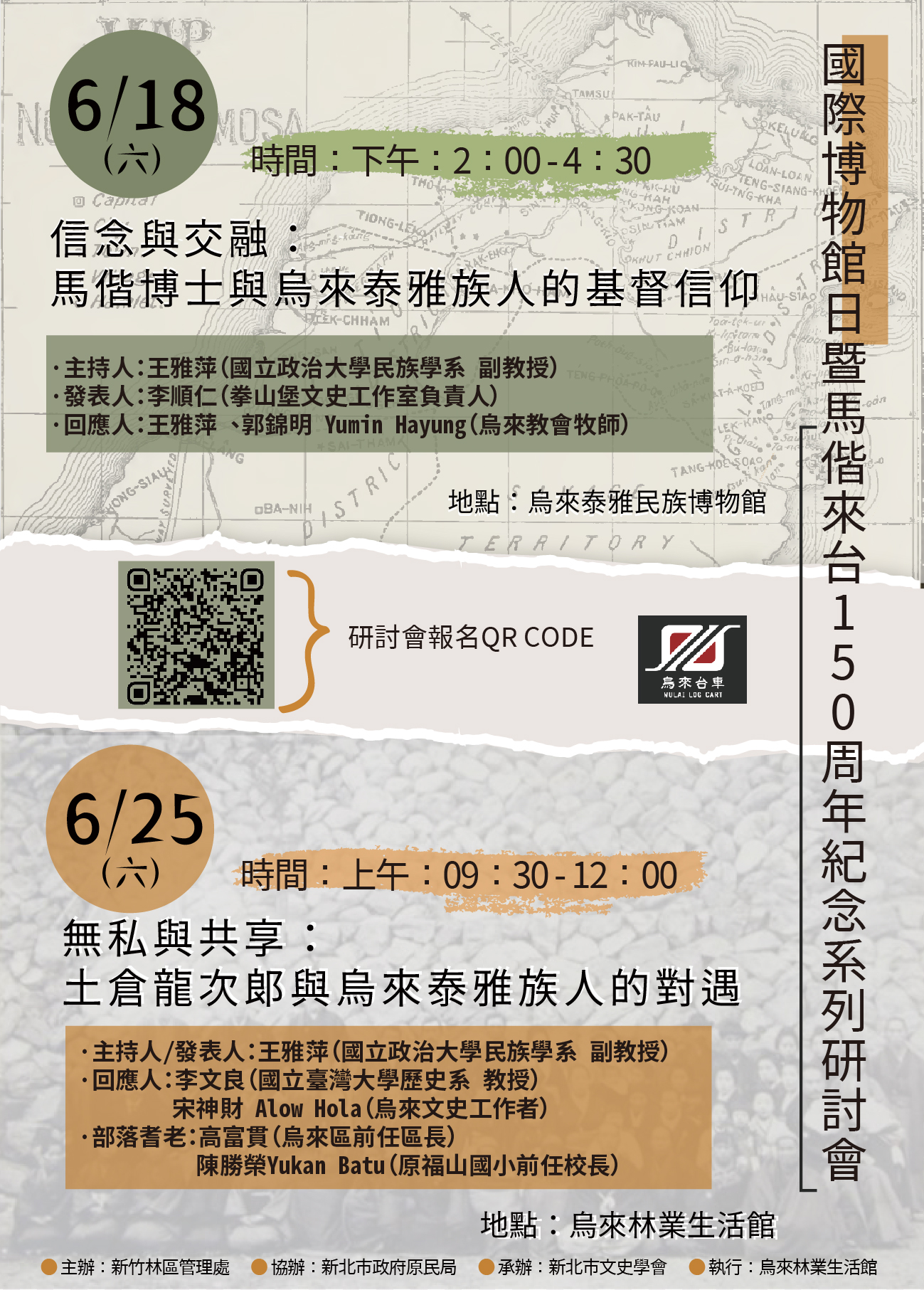新竹林區管理處烏來林業生活館於6月份將辦理兩場次「國際博物館日暨馬偕來台150週年紀念活動系列研討會」,邀請民眾一同來探詢及聆聽烏來地區泰雅族人與林業發展的故事。 新竹處表示兩場次研討會分別於111年6月18日泰雅民族博物館舉辦「信念與交融:馬偕博士與烏來泰雅族人的基督信仰」以及6月25日於烏來林業生活館舉辦「無私與共享-土倉龍次郎與烏來泰雅人的對遇」,歡迎民眾即日起至線上網址:https://forms.gle/nsqAhecMKKiBQPUC8 報名參加。 每年的5月18日是「國際博物館日」,今年國際博物館日的主題為「博物館的力量」,博物館為探索與發現歷史的場域,是一道認識先人或不同國度、不同世代、不同族群、人、事、物的大門,打開過去,走進歷史,讓我們學習用不同的視角,重新理解與詮釋曾經發生在這片土地的故事。烏來林業生活館作為講述台車歷史與林業文化的微型博物館,誠摯地邀請民眾,一同轉動歷史,從日本人土倉龍次郎來到烏來植林事業的發展軌跡,以及馬偕博士深入新店山區與烏來泰雅族人的互動中,聆聽烏來泰雅族人的時代觀與烏來地區林業發展的故事。 研討會將邀請政治大學民族系副教授王雅萍老師、國立台灣大學歷史系李文良教授、文史工作者以及烏來在地耆老等人一同分享參與研討,讓更多人認識與瞭解,烏來泰雅原住民與林業發展軌跡的歷史意義與價值。 詳情請洽烏來林業生活館02-2661-6780(週二休館),或上『台車清遊-烏來林業生活館』粉絲專頁:http://ppt.cc/rxW6。 聯絡人:關晨引 兩場次研討會資訊如下: 【場次一】:「信念與交融:馬偕博士與烏來泰雅族人的基督信仰」研討會 ·日期/時間:6/18(六),下午2:00~4:30 ·地點:烏來泰雅民族博物館(新北市烏來區烏來街12號) ·主持人:王雅萍 副教授(國立政治大學民族學系) ·分享人:李順仁(拳山堡文史工作室負責人) ·回應人:王雅萍 郭錦明Yumin Hayung(烏來教會牧師) 【場次二】「無私與共享-土倉龍次郎與烏來泰雅人的對遇」研討會 時間:6/25(六),上午09:30~12:00 ·地點:烏來林業生活館(新北市烏來區瀑布路1-2號) ·主持人:王雅萍 副教授(國立政治大學民族學系) ·分享人:王雅萍 ·回應人:李文良(國立臺灣大學歷史系 教授) 宋神財 Alow Hola(烏來文史工作者) ·部落耆老:高富貫(烏來區前任區長) 陳勝榮Yukan Batu(原福山國小前任校長)
