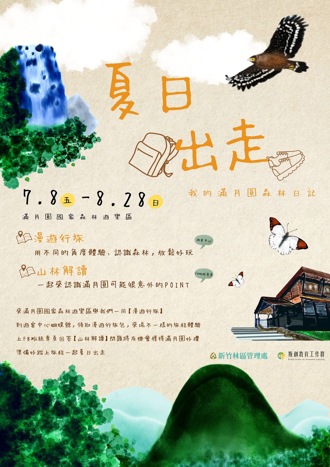 位於新北市三峽區的滿月圓國家森林遊樂區,擁有豐富的蚋仔溪溪流生態以及多變的林相,園區內步道大半平緩好走,有大台北的後花園之稱,是許多民眾假日去處的優良首選!新竹林區管理處表示7、8月暑假期間,為了讓民眾能以不同方式徜徉在滿月圓的自然環境當中,遊客中心於7月8日至8月28日止,辦理【夏日出走-漫遊行旅】現場活動及【夏日出走-山林解讀】網路活動,邀請民眾在防疫之餘,不論透過線上或是親自到訪滿月圓,都能讓身心靈有不一樣的豐富感受。 【夏日出走-漫遊行旅】現場活動邀請遊客至遊客中心蝴蝶館押證件領取漫遊行旅包,依照提示卡說明用不同的角度體驗、認識森林,體驗完成後歸還漫遊行旅包,出示臉書或IG打卡畫面即可兌換滿月圓禮品乙份。 【夏日出走-山林解讀】網路活動自7月8日起,每兩週於滿月圓國家森林遊樂區粉絲專頁中,以民眾不知道的滿月圓為主題,如滿月圓為什麼會有這麼浪漫的名稱?在滿月圓步道上有機會與那些動物相遇,邀請民眾留言回答正確答案,就有機會抽到滿月圓精美好禮。 滿月圓國家森林遊樂區誠摯地邀請您一同走進滿月圓的步道當中探索、近距離的觀察,體驗自然美景。相關訊息可追蹤「滿月圓國家森林遊樂區」臉書粉絲專頁或上「臺灣山林悠遊網」查詢,亦可洽詢滿月圓國家森林遊樂區遊客中心電話02-26720542(08:30-17:00,週二休館)。 另外提醒您,依據中央流行疫情指揮中心發布之指引,入園遊客須量測體溫,額溫達攝氏37.5度以上者,不得入園;遊客於森林遊樂區活動、可保持安全距離處可不配戴口罩,惟於無法維持安全社交距離時,或於室內場館時仍應全程配戴口罩。