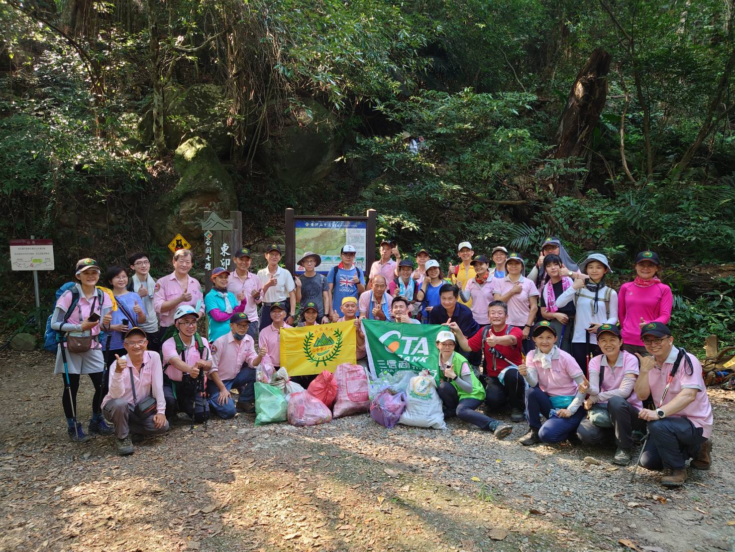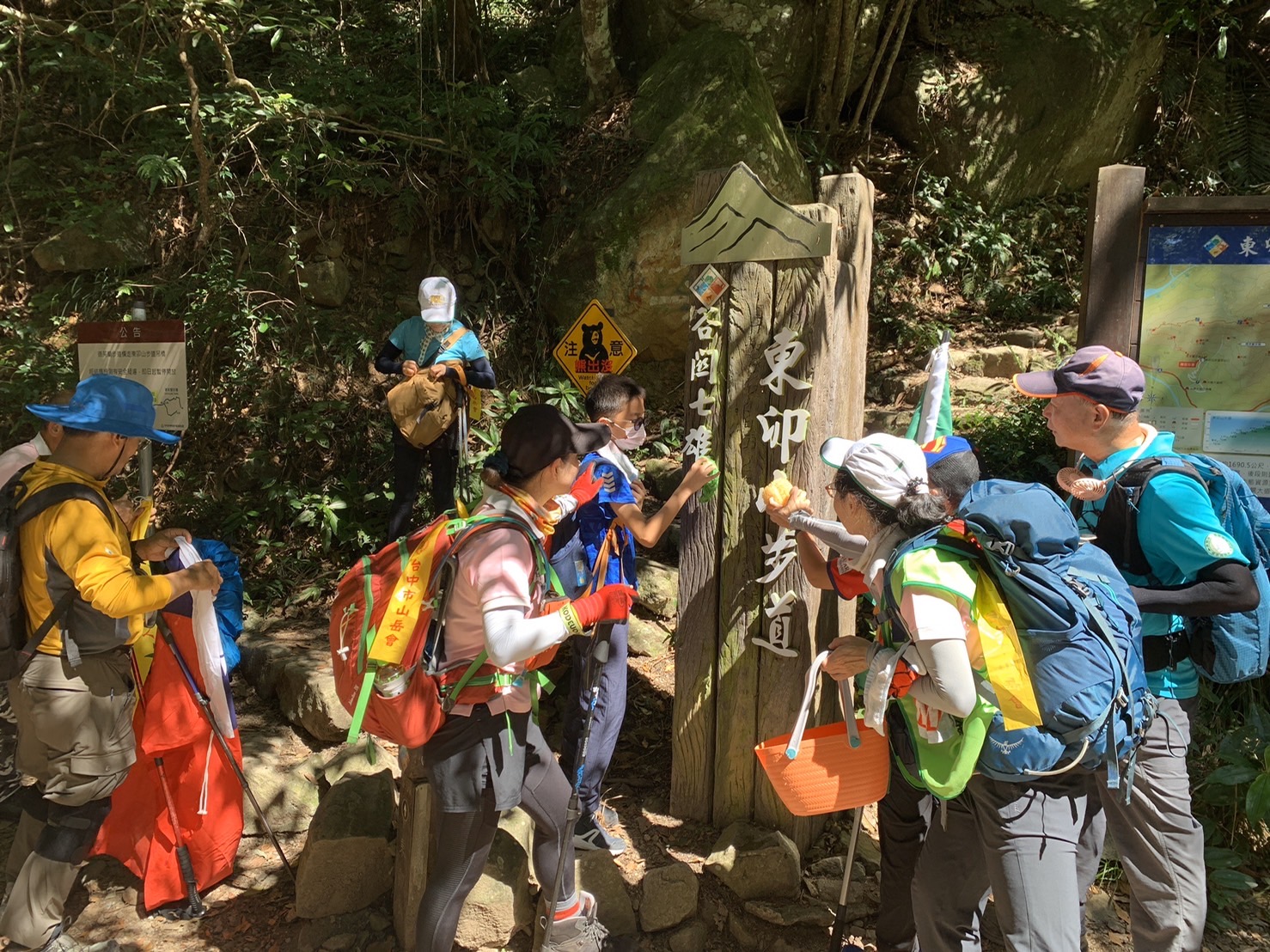 東勢林區管理處與台中市山岳會、三信商業銀行今日舉辦東卯山步道淨山、解說牌清潔暨無痕山林宣導活動,動員百餘人參與,清出約13袋共25公斤之垃圾,其中包含有玻璃瓶、鐵罐、寶特瓶等,另擦拭解說牌共28面,為愛護自然環境付出行動。 該處為提升遊客登山安全,於111年5月16日與山岳會、三信銀行簽署「東卯山步道環境暨設施維護服務協議書」,認養期間內每4個月辦理步道與週邊環境清潔與設施損壞查報事宜,以公私協力方式,共同維護山林環境。今(23)日辦理首場次淨山及解說牌擦拭工作,參與人員當中更有多位具有中區搜救委員會結訓證書,曾參與多次山難協尋,於活動中以繩索垂降方式撿拾步道邊坡難以撿拾之垃圾,另也有全家總動員,由爸爸媽媽帶著小孩一同撿拾垃圾,環境教育從小紮根。所有人員於登山口集合分配工具與整裝後,共分為4隊分批自登山口-2K涼亭-東卯山沿途淨山,並由該處國家森林志工及山岳會進行無痕山林宣導與登山安全知識經驗分享,參加人員直說是知識、感性兼具的活動,期待下次再次參加。 東卯山步道於谷關七雄中排名第五,沿線風景秀麗,生態資源豐富多樣,登頂後腹地寬廣,視野遼闊,擁有360度絕佳的好風光,天氣良好時除可遠眺松鶴部落外,鳶嘴山、稍來山、馬崙山、八仙山稜脈、唐麻丹山之山巒美景盡收眼底。