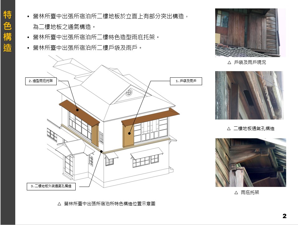 東勢林區管理處權管「豐原區南陽路逸仙莊69.70號」兩棟建物,於104年4月23日經臺中市政府公告指定為市定古蹟,並於107年4月26日重新指定名稱為「營林所臺中出張所宿泊所」。為保存古蹟之歷史價值,經行政院核定「110-113年林業文化資源保存與整體再發展中長程計畫」,編列2800萬經費並依據臺中市政府核定規劃設計成果(展示及展售館)進行工程修復。 東勢林區管理處指出,該修復工程於7月13日完成工程發包,並於昨(8/2)日辦理台中市市定古蹟「營林所臺中出張所宿泊所」修復再利用工程施工說明會,邀集相關單位包含關心地方議題江啟臣委員服務處、陳清龍及張瀞分市議員、台中市文化資產處、在地社區發展協會、陽明里里民等,說明施工內容及修復方式,深獲與會代表肯定,也對未來整合地方文化旅遊軸線,深具信心。 該處表示,昭和元年(1927年),將臺中出張所與土牛貯木池移設置豐原現址,為提供日籍員工住宿以及往來長官住宿與視察之需求,遂於1927~1935年陸續興建宿舍群與招待所。此棟市定古蹟建物即為八仙山林場時期的官式二層日式招待所。其中二樓地板於立面上有部分突出構造,為通氣構造,特色造型之雨庇托架、戶袋及雨戶等,具特殊性與稀少性,修復時將維持日治時期傳統木構造建築物特色,極具時代背景意義。 本案工期為600日曆天,預計於113年3月底完工,希冀完工後可帶動串連東勢、豐原、潭子等地區文化景觀及重現八仙山林場內涵,促進地方經濟繁榮。