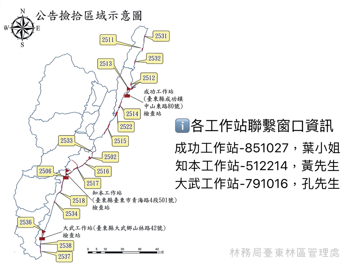 臺東林區管理處自111年08月08日至交通部中央氣象局發布下次陸上颱風警報或豪雨特報(範圍臺東縣)為止,期間開放轄管海岸地區保安林範圍之漂流木,民眾可徒手方式自由撿拾,但不開放使用機具;開放漂流木自由撿拾期間,將於轄管知本工作站、成功工作站及大武工作站等3處設置林產物檢查站(詳如附圖),請民眾將撿拾的漂流木到指定地點之檢查站辦理登記。