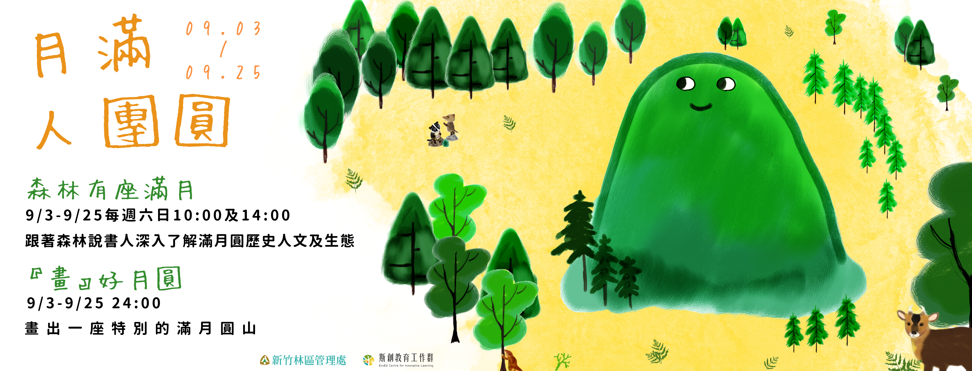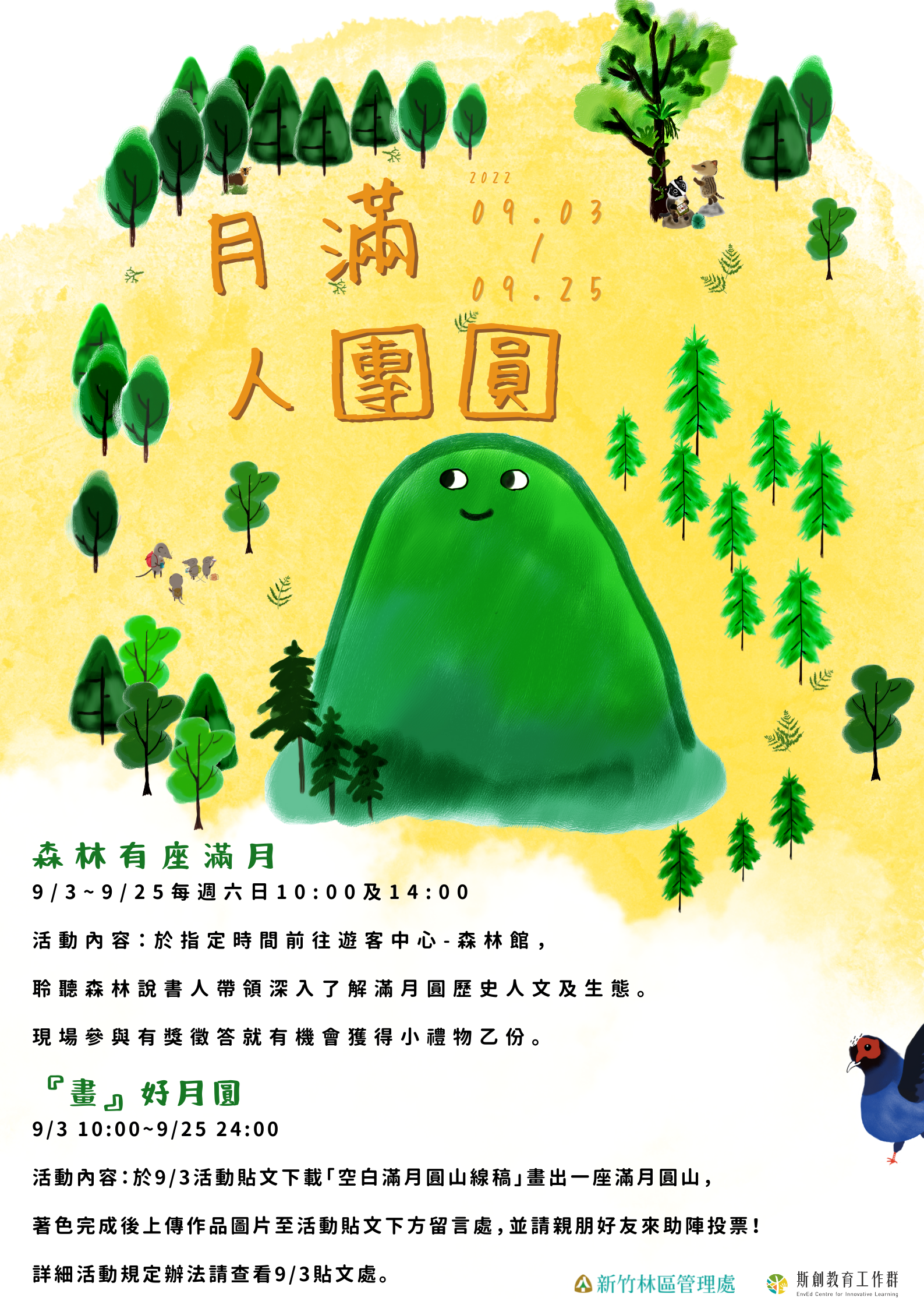 滿月圓山因形似滿月而得名,也是從前林業人員無法回家團圓時的慰藉,透過凝望形似滿月山頭,遙想共聚時的歡愉氣氛。今年中秋佳節除了凝望天上滿月,滿月圓國家森林遊樂區遊客中心邀請民眾,呼朋引伴到滿月圓賞「山」,一家大小、親朋好友在山林裡,漫遊步道、賞瀑時抬頭尋找滿月圓山,一起共聚團圓時刻。 滿月圓國家森林遊樂區遊客中心9月份辦理【森林有座滿月】現場活動及【『畫』好月圓】網路活動,【森林有座滿月】是由森林說書人帶領大家走回那段遙望山頭思鄉情懷的時光,運用童趣的手繪故事與現場互動,讓家人朋友相聚度過歡樂假期;【『畫』好月圓】則是邀請大朋友小朋友,手繪創作專屬於自己的「滿月圓山」,並邀請親友集氣投票,線上線下一起大團圓! 【森林有座滿月】現場活動自9月3日至9月25日每週六日,一天兩場,早上10點及下午2點至遊客中心森林館聽森林說書人介紹滿月圓的歷史及環境特色,並參與現場有獎徵答就有機會獲得滿月圓禮品乙份。 【畫』好月圓】網路活動,邀請民眾至滿月圓國家森林遊樂區臉書粉絲專頁下載空白滿月圓山線稿,畫出心中特別的滿月圓山,並進行網路票選,票選期間為9月3日至9月25日,活動結束後將送出人氣獎3名、參加獎6名及小編尬意獎1名。 相關訊息可追蹤「滿月圓國家森林遊樂區」臉書粉絲專頁,或上「台灣山林悠遊網」查詢。洽詢專線(02)2672-0542滿月圓國家森林遊樂區遊客服務中心(08:30-17:00,週二休館)。 另外提醒民眾,依據中央流行疫情指揮中心發布之指引,入園遊客須量測體溫,額溫達攝氏37.5度以上者,不得入園;遊客須佩戴口罩,空曠處活動、可保持安全距離處可不佩戴口罩,惟於無法維持安全社交距離時,或於室內場館時仍應全程佩戴口罩。