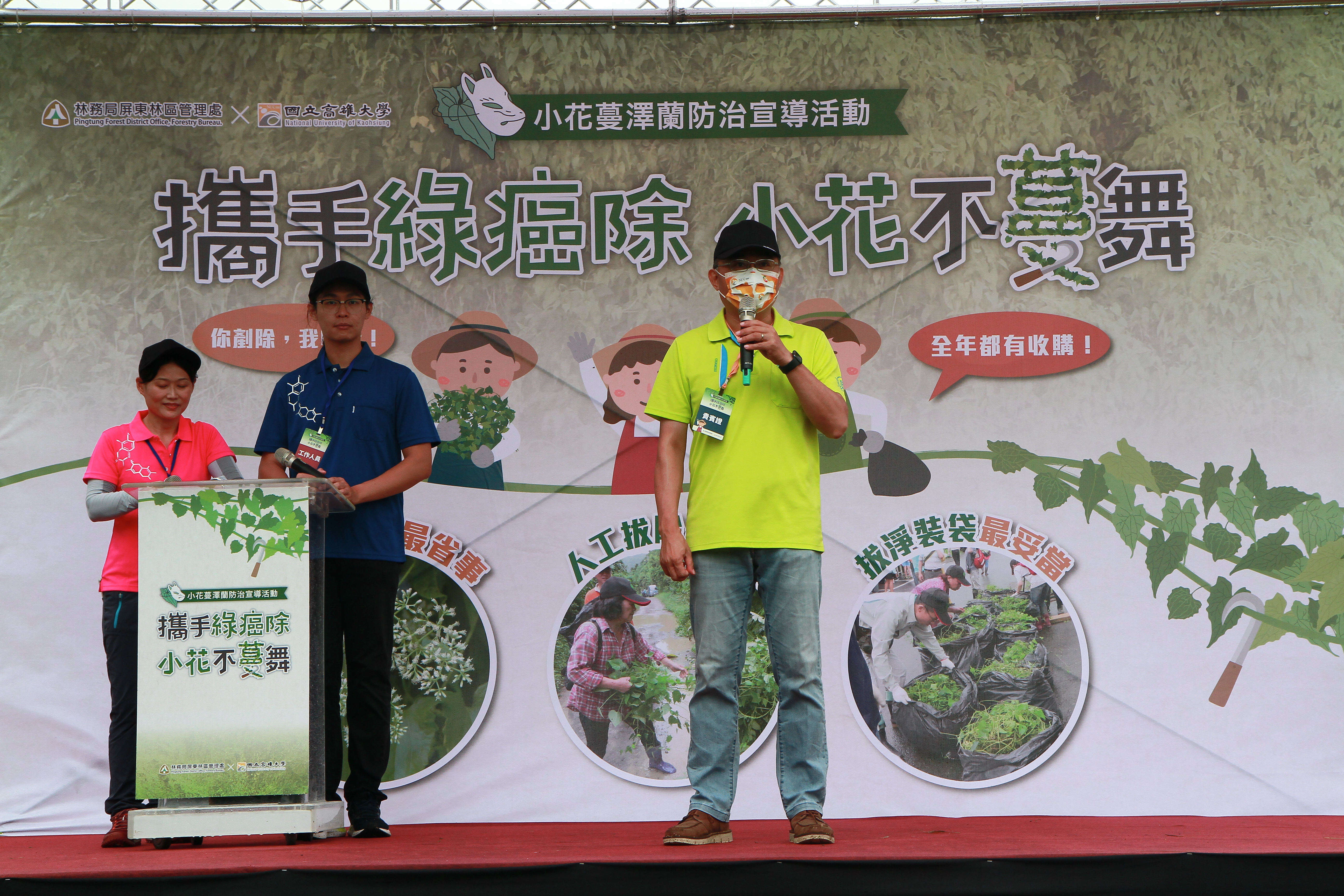 有「植物殺手」之稱的小花蔓澤蘭,為強勢外來入侵植物,嚴重威脅台灣原生植物生長空間。每年10月至隔年2月為其開花結實期,在開花結實前剷除最能降低危害。行政院農業委員會將每年8月15日至9月15日訂為小花蔓澤蘭全國防治月,9月第1個週六為全國防治日,各地持續擴大宣傳加強民眾防除觀念。 今年全國防治日雖受到軒嵐諾颱風影響,林務局屏東林區管理處與國立高雄大學仍不畏風雨攜手在校園東湖舉辦除蔓活動,學校教職員生、在地藍田里居民及高雄健身工廠員工在風雨中都提早到場參加,超過200人共同響應分組除蔓趣味競賽,半小時共拔除968公斤的小花蔓澤蘭植體,其中拔除241公斤植體的藍田里隊奪得拔蔓王冠軍。 民眾拔蔓後也熱烈參與宣導攤位活動,工研院的小花蔓澤蘭醋液、薰香、生物炭等驅蚊及土壤改良劑最受青睞;裕雋生物科技公司透過小花蔓澤蘭具再生特性,開發面膜與修護霜美容產品;高雄市甲仙愛鄉協會也指導民眾DIY小花蔓澤蘭植物提袋敲染及蛋染體驗,十分有趣。 屏東林管處副處長朱木生表示,高雄大學是一所綠色生態大學,致力於推動環境永續之核心價值理念,將SDGs推廣導入教學研究與行政領域。98年本處曾與校方在此合辦植樹活動,如今綠樹成蔭逐漸茁壯,然而強勢的外來入侵植物也悄悄攻進校園,為了還給東湖美麗的「森容活湖」原貌,今年再度攜手除綠癌,不再讓小花蔓澤蘭「蔓佈」在校園。 高雄大學副校長吳宗芳致詞表示,高雄大學生態豐富,生態環境更需要大家一起努力,未來希望繼續跟各單位合作舉辦類似活動,一起努力。 屏東林管處所轄的六龜工作站也同步在六龜區扇平林道與林試所六龜研究中心、中興社區發展協會及社區民眾舉辦小花蔓澤蘭移除活動,參與人數共約60人,移除470公斤植體,不畏風雨,一同為環境付出行動決心。 為鼓勵民眾投入除蔓行列,今年度起林務局全年辦理收購小花蔓澤蘭,民眾可於每週二、四上午9時到12時,下午1時至4時至屏東林管處所轄4個工作站辦理,收購價格為每公斤5元,收購數量無上限。詳情請追蹤屏東林管處臉書。