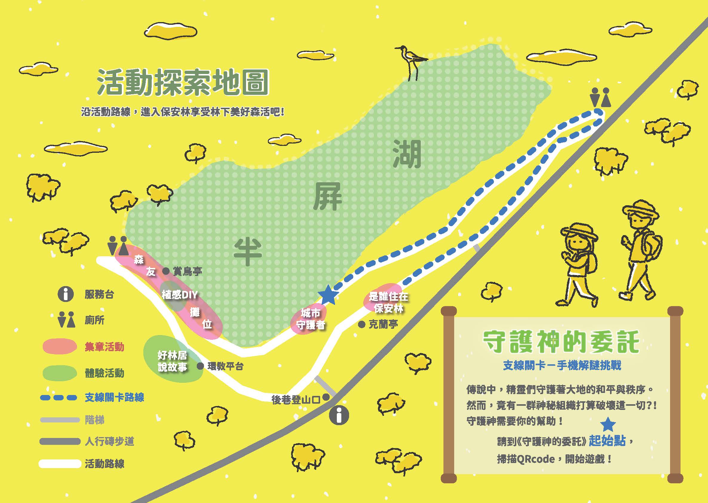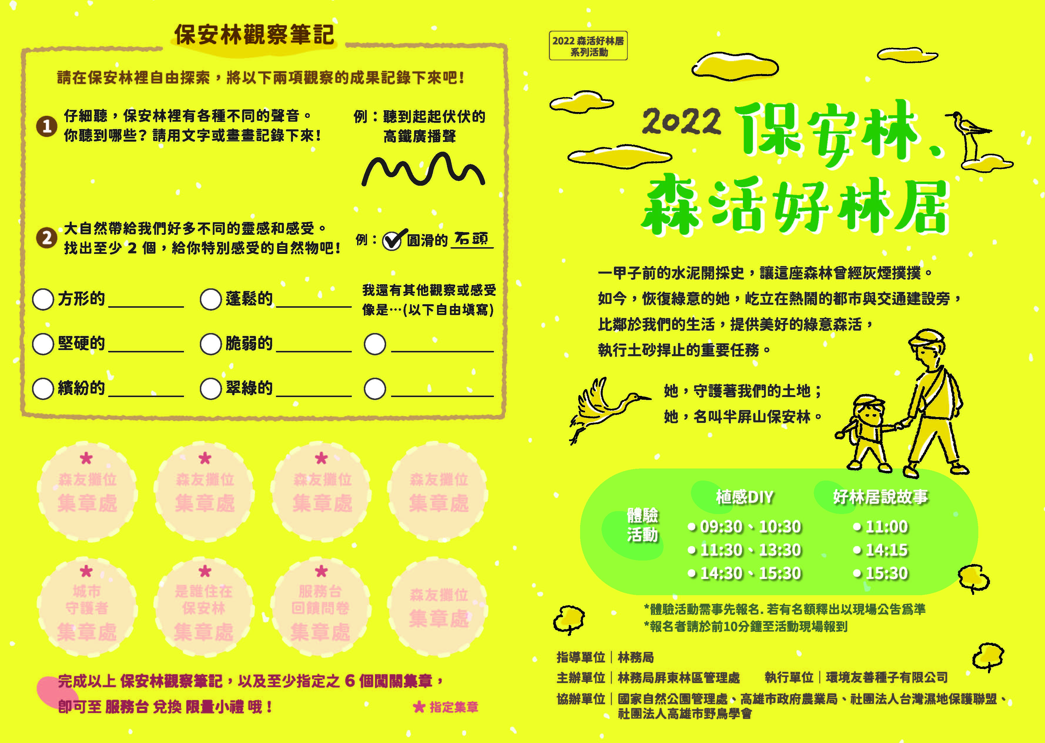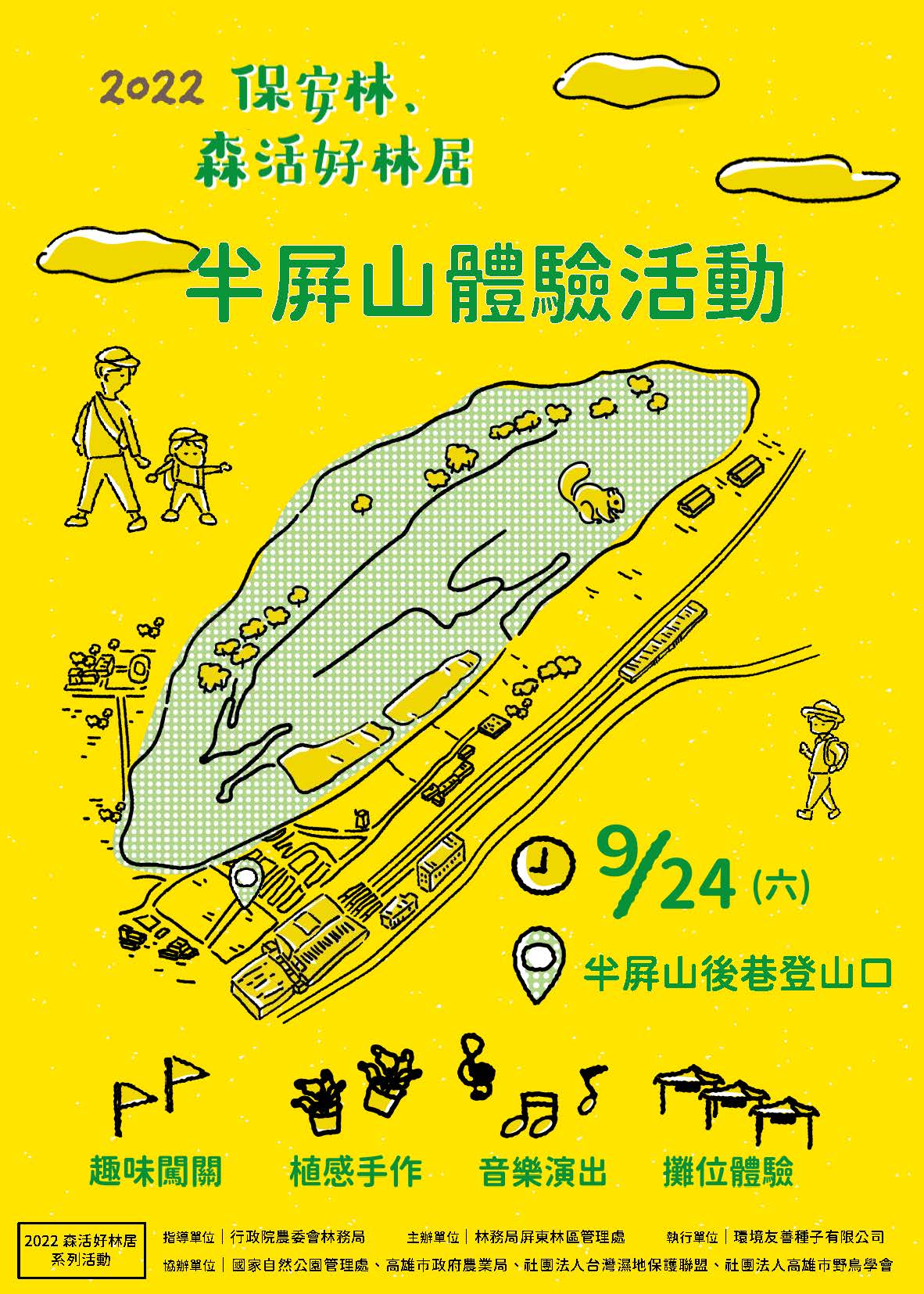 位於高鐵左營站旁的半屏山保安林,是外地遊客進入高雄的綠意門戶,更是在地居民平常登山健行的好去處。不過您知道嗎,半屏山還有著守護城市和交通建設的重要身分,就是「半屏山保安林」。屏東林區管理處邀請您9月24日上午9點半至下午4點半,來半屏山參加《保安林.森活好林居》活動,透過音樂故事、植物盆栽DIY、闖關活動等多項體驗,認識保安林好「林」居帶給我們的美好「森」活,完成闖關還可獲得限量好禮。趁著假日,快帶孩子們一起來森林裡走一趟,把保安林的生態知識帶回家吧! 保安林,是「保」護環境,讓我們「安」心生活的森林,屬功能性森林。屏東林區管理處轄下的三座都會型保安林,包含旗後山、打狗山及半屏山,三座山在高雄市民心中甚為熟悉,不過卻很少人知道他們具有保衛國土的保安林身分。林務局過去推動「全民的保安林」,透過保安林命名等活動,將保安林冰冷的編號化為有溫度的名稱,拉近民眾與保安林的距離。原編號2304號土砂捍止保安林的「半屏山保安林」,過去曾因開採水泥的歷史飽受摧殘,隨著後來停止採礦、森林植被逐漸恢復後,半屏山重拾起保衛國土的功能。半屏山保安林防止了土砂崩壞,保護半屏山、後勁、左營的附近村莊及道路,守護了高鐵台鐵捷運的三鐵共構車站和聯外交通道路,更因地理位置特殊,發揮了國防、淨化中油油氣及溼地滯洪等多重功能,除了提供自然生態保育、環境教育、衛生保健的功能,更因為其土砂捍止保安林的身分,守護民眾的生命財產安全。 屏東林區管理處於8月份起,推動《保安林.森活好林居》系列活動,其中壓軸體驗活動將於9月24日於半屏山熱鬧展開。本次活動特別規劃多元的體驗方式,讓大小朋友透過輕鬆有趣的方式,認識、親近、喜歡保安林。當天規劃三場音樂故事演出,透過半屏山傳說故事帶大小朋友認識保安林的功能;喜歡植物手作的民眾,更不能錯過原生植物的盆栽DIY體驗,不只認識在地原生植物,還能將親手種植的滿滿「植感」帶回家;此外,在地NGO與政府夥伴帶來豐富多樣的森友攤位體驗,透過遊戲帶大家從不同角度認識半屏山的生態資源;而解謎愛好者更不能錯過自導式的手機解謎遊戲,現場掃描Line 好友帳號即可加入遊戲,一起成為守護神的天選守護者,解開重重暗號,拯救被神秘組織襲擊的精靈們! 當日活動依中央流行疫情指揮中心相關規範落實防疫規定,請參與民眾配合配戴口罩與酒精消毒。如有發燒(額溫超過37.5度)或不舒服,請在家休息。 活動詳情請見活動網站(https://reurl.cc/eO8VD7),或電話洽詢(07)7996929區小姐、(08) 7236941#122陳技正。