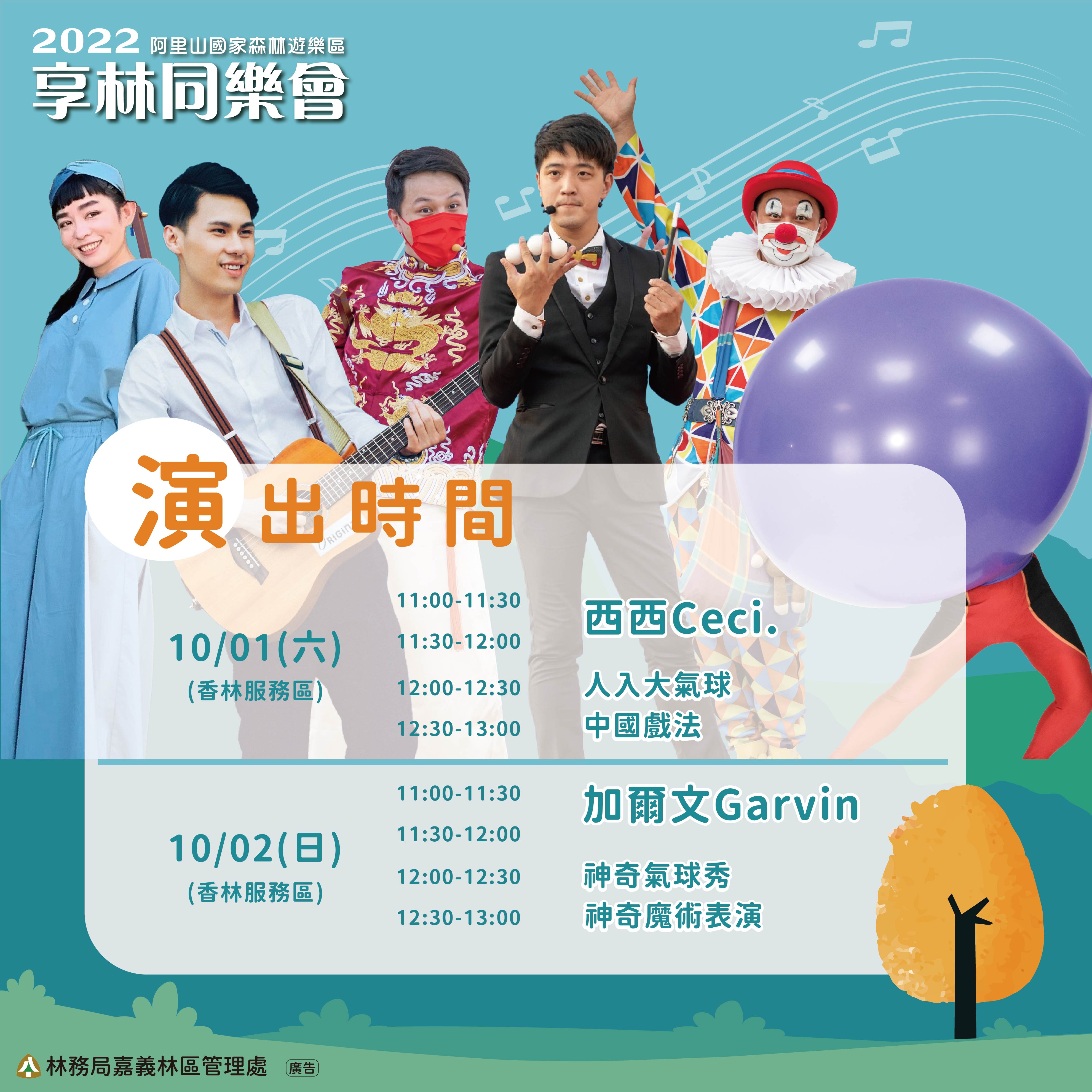 阿里山國家森林遊樂區在10月從鬱蔭深綠轉換成色彩繽紛的顏色,林務局嘉義林區管理處為讓大家來阿里山可以有更豐富的遊玩回憶,10月1、2日將在香林服務區辦理「享林同樂會」,有神奇的氣球秀、魔術表演、中國戲法和人入大氣球互動的同樂表演,還有「加爾文Garvin」及「西西Ceci」現場演唱,歡迎大家一起來阿里山國家森林遊樂區,在享受森林、觀賞豐富的林木生態的同時,還能一起歡慶同樂。