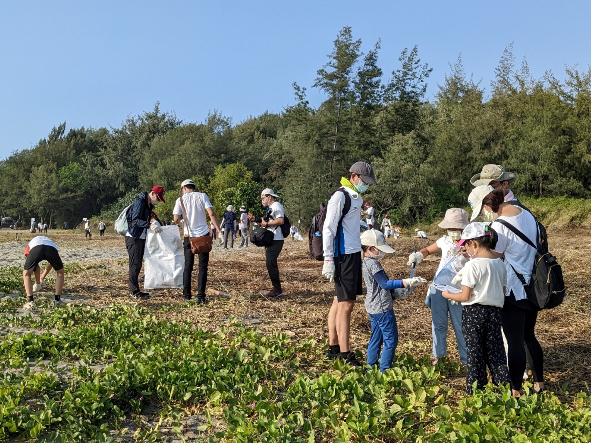 活動中由環境教育人員解說外來種植物及廢棄物對漁光保安林危害的影響,並透過LINE設計小遊戲,讓企業員工帶著孩童闖關了解保安林防止強風、飛砂、鹽霧等功能,思考保安林的重要性,深化保安林觀念。