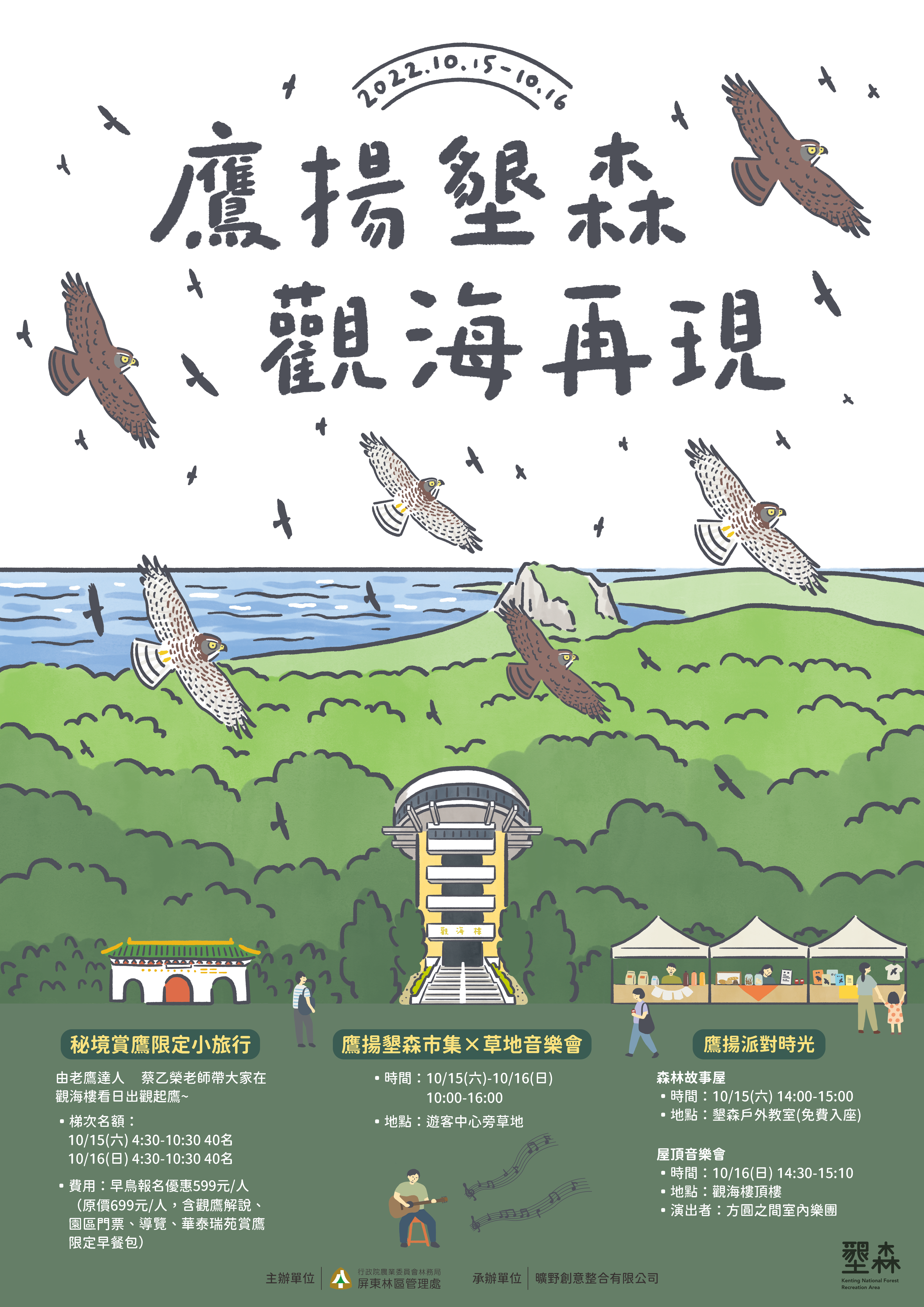 「觀海樓」為墾森園區內最富盛名的景點之一,也是墾丁至高點,可360度一次眺望台灣海峽、巴士海峽、太平洋,是縱覽墾丁及半島美景不可錯過的秘境。為提升建物安全與服務功能自109年起整修,即將於111年10月15日(六)對外正式服務啟用,更委請知名飯店業者-華泰瑞苑進駐營運管理,提供遊客精緻餐飲與森林遊憩新體驗。 適逢恆春半島猛禽過境賞鷹盛事,林務局屏東林區管理處於10/15-16特別推出「鷹揚墾森.觀海再現」系列活動,包含秘境賞鷹限定小旅行、森林市集、故事屋、屋頂音樂會等系列活動,週末陪遊客一起賞鷹開森玩。 秘境賞鷹限定小旅行僅於10/15(六)、10/16(日)辦理2場次活動,邀請到老鷹達人-蔡乙榮老師進行賞鷹導覽,從清晨4時30分至10時30分,森友們將獨家享受觀海樓頂絕美日出、壯觀起鷹景致,同時可搶先享用華泰瑞苑特製之「賞鷹限定早餐包」。活動採線上預約報名,每場次共有40名額,10月10日前報名更享有早鳥優惠價,現在就上網預約。 週末期間還有多項豐富活動,墾森首次舉辦「森林市集」,邀請遊客一同在林蔭下悠遊野餐;「森林故事屋」於10/15(六)14:00在墾森戶外教室登場,在森林午後微風下,由說故事姊姊以生動有趣說故事方式,帶大小朋友聽聽老鷹的故事並動手DIY;「屋頂音樂會」則於10/16(日) 14:30-15:10在觀海樓屋頂演出,邀請到留法歸國、有「巴黎吉他詩人」之稱的蔡世鴻老師,帶領方圓之間室內樂團進行演出,在優美樂聲及環海美景下,將帶給遊客嶄新的視聽饗宴與感受。園區活動皆免費參加,座位數量有限,有興趣遊客當日可盡早入座。 此外,為邀請更多民眾共襄盛舉「鷹揚墾森.觀海再現」系列活動,屏東林區管理處特別推出在10/15(六)、10/16(日)二日前100名入園之遊客,可至遊客中心領取限量小禮;另於觀海樓拍照打卡則可抽森林市集購物金,送完為止。詳細活動內容與報名資訊,請至「墾丁國家森林遊樂區」官方粉絲頁https://www.facebook.com/ktforestarea/查詢。
