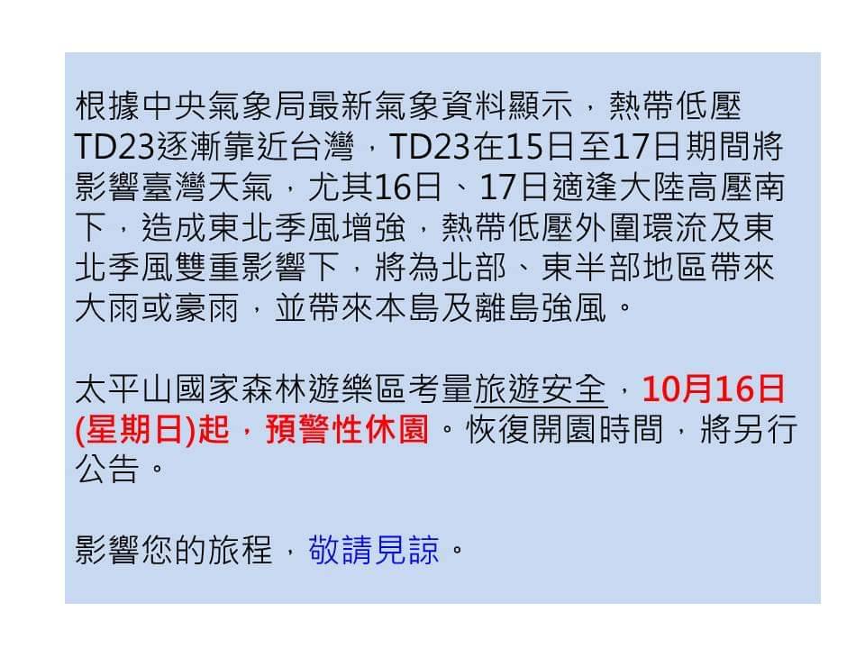 根據中央氣象局最新氣象資料顯示,菲律賓東方熱帶性低氣壓TD23於今(15)日下午增強為今年第20號颱風尼莎,氣象局於下午4點發布海上颱風警報。 TD23在15日至17日期間將影響臺灣天氣,尤其16日、17日適逢大陸高壓南下,造成東北季風增強,熱帶低壓外圍環流及東北季風雙重影響下,將為北部、東半部地區帶來大雨或豪雨,並帶來本島及離島強風。 太平山國家森林遊樂區考量旅遊安全,10月16日(星期日)起,預警性休園。恢復開園時間,將另行公告。