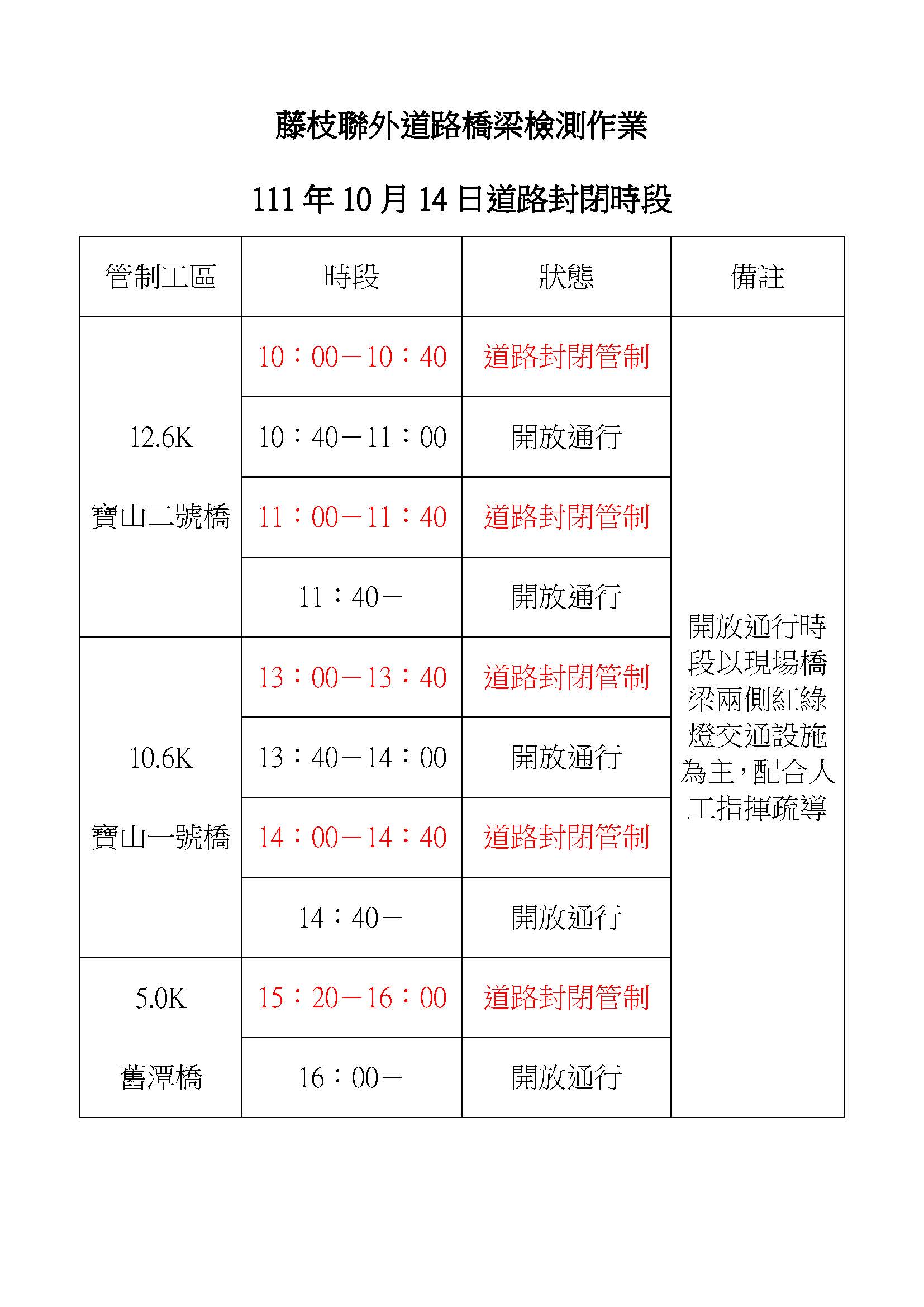 為維持橋梁系統達設計使用目的及維護人車安全,橋梁定期檢測與維護作業為橋管單位重要工作,屏東林管處為提升藤枝聯外道路橋梁通行安全,預定111年10月14日於高雄市桃源區藤枝聯外道路之舊潭橋(5.0K)、寶山一號橋 (10.6K)、寶山二號橋(12.6K)等3座車行橋梁進行檢測作業。 檢測作業所需重機械檢測車輛,將佔用橋面全車道進行檢測,為維護遊客及車輛安全,檢測期間將管制橋梁通行,現場採分時段暫封閉道路並進行人車管制,屆時請民眾配合現場交管指揮,近橋頭2端車輛請靠右依序停置,勿靠近工區,以維安全。 屏東林區管理處再呼籲提醒過往民眾經過該封閉路段,請遵循現場工作人員的管制措施,檢測作業期間造成不便之處,請民眾見諒。 橋梁封閉管制時段如下: 1.舊潭橋(5.0K):15:20~16:00 2.寶山一號橋 (10.6K):13:00~13:40;14:00~14:40 3.寶山二號橋(12.6K):10:00~10:40;11:00~11:40