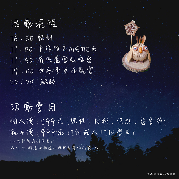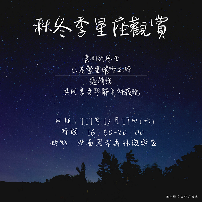 12月氣溫微涼且乾燥,適合夜間賞星,但苦於找不到適合地點嗎?推薦一處觀星好所在!花蓮林區管理處池南國家森林遊樂區將於12月17日舉辦「秋冬季星座觀賞」活動,從下午開始先走訪園區內豐富林業機具、觀賞多元動植物生態,接著品嘗有機美食,再跟隨天文專家陳冠榮的腳步觀星,一系列生態永續遊程,帶來滿足味覺及視覺的饗宴,快來報名。 林管處表示,池南國家森林遊樂區坐擁群山,鮮少光害,且鄰近花蓮市區交通便利,非常適合賞星。今年首度推出夜間觀星的生態永續遊程,邀請花蓮縣天文協會理事長陳冠榮老師,帶領民眾一窺仙女座、金牛座、獵戶座等冬季星座,以及神祕的火星及木星;晚餐由推動棲地保育、生產生活生態「三生」理念的青陽農場,提供有機的無菜單料理;還可以在園區內DIY製作貓頭鷹造型種子Memo夾,瞭解貓頭鷹、認識森林種實生態,共度寧靜且美好的夜晚。 活動自11月28日9點起開放線上報名,名額20人,額滿為止,適合6歲以上的親子及一般民眾參與。個人優惠價599元、親子組優惠價999元(1位大人及1小孩),皆材料1份、課程費、保險與風味餐費用,不含門票與停車費,交通須自理。 請由池南國家森林遊樂區Facebook網路表單(報名網址:https://reurl.cc/zrlKz7)進行線上報名與匯款,相關問題歡迎來電池南國家森林遊樂區洽詢(03)864-1594#13。