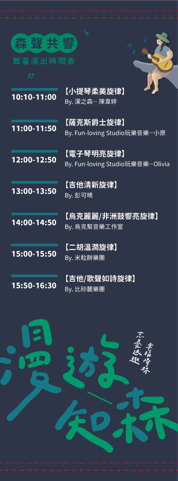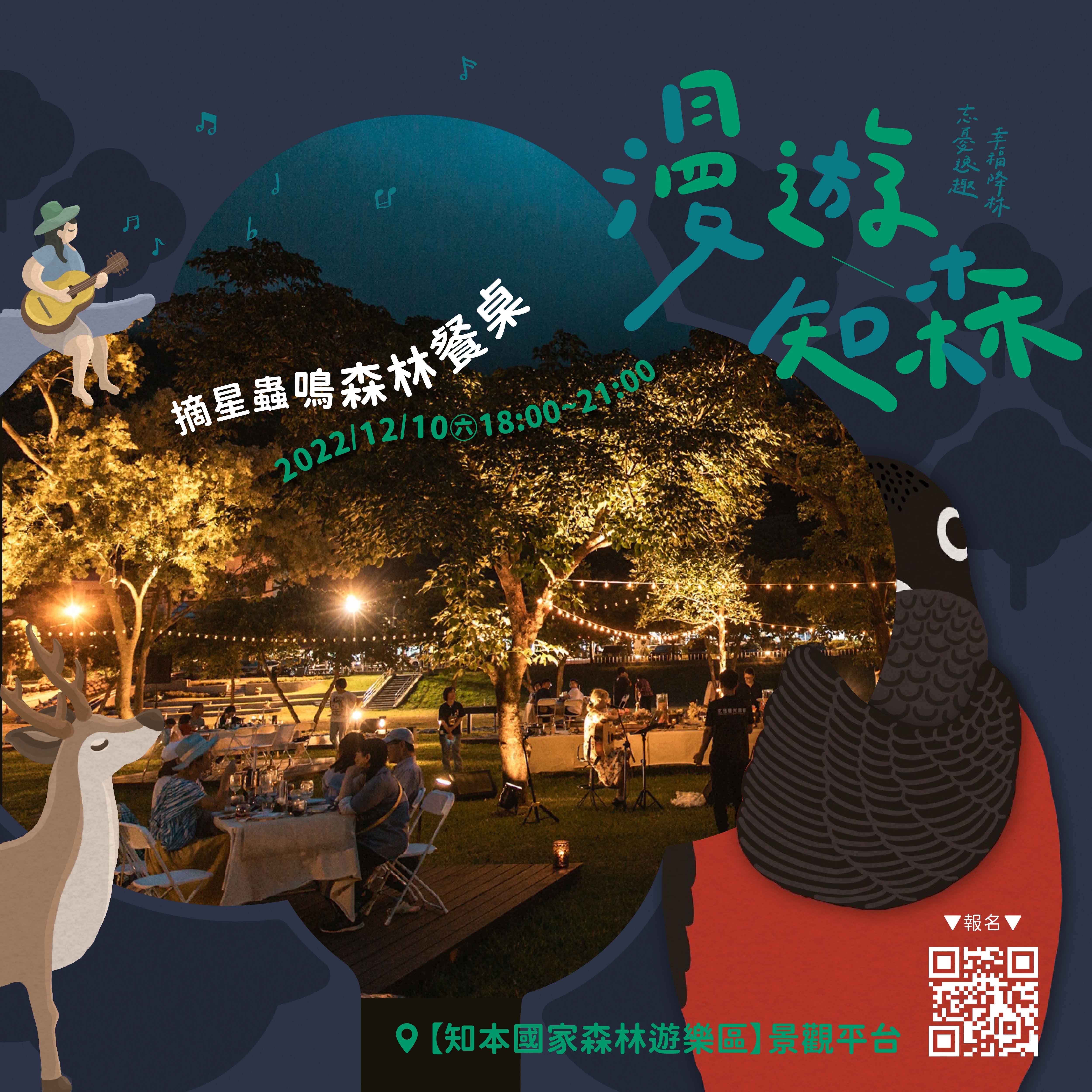 知本國家森林遊樂區擁有豐富的森林生態,四季展現不同迷人的大自然樣貌,周邊還有不少聞名的泡湯溫泉及特色景點,入冬之際適合安排一趟療癒身心的小旅行。行政院農委會林務局臺東林管處將於12月10日(週六)舉辦「漫遊知森」森林派對,藉由四大主題打開五感體驗:美感與文青味十足的「森林市集」、多元音樂表演的草地舞台「森聲共響」、不分日夜探索園區的「日/夜走讀森林導覽」,以及首度上菜、星空下品美食的「摘星蟲鳴森林餐桌」,邀請民眾入園放鬆身心靈、悠哉逛購文青市集、慢嚐各式美食、隨音樂搖擺,適合全家一起體驗森林野趣與藝文情調。 「漫遊知森」森林派對系列活動12月10日(週六)上午10時精彩登場,療癒身心靈的「森情Life呼吸市集」匯集40個類別的攤位,含括織品、陶藝、皮革、繪畫等手作文創、多肉植物及環保工藝、舒緩身心的按摩、精油和占卜,以及特色獨家美食,呈現在地生活與美學;「森聲共響」草地舞台演出,帶來包含小提琴、薩克斯風、電子琴、烏克麗麗、非洲鼓、二胡及吉他等多元風格的音樂演出,民眾坐臥草地野餐跟著旋律搖擺肢體,感受融入森林的忘憂逸趣。園區遊客服務中心二樓「千根榕意境館」運用國產材打造專屬木育遊戲空間,從12月10日起開放,設置了螺旋木琴、進擊卡拉球、乘風破浪、木球旅行等7種互動型遊具,適合親子共玩同樂,在遊戲中感受國產木材的溫潤美好,體驗森林生態永續的教育精神。 位於海拔100-650公尺間亞熱帶季風林的知本國家森林遊樂區,蘊藏豐富的林業、鳥類及昆蟲物種,構成一間豐饒的生態教室,活動提供免費日間園區導覽,只要線上報名,便能體驗由專業解說人員帶領走讀園區、認識各類動植物的旅程。此外,林間夜行性野生動物、兩棲爬蟲及昆蟲生態世界豐富,讓民眾探索夜間隱藏林間驚奇的【夜探知本】活動,將揭開夜森林的神秘面紗。 寧靜的森林夜晚,園區首次以大自然作為慢食的浪漫場域,在響著蟲鳴的璀璨星空下,邀民眾品嚐貼近臺東孕育出的人文風土特色料理的【摘星蟲鳴森林餐桌】,以在地新鮮食材入菜,職人精神料理的美食饗宴,細品慢嚐食物與土地的情感連結,從味蕾體現臺東慢食生活的態度。 臺東林管處吳昌祐處長表示,臺東林管處不斷提升知本國家森林遊樂區的軟硬體設施品質,就是要打造一座森林讓人能大口呼吸新鮮空氣、抒解身心壓力,同時走讀森林的藝文五感育樂場域,園區透過每年入冬歲末舉辦「漫遊知森」活動,邀請民眾共享從白天至夜晚的美好體驗,讓森林帶走累積的疲憊,舒緩緊繃的身心,希望森林成為民眾找回和大自然連結及生活休閒的新選擇。 「漫遊知森」系列活動即日起開放線上報名,日間導覽活動免費參加,以及【摘星蟲鳴森林餐桌】套票$1300含括森林餐桌、夜間導覽及入園門票,有興趣民眾可上網預購。最新活動訊息請鎖定林務局臺東林管處知本國家森林遊樂區-返璞歸真粉絲專頁: https://m.facebook.com/profile.php?id=100064594815780