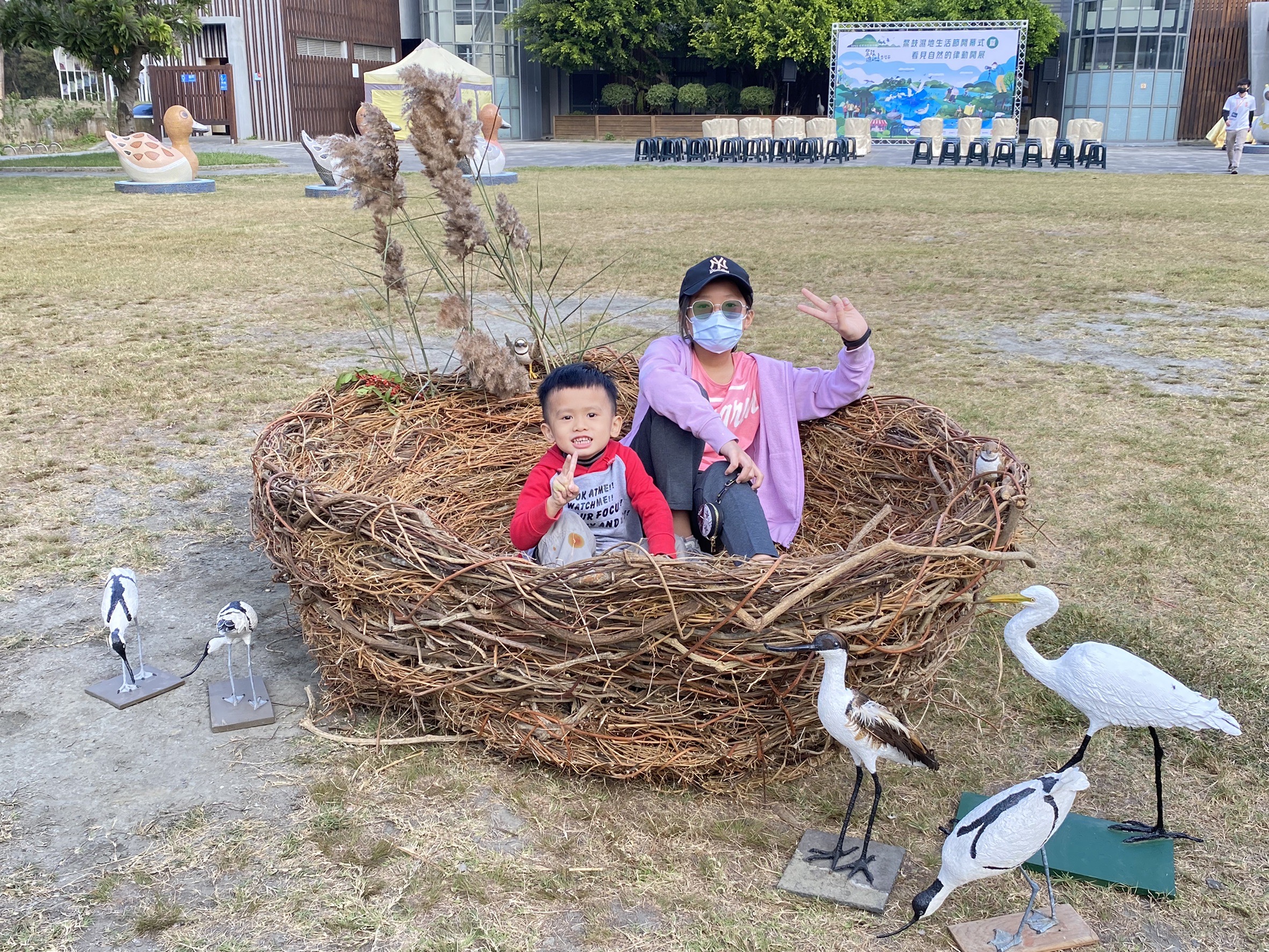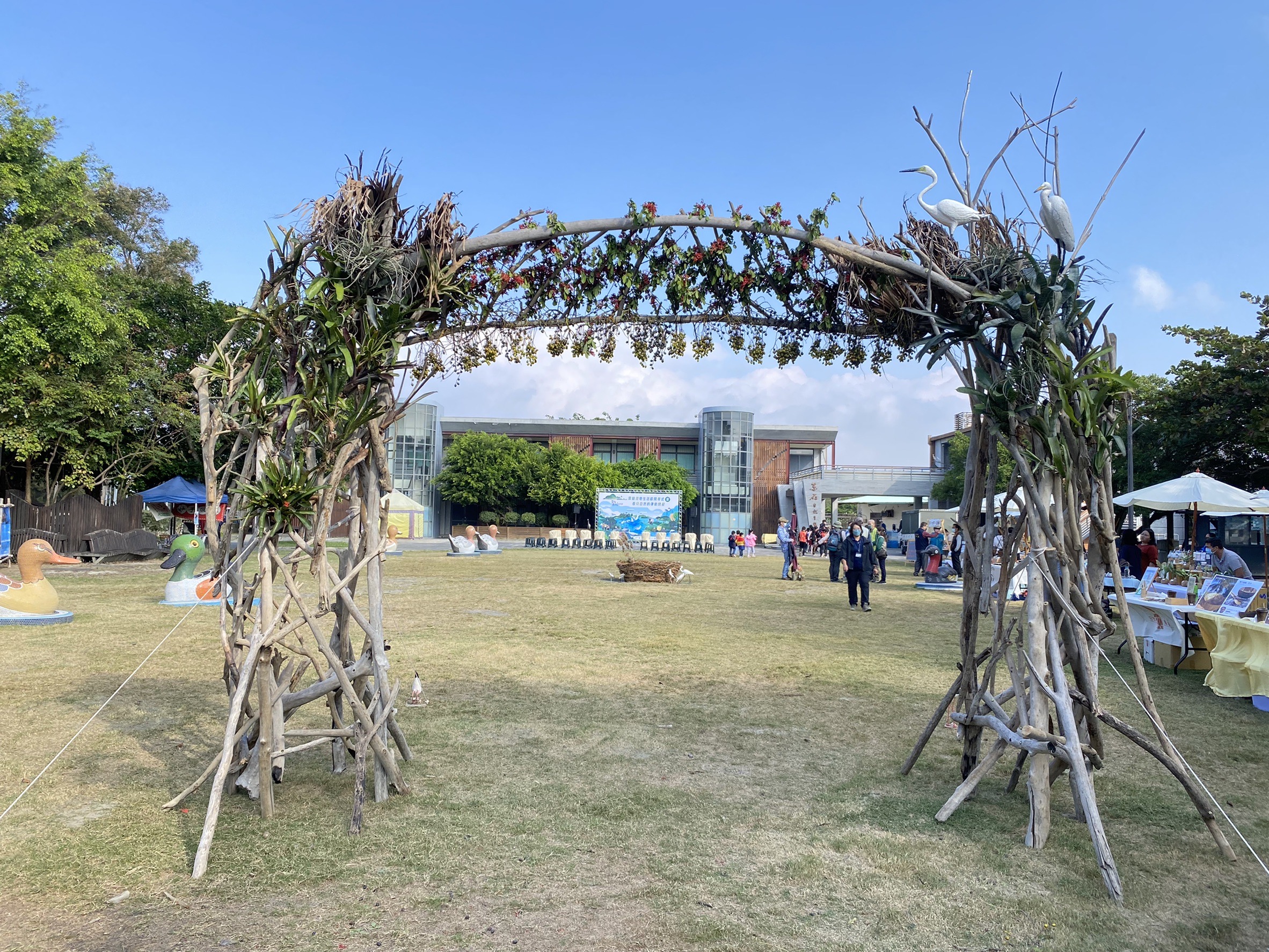 市集入口意象「森活起點」拱門的設計源自「開始」的概念,由大地藝術家撿拾鰲鼓濕地北堤的漂流木,結合廢棄保麗龍製成濕地鳥類公仔意象,讓民眾進入拱門拍照打卡時,也能體會循環經濟廢棄物再利用的重要性。生存與繁衍是演化中的兩大課題,而鳥類為繁衍所付諸的努力,幾乎全投注在鳥巢之上,市集現場以10多種藤類及樹枝編織技藝,集結20位大地藝術家,耗時一個月模仿鳥類製作「巨型鳥巢」,讓民眾感受鳥類辛勞築巢的成果,也蘊含鰲鼓濕地生態保育的價值。