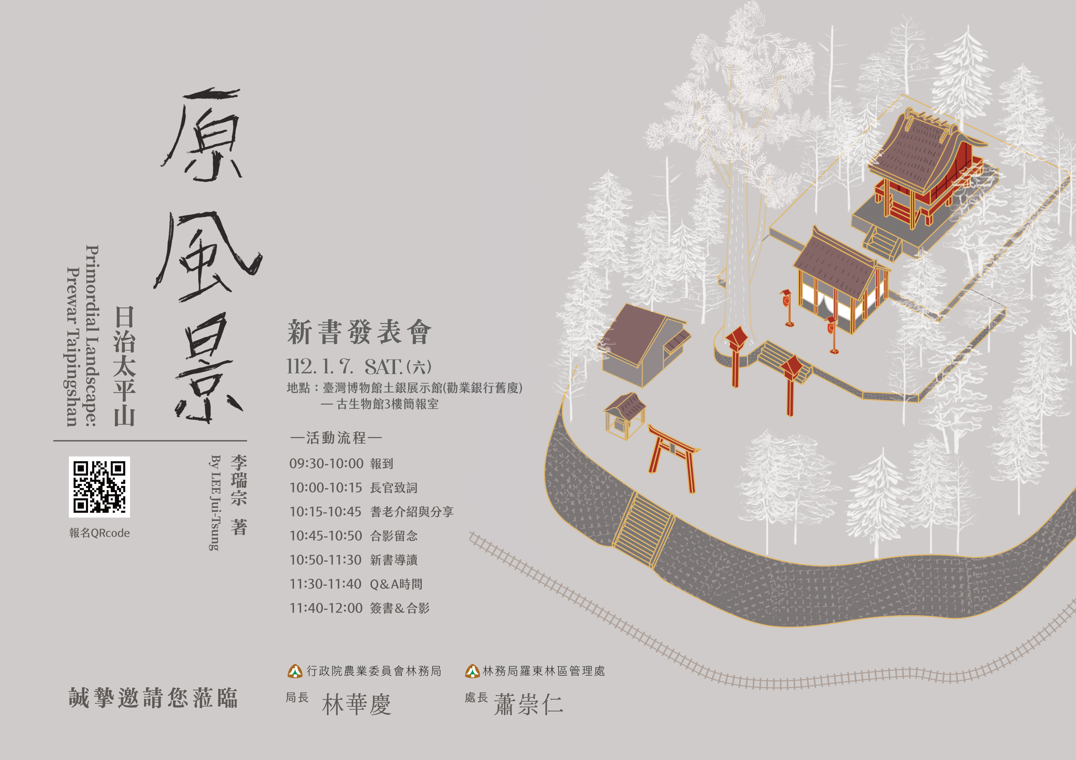 林務局羅東林區管理處與古道專家李瑞宗老師合作,於去(110)年出版的《再凝望,戰後太平山》一書榮獲國史館臺灣文獻館及文化部金鼎獎肯定外,今年也入圍台北國際書展;該書的姊妹作《原風景,日治太平山》新書已完成著作,將新舊太平山的歷史風貌完整亮相。羅東林區管理處訂於112年1月7日(星期六)上午10:00-12:00於臺灣博物館土銀展示館(古生物館3樓簡報室)辦理新書發表會,限額70名,參加可獲得精美紀念品及新書首購優惠價,歡迎民眾報名。(報名網址:https://reurl.cc/rZXnGN)。 李瑞宗老師透過實地踏勘,解析文史資料及老照片,以考古、偵探的精神抽絲剝繭找出舊太平山時期的林業技術,特別對於複雜的山地軌道系統進行釐清,首次揭露在舊太平山軌道有4層主線分布,當時最早沒有機關車頭的年代,是以牛隻拖拉台車回到集材區等有趣的故事;另外也發現鎮安宮前身的神社,其實是由舊太平山的加羅山神社遷移過來;訪問經歷日治時期的林業耆老,有許多精采的生活點滴,也公開珍貴的老照片,讓本書未來將成為研究舊太平山的必讀指引。 太平山國家森林遊樂區是國內知名的森林育樂場域之一,有著中高海拔的自然四季美景,吸引許多民眾賞遊,早期也與阿里山及八仙山並列為臺灣三大林場,因此,也有著豐厚的人文歷史。林務局羅東林區管理處力邀知名作家李瑞宗老師合作出版《原風景,日治太平山》新書,讓讀者有機會看見許多未曾公開的舊太平山林場工作、生活故事及影像。