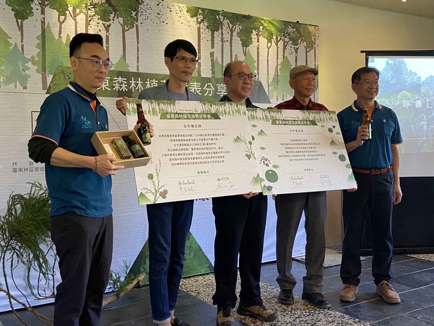 臺東林區管理處為促進國產材全材利用、推廣原生植物及森林資源永續經營,積極開發木材以外具發展潛力之森林資源多元產品,推動林業剩餘資材再利用及原生植物創新加值產品,今(26)日假臺東林管處的策略聯盟飯店-伊塔原旅發表推出的臺東森林植萃系列-「解碼柳杉」精油衍生產品及「日沐青釀」系列啤酒,這是該處一年多來與在地社會企業及林農夥伴攜手合作,以森林自然原生的五感概念為基礎,將植物精萃成分運用在研發身體清潔、環境香氛系列及酒精氣泡飲料商品的重要成果,期盼能透過森林原生植萃的轉化應用,推廣國產材資源及原生植物多元運用。 近年來林務局致力推動國產材振興計畫,同時也期望能讓疏伐後的林木剩餘資材,透過創意加值運用增加其經濟價值,達成全材利用的重要效益;今日所發表「解碼柳杉」精油系列產品,主要包括「身體潔淨露」、「精油滾珠瓶」及「精油香氛噴霧」,是臺東林管處與璞草園農創產業有限公司合作,運用來自於柳杉人工林疏伐後剩餘的枝條及葉片,透過分解萃取出之精油而研發而成的多元產品。另該處為持續推廣原生植物,目前已掌握近2百餘種原生樹種的苗木培育方式,除了持續提供林木生產、生態支持、環境綠美化及蜜源植物苗木需求外,也與臺東在地知名品牌-聖果蜜多股份有限公司合作,以臺灣原生檸檬-臺灣香檬果實為原料,推出「日沐青釀」-臺灣香檬風味啤酒系列,以英式啤酒為基底,結合臺東森林蜜及柴燒煙燻烏梅調味,來襯托臺灣香檬果實的特殊清香,是兩款層次豐富的啤酒單品,期待能讓民眾以另外一種感官模式認識臺灣原生植物,體驗啤酒花與臺灣原生樹種果實所交織呈現的酒精氣泡飲品。 在今(26)日臺東森林植萃發表會中,臺東林管處也安排由該處吳昌祐處長分別與「璞草園農創產業有限公司」許仁和董事長及「聖果蜜多股份有限公司」何介臣董事長簽署合作備忘錄,期盼雙方能在互惠的基礎上持續合作,發展及推廣臺東森林植萃產業;臺東林管處吳昌祐處長表示,未來會持續深化及加強與臺東在地有意願的廠商及夥伴的合作,並評估及規劃將研發成果轉化成輔導量能,對有意願參與相關產業發展的在地社區或部落等夥伴提供技術諮詢輔導工作,為發展森林資源永續友善利用及推廣臺東森林植萃的美好願景努力。