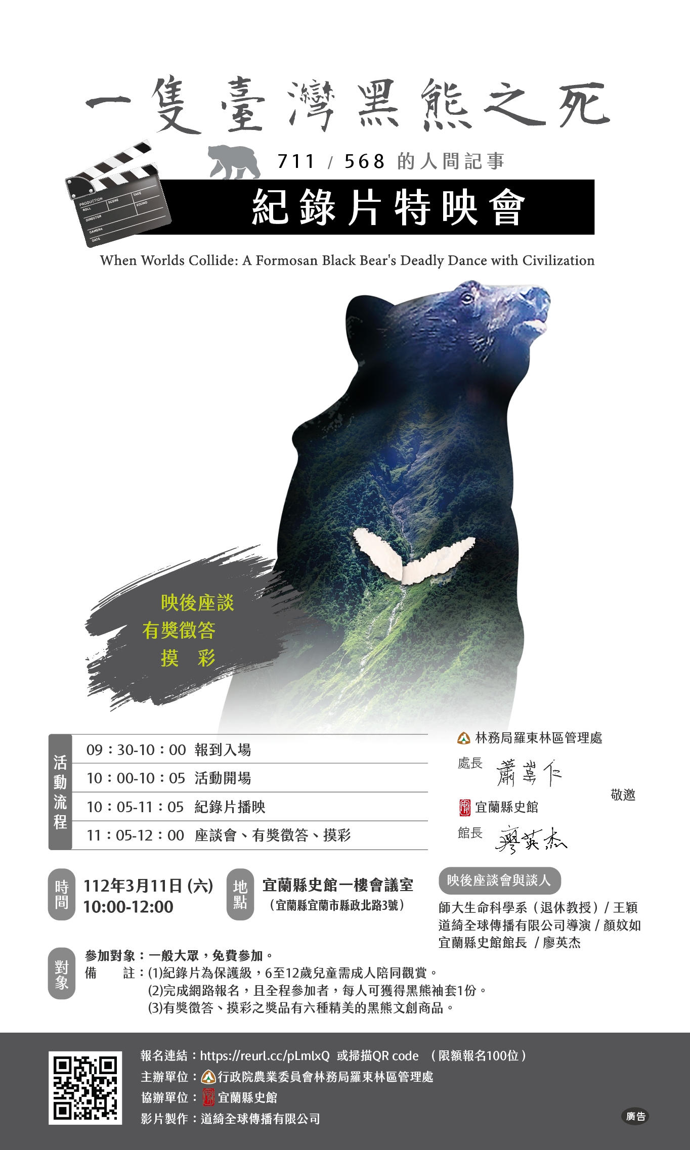 林務局羅東林區管理處與宜蘭縣史館合作,將在3月11日(星期六)上午10:00-12:00於宜蘭縣史館一樓會議室,舉辦由林務局製作的生態人文紀錄片《一隻臺灣黑熊之死:711/568的人間記事》特映會;本場次將邀請師範大學退休教授王穎、縣史館館長廖英杰、紀錄片導演顏妏如等三位,進行映後座談會、有獎徵答、摸彩,獎品有6種黑熊文創紀念品。場地座位有限,僅開放100位,歡迎民眾踴躍參加,完成網路報名(連結已下架)之全程參加者,將可獲得一份黑熊紀念袖套。影片為保護級,6到12歲兒童需父母陪同觀賞。 臺灣黑熊是臺灣唯一原生的熊科動物,但由於人類對環境的開發利用,使得野外黑熊棲息地大幅縮小,也變得更零碎,個體數量則是越來越少。林務局製作的生態人文紀錄片《一隻臺灣黑熊之死:711/568的人間記事》,片中紀錄東卯山黑熊歷經兩度救援、野放,最終遇害的過程。林務局羅東林區管理處特地與宜蘭縣史館合作,定於3月11日(星期六)上午10:00-12:00,於宜蘭縣史館一樓會議室舉辦特映會,邀請民眾踴躍參加,以思考人與熊如何走向更友善的未來,讓我們共同保育臺灣黑熊,為這塊土地上的所有野生動物而努力。 編號711的大公熊原為林務局東勢林區管理處所繫放的研究個體。109年10月1日,牠疑似在穿越果園時誤中了陷阱而受困;隔年1月23日,711大公熊再次落入陷阱,經過專家評估後,最後決定將其換上新編號568,並選擇在南投丹大野生動物重要棲息環境進行「異地野放」,不料,最終568仍然不幸身亡,在111年5月6日發現了牠被掩埋的遺體。