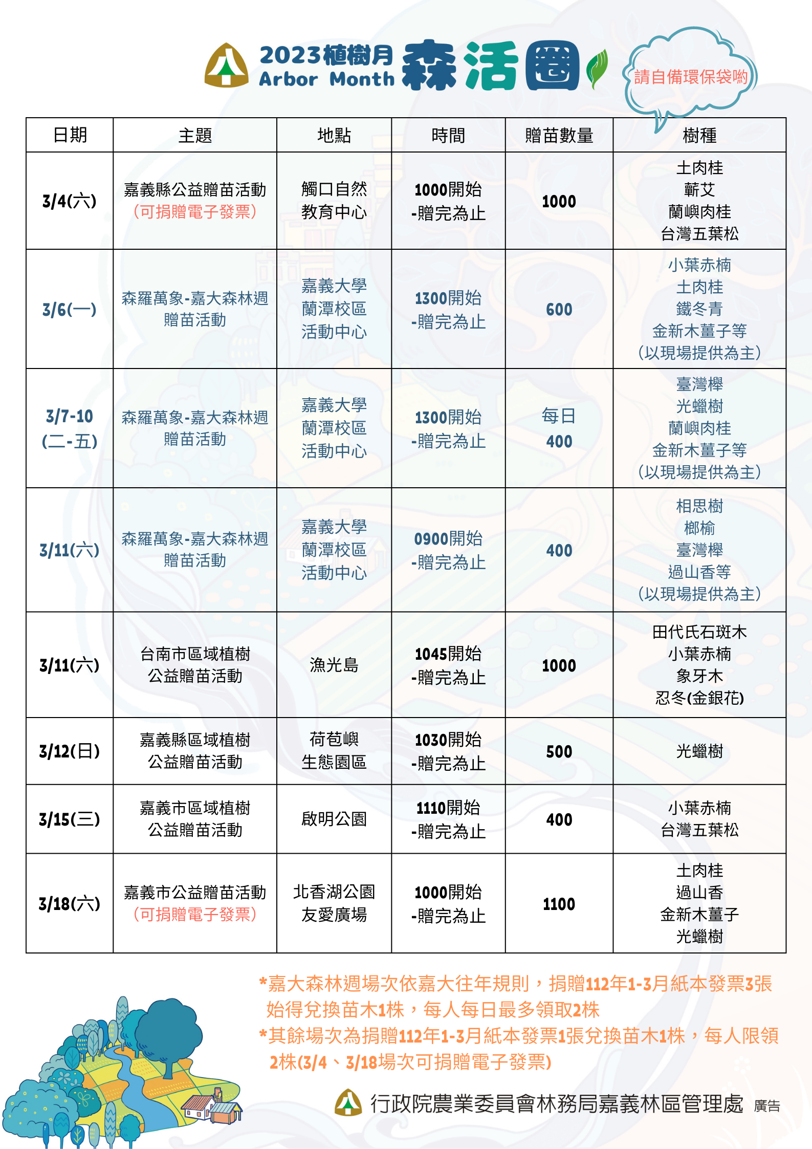 嘉義林管處植樹月另外贈苗活動地點有3月6日至3月11日(星期一至六)於嘉義大學蘭潭校區活動中心(配合嘉義大學主辦之嘉大森林週,兌換苗木方式依嘉大規則辦理);3月11日(星期六)於臺南市漁光島;3月12日(星期日)於嘉義縣荷苞嶼生態園區等10場次,各場次活動細節及贈送樹種詳場次表或洽嘉義林管處(電話05-2787006#374 黃小姐)詢問,苗木數量有限,送完為止。