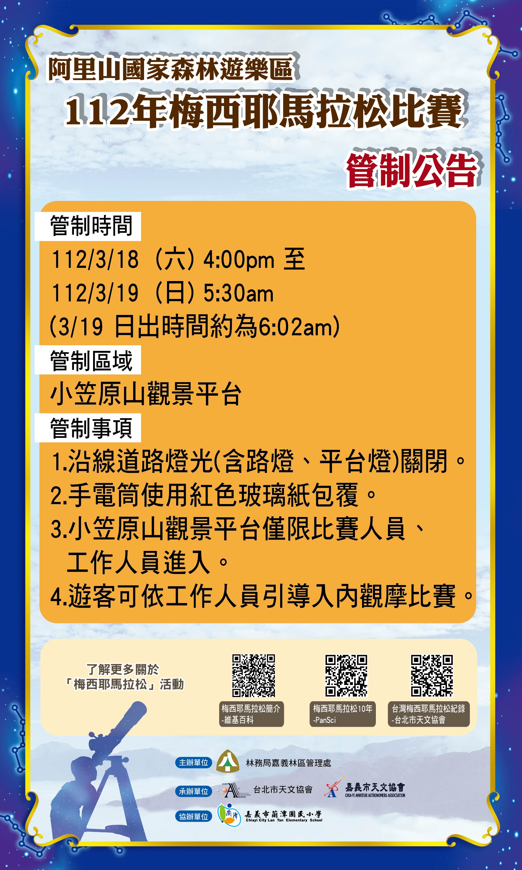 112年3月18-19日「2023梅西耶馬拉松」天文饗宴即將在阿里山國家森林遊樂區舉辦,各地天文好手齊聚阿里山,要挑戰用一晚的時間觀測「梅西耶星表」110個深空天體的活動,也會管制比賽場域-小笠原山觀景平台,對天文有興趣的朋友請至指定區域觀賽,與參賽者共同觀賞一年一次的國際天文盛事。 與星星賽跑的梅西耶馬拉松,是法國天文學家梅西耶及後代天文學家將星雲、星團和星系等天體編排後發表之梅西耶星團星雲列表,總數達110個,選手們要在日落之際開始,經過整夜直到日出才能看遍這110個目標;觀察這些天體首重緯度,需在北半球低緯度的地方觀測,及在每年3、4月和不受月光影響的朔月時期的「天時」,配合無光害、無遮蔽,具360度無死角觀景的「地利」條件,林務局嘉義林區管理處表示,小笠原山觀景平台不僅符合梅西耶馬拉松基本的條件,因為海拔高2,488公尺,大氣透明度更高,大大提高觀測目標物的清晰程度。 今年嘉義林管處再度與臺北市立天文科學教育館、臺北市天文協會、嘉義市天文協會合作辦理「2023梅西耶馬拉松」,希望透過此項國際性的觀星比賽宣導星空保育、生態永續的理念;並將阿里山國家森林遊樂區小笠原山星空美景,推廣成為全球各地遊客朝聖觀星的聖地。 觀賽須知 3月適逢阿里山花季,人潮眾多,為了讓參賽選手不受光害影響、發揮觀星實力,締造阿里山梅西耶馬拉松佳績,小笠原山觀景平台將在3月18日下午4時至3月19日上午5時30分,進行人員及燈光管制,屆時將關閉周邊道路燈光。觀賽民眾3月18日下午7時可於遊客中心搭乘電動遊園車到達祝山,再步行至小笠原山觀星,並依現場工作人員指示,將照明燈具包覆紅色玻璃紙分批進入平台,活動於3月19日日出前結束,隨即開放觀日出。 林管處表示,因為本活動屬競賽性質,現場不提供觀星解說,請民眾遵守觀賽禮儀,禁止使用綠光雷射筆避免干擾參賽人員,呼籲民眾一起為參賽選手提供天時、地利、人和之最佳競賽條件,能在全臺最佳的觀星地點阿里山國家森林遊樂區小笠原山觀景平台創造出完賽的成績。