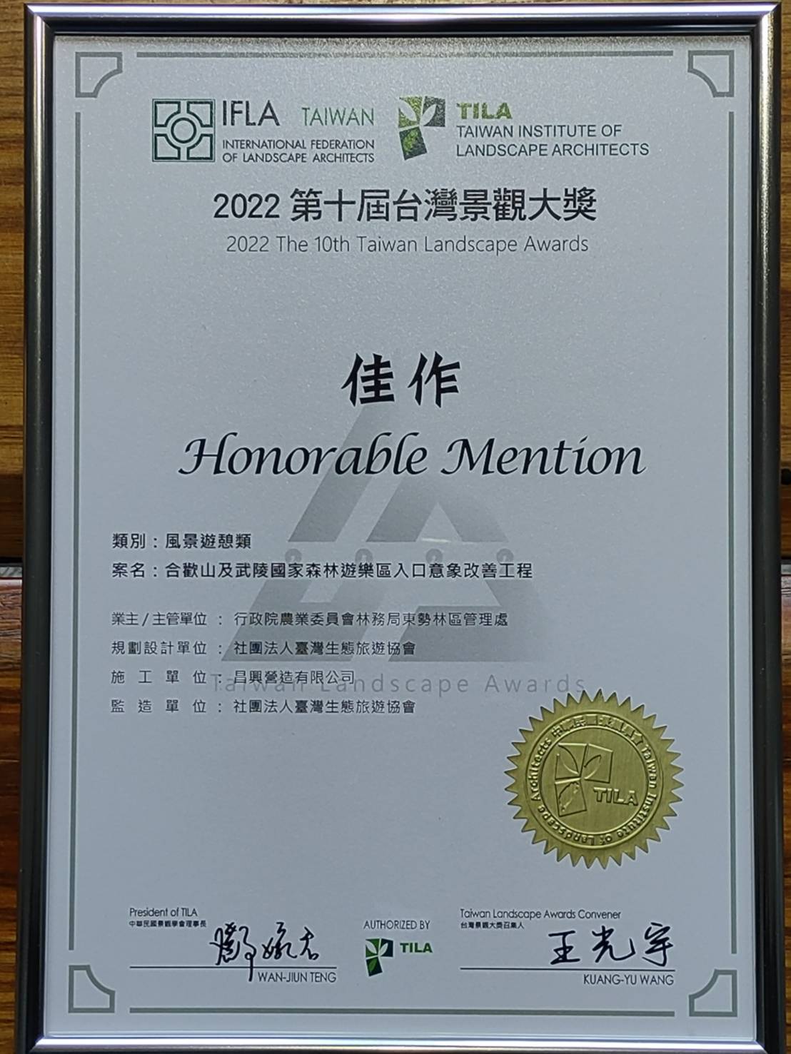 武陵及合歡山為台灣中高海拔生態環境重要體驗場所,合歡山更為高山熱門旅遊與觀星景點,東勢林區管理處為提升武陵及合歡山自然山林之旅遊品質,凸顯武陵及合歡山國家森林遊樂區之獨特性,特別融入周邊景觀特色,打造煥然一新的入口意象,成為武陵及合歡山地區的新地標,因獨具特色除榮獲行政院農業委員會110年度優良農業建設工程獎設施類優等獎,今再榮獲中華民國景觀學會辦理「第十屆台灣景觀大獎」風景遊憩類之佳作獎項。 東勢林區管理處於110年在武陵、松雪樓及昆陽參處據點設置獨特的入口意象,武陵以彰顯進入遊樂區範圍,樹立新地標,以提供遊客休憩、取景的舒適環境,合歡山選擇奇萊山主峰及北峰雄偉的山岳特色為背景,並以合歡山之山巒重疊意象,作為地景裝置藝術的元素,同時融入高海拔雪地色調題材,以彰顯合歡山入口意象景觀區之特色及價值感。另外東勢林區管理處為配合「合歡山國際暗空公園」之設立,更以貼心的設計手法,在昆陽景觀區設置斜躺、高背木質座椅及木平台,使遊客能以坐或躺的方式,盡情的觀星、賞月及仰望天空燦爛的銀河,因此獲得台灣景觀大獎殊榮。 東勢處表示,合歡山昆陽入口意象景觀區,也維持原有的停車功能,並將停車場重新規劃,增設了機車停車位,使停車動線及秩序更為流暢,為即將來臨的2023年合歡山杜鵑花季,提供優質舒適的停車空間,實為全家出遊、賞花、休憩與天文愛好者,從事觀星攝影的好去處。