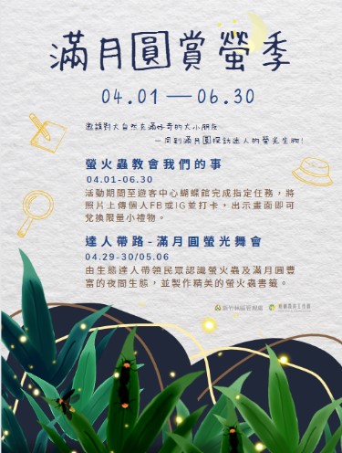 滿月圓螢火蟲季到囉!新竹林區管理處轄屬滿月圓國家森林遊樂區,除擁有良好的水質以及豐富的動植物生態資源,於適切的經營下,更是螢火蟲良好的生活棲地,歷年園區螢火蟲的點點螢光,也在大家心中留下美好的回憶。今年滿月圓國家森林遊樂區遊客中心委託經營團隊自4到6月辦理【滿月圓螢火蟲季】,推出現場活動【螢火蟲教會我們的事】,並訂於4月29日、4月30日、5月6日夜間舉行預約活動【達人帶路-滿月圓螢光舞會】,邀請喜愛大自然觀察的大小朋友,跟著我們的腳步探訪滿月圓迷人的螢光生物。 遊客中心委託經營團隊辦理的現場活動【螢火蟲教會我們的事】自4月1日起至6月30日止,邀請來訪滿月圓民眾一同響應賞螢三不原則,不干擾、不捕捉及不傷害,共同維護螢火蟲生態讓螢火蟲能永續生存,凡前往蝴蝶館完成指定任務並上傳照片打卡,即可兌換滿月圓專屬小禮物乙份。此外,4月29日、4月30日、5月6日舉辦三梯次預約活動【達人帶路-滿月圓螢光舞會】,由生態達人帶領民眾深入夜間的滿月圓,認識園區螢火蟲及豐富的夜間生態,並製作精美的螢火蟲書籤。本活動採預約報名制,自3月29日上午10時起開放報名,限量90位名額,每梯次開放30人,額滿為止。 滿月圓國家森林遊樂區開放時間為非假日上午8時及假日上午7時,閉園皆為下午5時。歡迎民眾把握機會參加螢火蟲主題活動,認識精采有趣的滿月圓夜間生態。相關活動資訊請詳見「滿月圓國家森林遊樂區臉書粉絲專頁」,活動洽詢專線(02)2672-0542滿月圓國家森林遊樂區遊客服務中心(08:30-17:00,週二休館)。