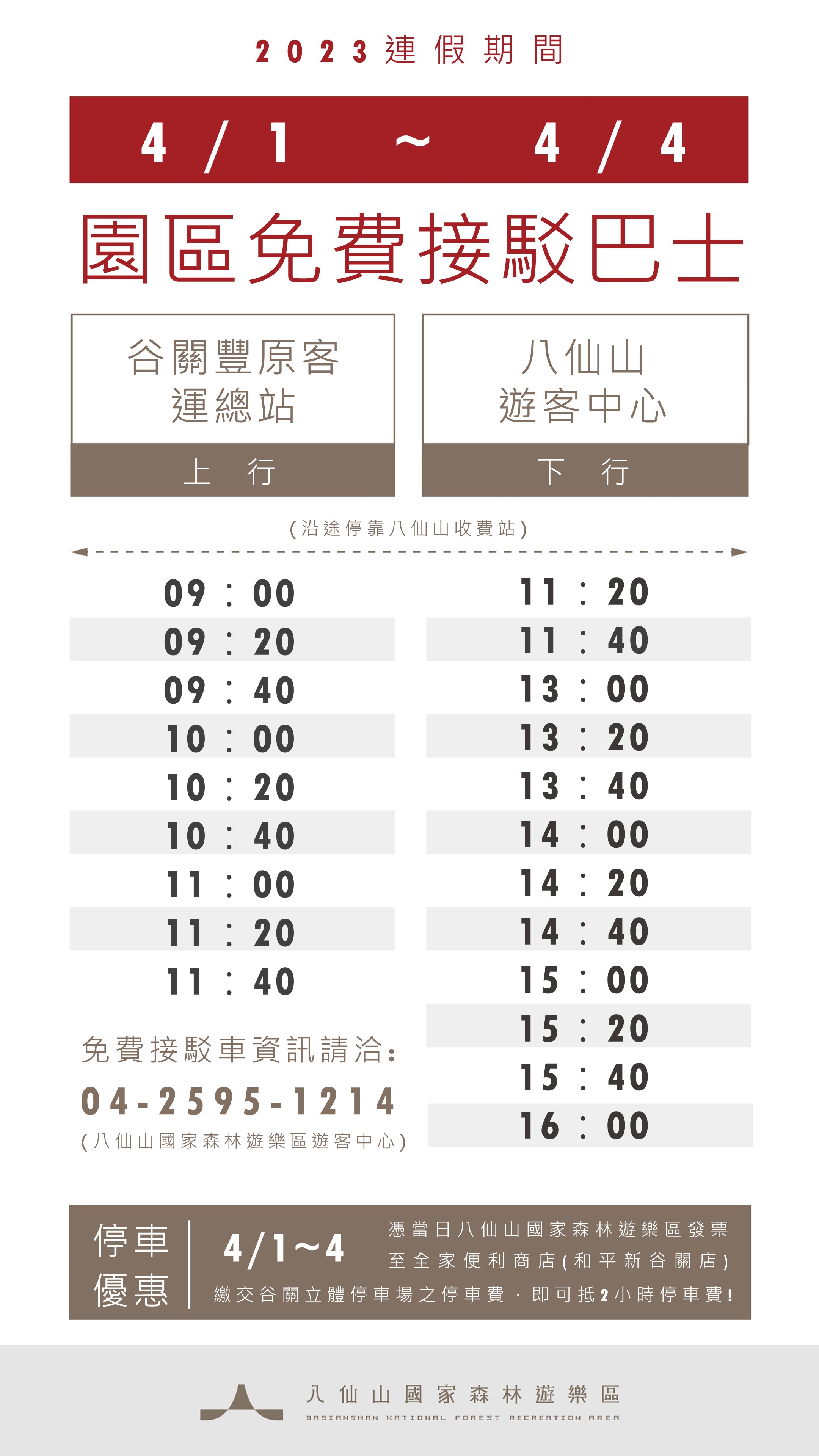 今年兒童節清明5天連假,大雪山及八仙山森林遊樂區12歲以下兒童入園可享免費,歡迎家長們帶著孩子,一同前往享受春日的美好。 林務局東勢林區管理處為慶祝兒童節,4月1日至5日連假期間,12歲以下兒童可免費進入大雪山及八仙山森林遊樂區,除此之外,大雪山森林遊樂區更於4月1日至3日舉辦有夜間生態觀察活動,活動費用為300元,3~7歲可享150元之優惠,3歲以下兒童可免費參加。 另為讓遊客輕鬆到達八仙山森林遊樂區,免於找無停車位之苦,4月1日至4日提供谷關至園區免費接駁巴士服務,時間自早上9點00分至下午4點00分,從豐原客運谷關站至八仙山森林遊樂區,且持有該遊樂區入園發票,至全家便利商店(和平新谷關店)繳交谷關立體停車場之停車費,即可折抵2小時停車費,輕鬆又划算,如有相關問題,可撥打八仙山遊客中心(04)25951214電話洽詢。 天氣日漸變熱,園區內各類植物隨著春天的腳步吐新芽換新裝,涼爽舒適的氣溫,是最天然舒適的紓壓環境,大雪山遊樂區霧社櫻在潔白的花朵間逐漸綻露新葉,山胡椒花則散發淡淡優雅的香氣,八仙山遊樂區涓涓的溪水,飛濺出強身健體的負離子,無論在步道上慢行或沉浸在親水池中,都讓身心煥然一新,遊客中心更以全新面貌開放服務,結合國產竹木設計,展現獨特山林魅力。 相關旅遊資訊,請洽大雪山遊客中心(04)25877901、八仙山遊客中心(04)25951214,或至台灣山林悠遊網查詢。