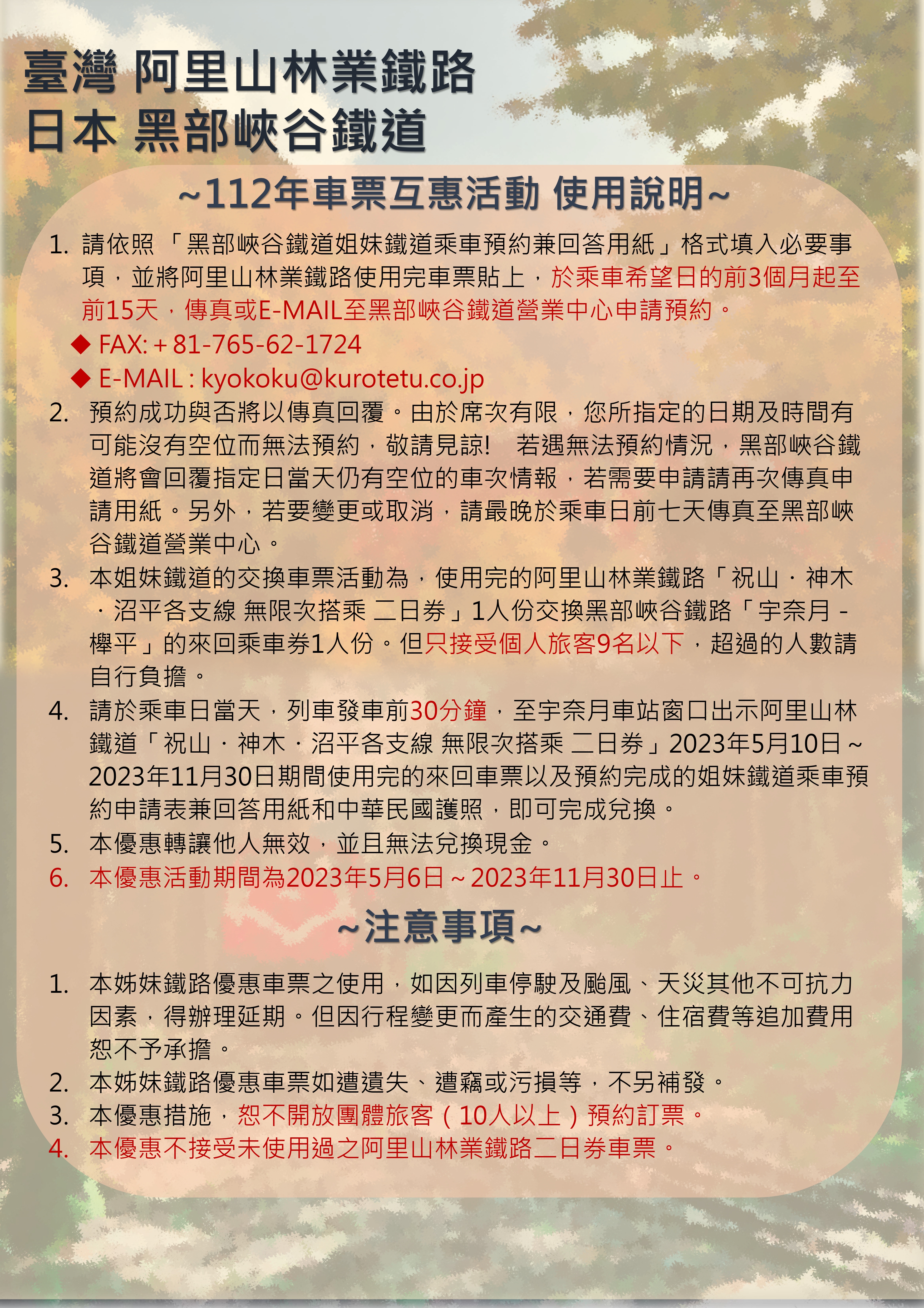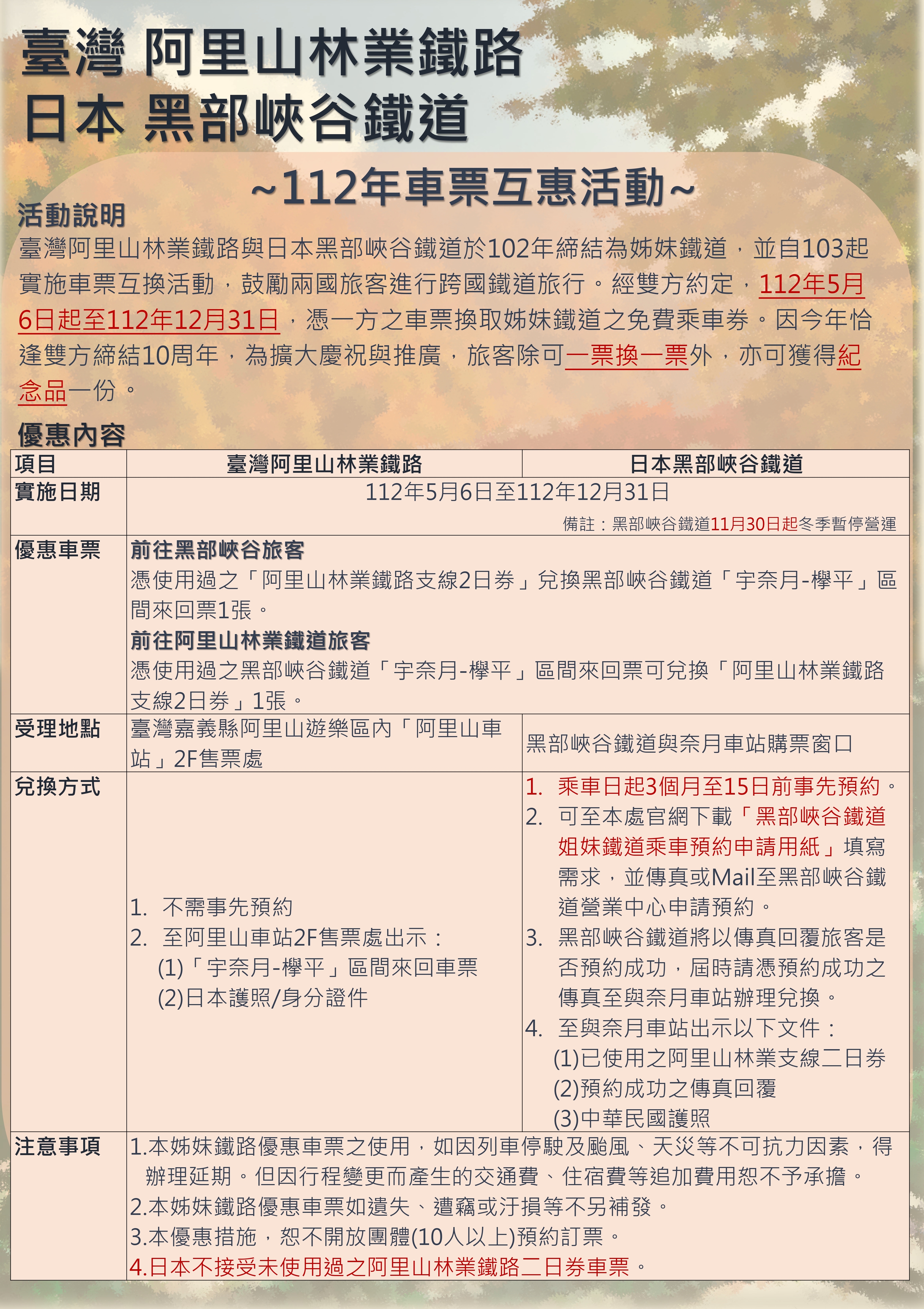 阿里山林業鐵路及文化資產管理處(簡稱林鐵及文資處)與黑部峽谷鐵道車票互換活動將於今(112)年5月6日開跑。民眾可持今年使用過之阿里山林業鐵路支線二日券,於乘車日前15日至3個月間向黑部峽谷鐵道以MAIL或傳真申請,即可兌換黑部峽谷鐵道「宇奈月-櫸平」來回票,或持使用過之黑部峽谷鐵道「宇奈月-櫸平」來回票至阿里山車站兌換阿里山林業鐵路支線二日券。 一票換一票,搭林鐵換乘黑鐵還有紀念小禮物 阿里山林鐵與黑鐵的票券互惠活動自103年起開始實施,109年因疫情而中斷,隨著疫情解封,為鼓勵兩國旅客進行跨國鐵道旅行,經雙方重新約定,自112年5月6日起,可憑一方之車票換取姊妹鐵道之免費乘車券。林鐵及文資處處長黃妙修表示,阿里山林業鐵道與日本黑部峽谷鐵道於102年締結為姊妹鐵道,今年剛好邁入第10年!為擴大慶祝與推廣,旅客除可一票換一票外,黑鐵也特別加碼,換票旅客還可額外獲得黑鐵特製之小禮物:毛巾、A4資料夾、筆記本三擇一。 黑部峽谷特色攤位於嘉義製材所動力室內開展 為擴大推廣阿里山及黑部峽谷鐵道締結10周年,阿里山林鐵與黑鐵不僅約定,互相交換特色物品及海報文宣摺頁,更於雙方營運場地內佈置推廣專區,以表示雙方之締結友好及友誼長存。阿里山林鐵特色展位於宇奈月車站,黑鐵特色展則位於嘉義製材所動力室內,現場除有黑部峽谷鐵道製作之鐵道相關之文創商品外,亦有黑部峽谷鐵道沿線風光相片集及導覽摺頁可供民眾自由瀏覽,展覽期間至今(112)年6月6日止。開展期間,民眾可持黑部峽谷鐵道(不限年份、區間)至製材所動力室兌換精美小禮物一份。 黑部峽谷因冬季下雪影響列車行駛,故每年12月封山並於隔年4月、5月雪融後開山。今年黑部峽谷鐵道已於4月20日開山,5月6日起全線恢復營運,有興趣前往日本富山縣黑部峽谷民眾可把握此項跨國互惠方案,把握機會多多運用。詳細資訊及預約方式可至林鐵及文資處官網最新消息處查詢及下載。 林鐵及文資處官網:https://afrch.forest.gov.tw/all-news 林鐵及文資處臉書:https://www.facebook.com/AlishanForestRailway.Taiwan