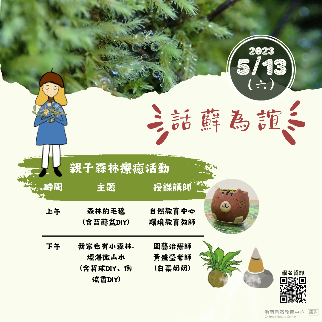 花蓮林區管理處池南自然教育中心5月13日(六)於池南國家森林遊樂區舉辦「話蘚為誼」療癒活動,歡迎幼稚園大班以上親子報名,親手DIY苔蘚盆、苔球與倒流香,把大自然打包帶回家,打造居家綠美學生活。 林管處積極推動森林療癒,鼓勵民眾親近山林,感受森林惠益,傳遞森林生態系多元服務價值。由自然教育中心環境教育教師及台灣園藝輔助治療協會秘書長黃盛瑩,帶領大小朋友運用苔蘚、石頭、樹枝等素材,DIY小巧可愛的苔蘚盆或苔球、捏製香錐煙瀑(倒流香)等,感受擁抱大自然的樂趣。 4月28日9點起開放線上報名,名額40人,額滿為止,費用為699元,含講師費、材料費、餐費與課程費用,交通須自理,活動另有多元價格方案,詳見報名網頁。 請上台灣山林悠遊網池南自然教育中心頁面線上報名,首次使用報名系統者,須先註冊為會員。相關活動資訊可掃QR碼,或查詢池南自然教育中心臉書粉絲團,亦可電詢中心教育推廣組(03)864-1594#15。 台灣山林悠遊網池南自然教育中心活動網址:https://tinyurl.com/nhjt6rct