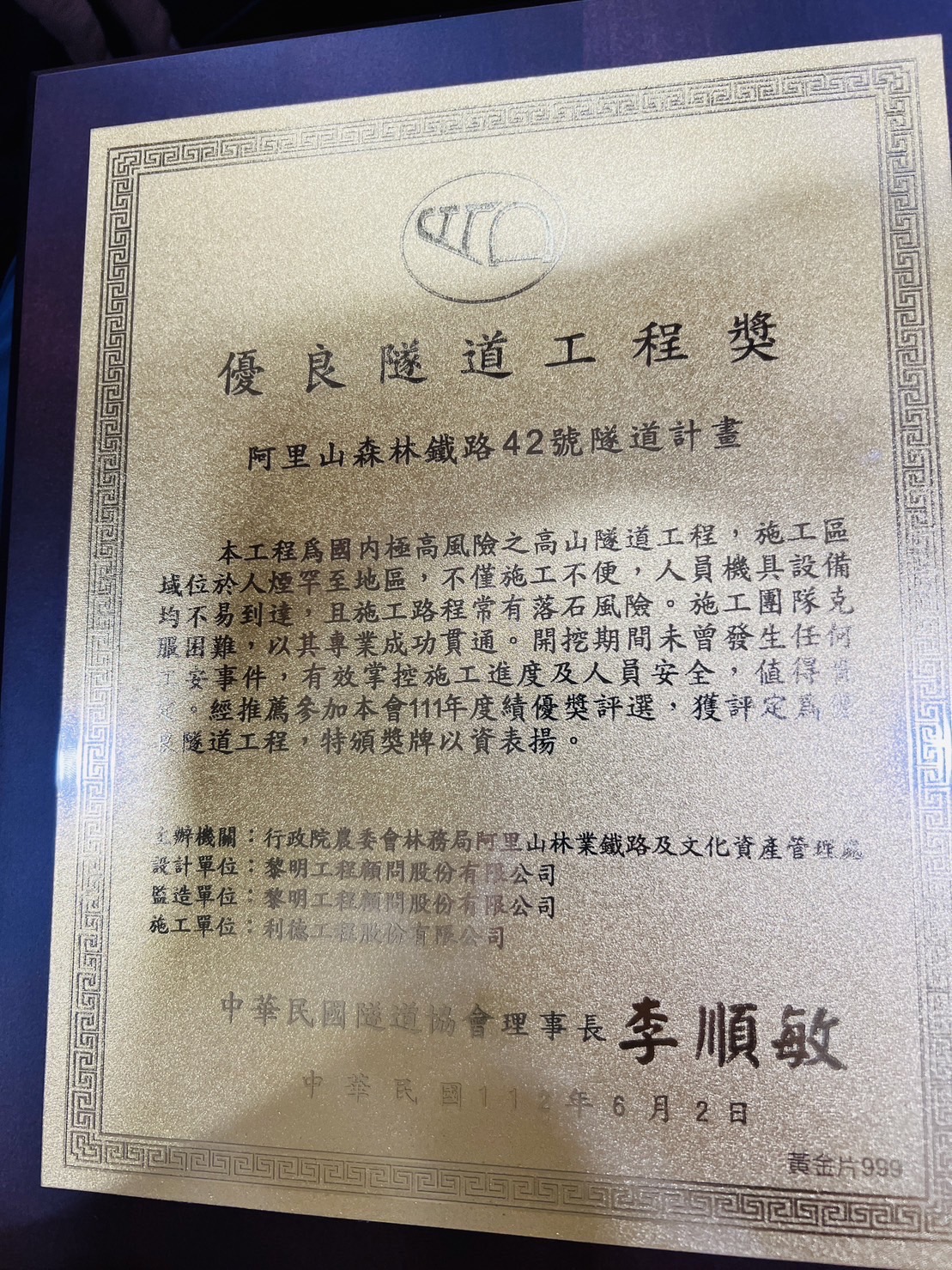 林務局阿里山林業鐵路及文化資產管理處參與中華民國隧道協會本年度優良隧道工程評選,經眾多工程報名參賽,僅8件入圍複評。新建42號隧道工程有別於其它入圍之公路、捷運、水利隧道工程,位於二萬平偏遠山區,克服工區腹地狹小,施工困難及保存既有隧道洞口,展現維護文化資產等特色,獲選「優良隧道工程獎」,於今(2)日頒獎表揚。 新洞接舊洞 兼顧環境保護與文化保存 新建42號隧道設計採尊重自然生態與環境永續之減法工程,終點銜接既有43號隧道口,減少洞口開挖;施工期間克服偏遠山區無通達道路,以鐵道運輸機具和材料,不新闢施工便道,達到最小地貌擾動、兼顧安全及自然景觀還原等多重目標。 保存既有42號隧道原貌,工程竣工後,將以不定期舉辦主題列車方式進行文資景點導覽與解說,作為歷史文化及環境教育場所。 今年底竣工 明年中全線通車 新建42隧道全長1,106公尺,經地質鑽探及地電阻探測等詳細調查,路線選定座落堅硬岩層,且最深覆土厚度達154公尺,提昇行車安全。隧道斷面加舖防水膜,隧道底部設置PVC管排水,防止隧道內滲水,增加隧道穩定性。工程自107年歷經完成環境影響評估、水土保持計畫、文資審議程序,並取得阿里山鄉鄒族部落同意,自110年1月8日正式動工,111年12月29日終於貫通隧道。今年陸續進行隧道防水膜舖設及隧道壁體混凝土澆置,預訂今年11月中旬竣工,工程完工後接續軌道鋪設作業,預計明年中全線通車。
